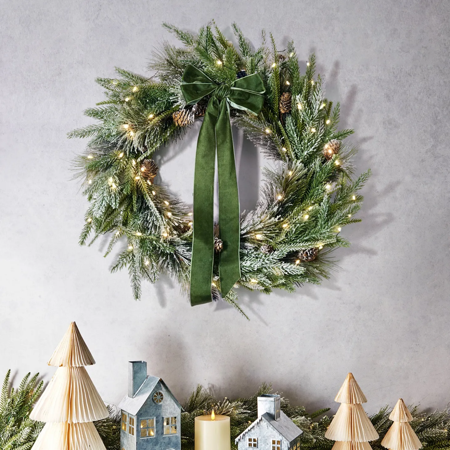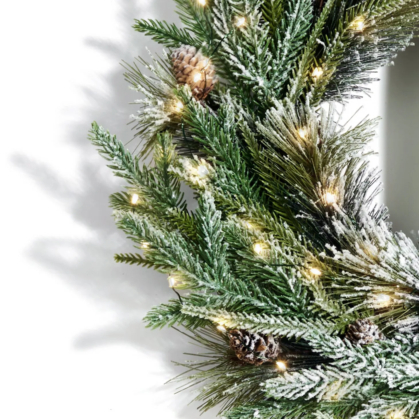 • One 22″ wreath of lush artificial pine, spruce, and real mini pinecones, dusted with faux snow, and pre-lit with warm LED fairy lights