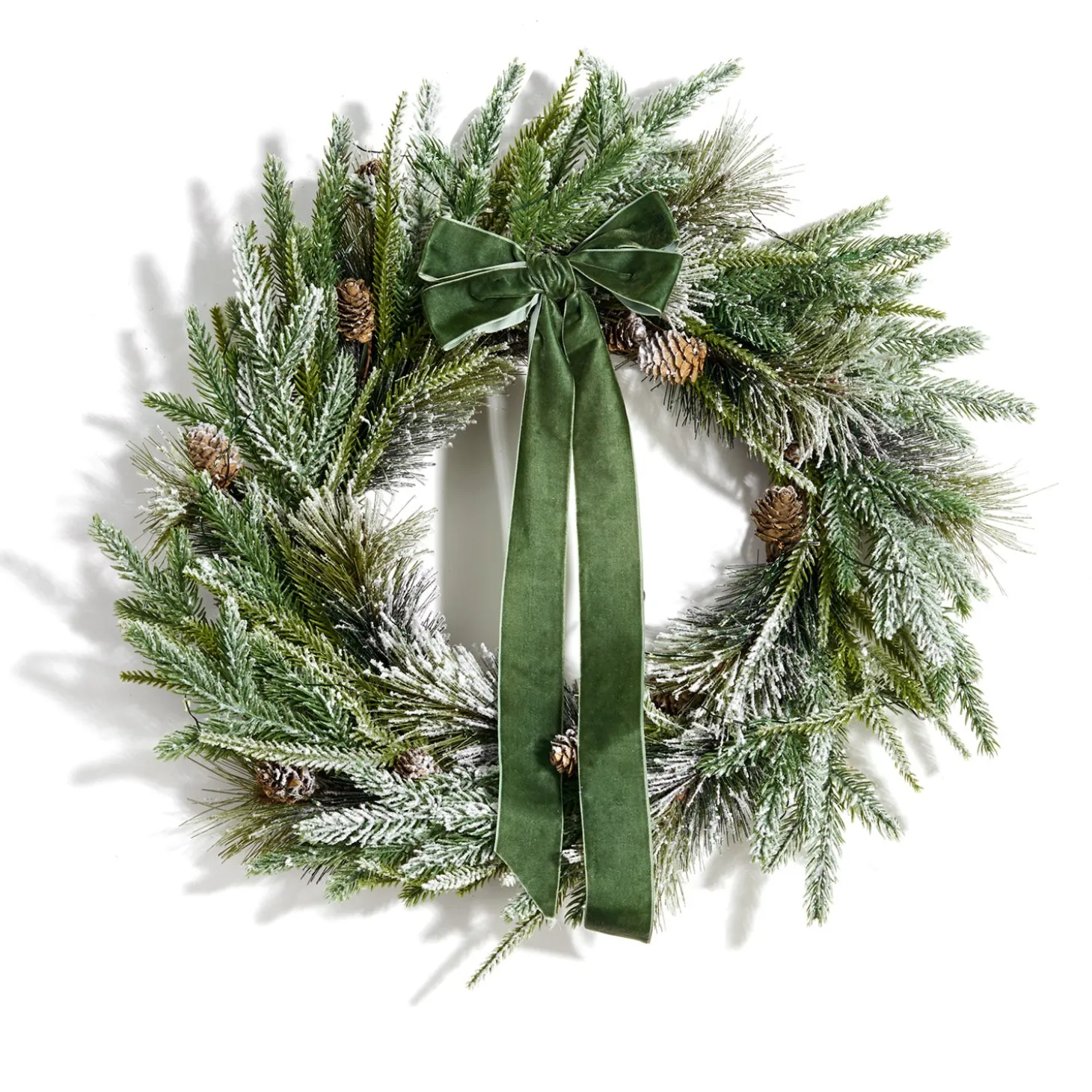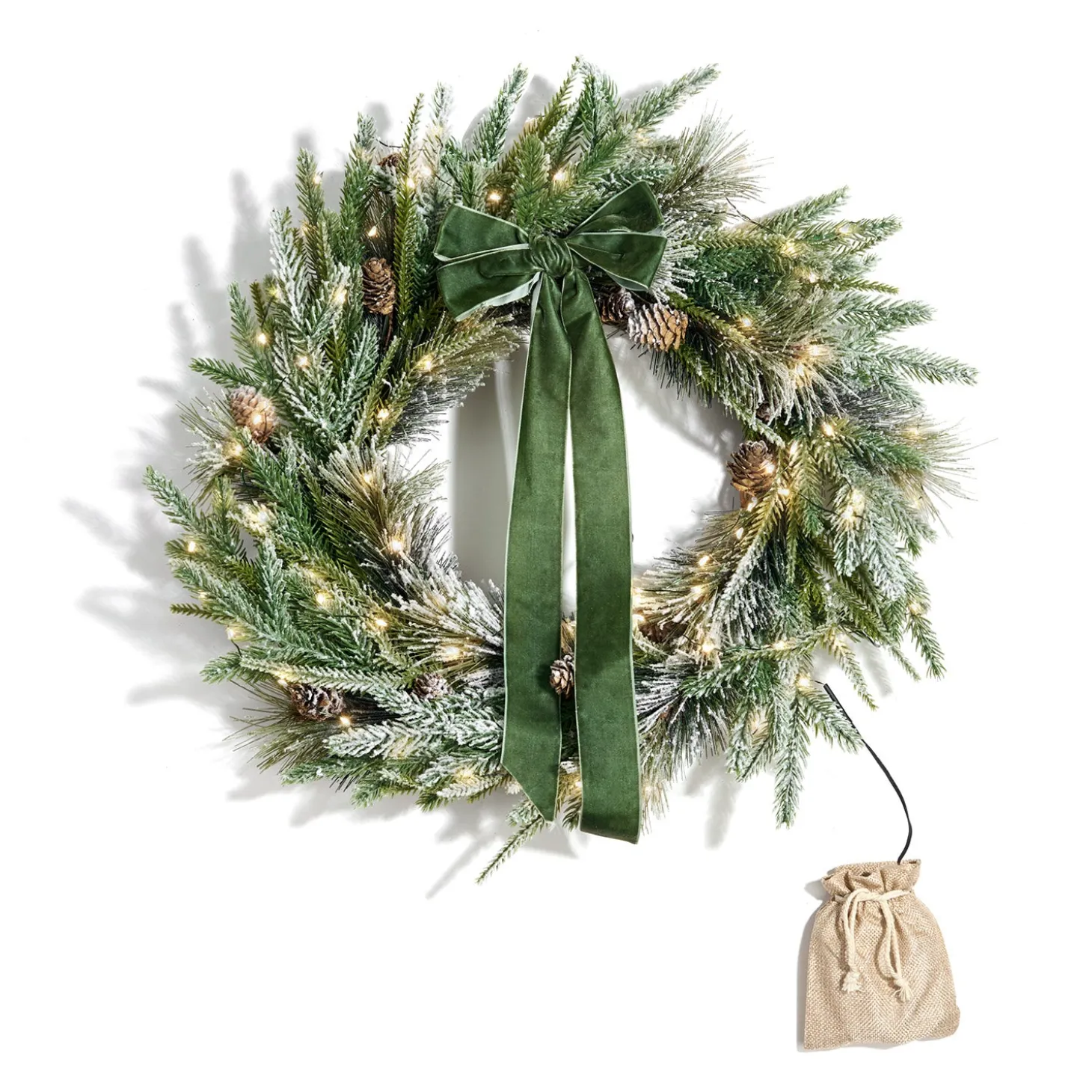 Welcome the winter season into your home with our Cypress Winter Wreath. This elegant faux pine wreath is pre-lit with 100 LED lights to add a warm, festive glow wherever you place it. Twenty-two inches in diameter, this cheerful wreath is generously filled out with flocks of wintery spruce and pine branches, real mini pinecones, and dusted in realistic faux snow. Includes a beautiful, removable dark green velvet ribbon pre-tied in a bow. A natural burlap bag conceals the battery box, which includes a convenient 6-hour timer. Hang this seasonal wreath above a mantel, on a door, or in any room for an instant winter transformation. Pairs perfectly with our Cypress Winter Garland and Swag, sold separately.