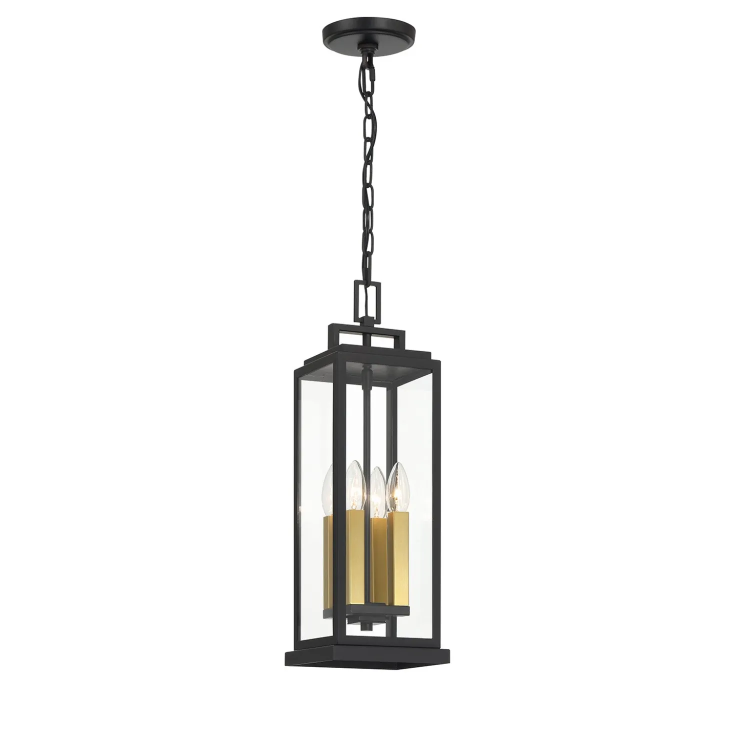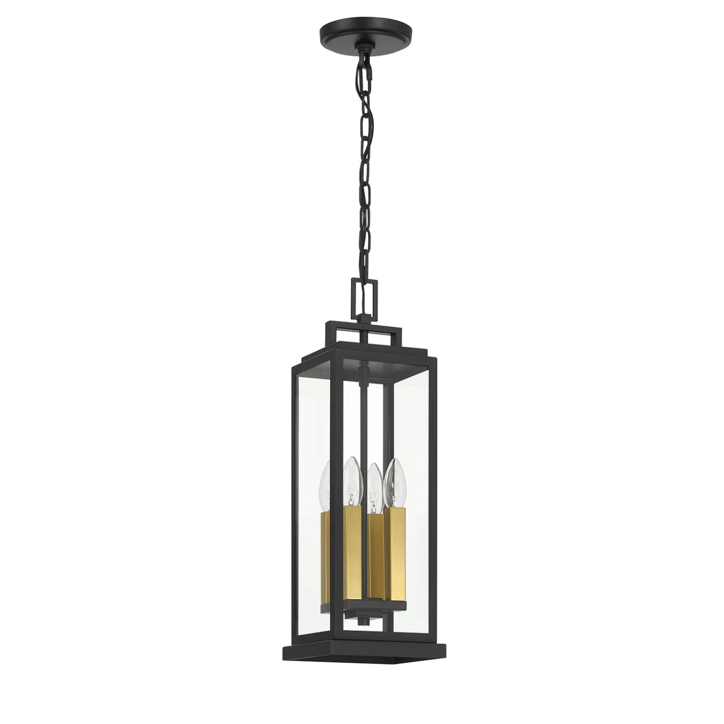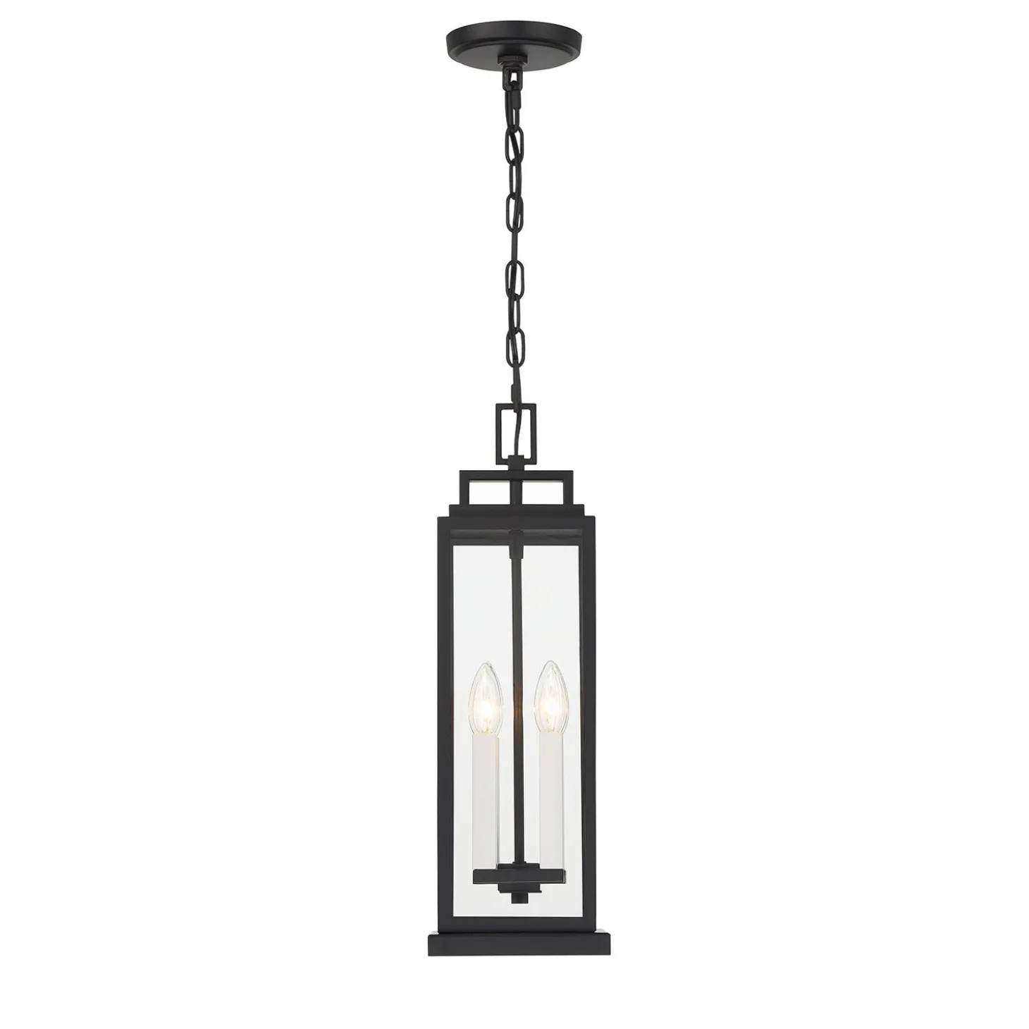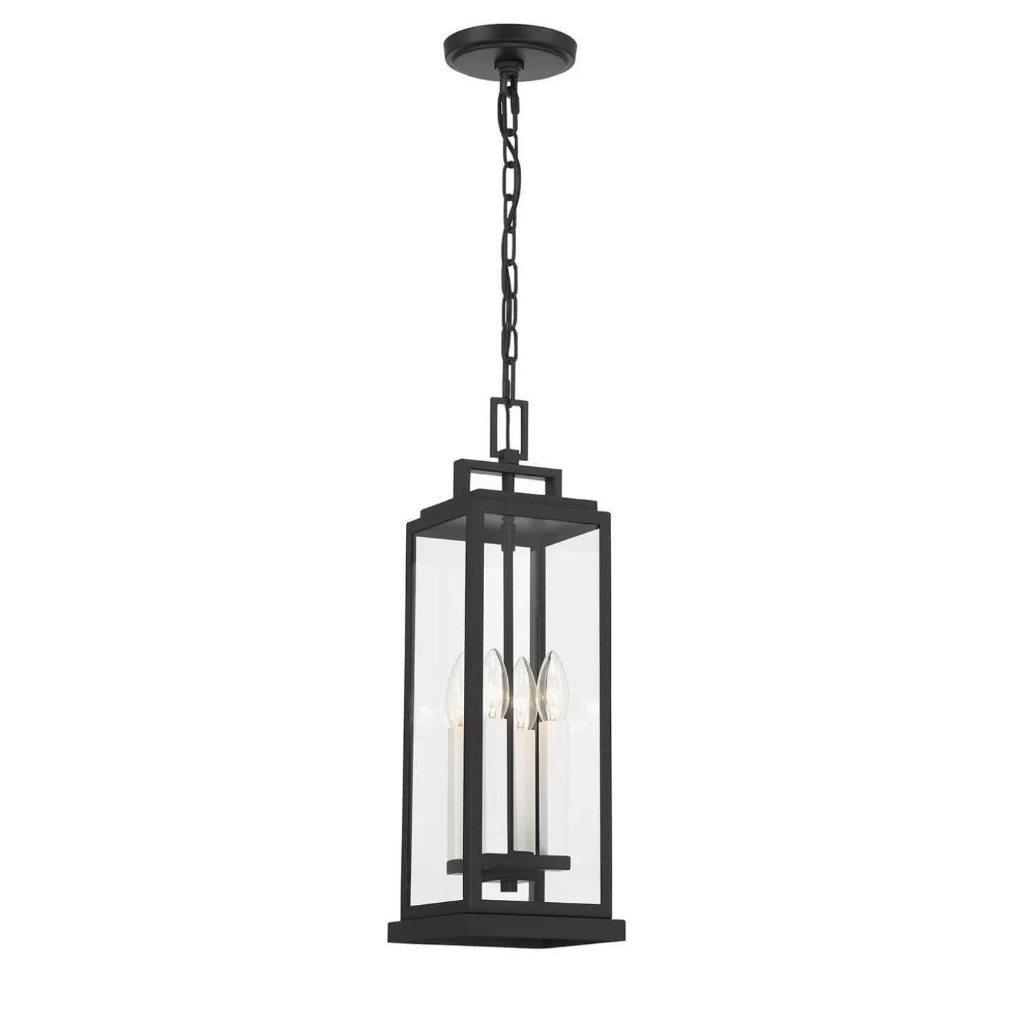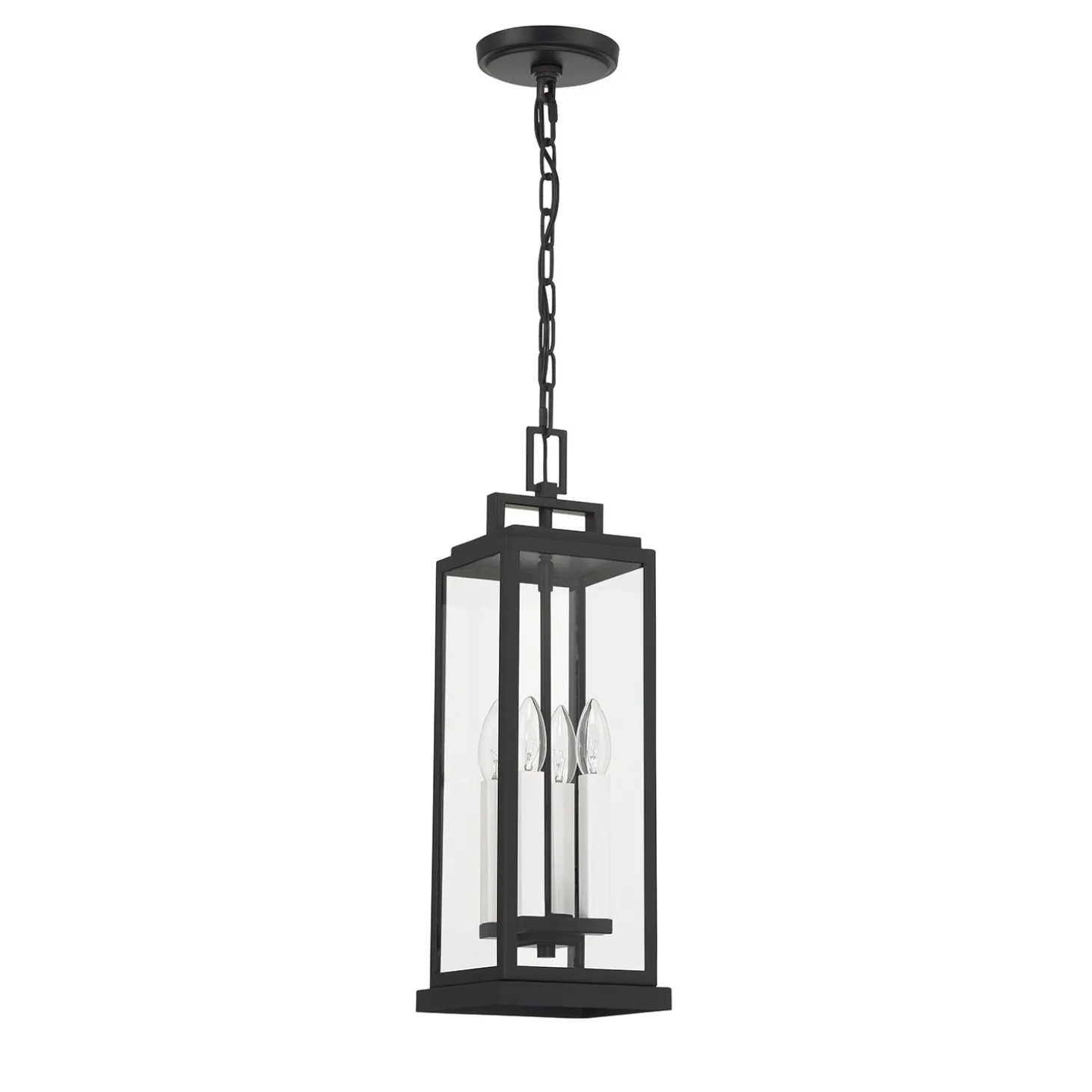 The Easton Outdoor Hanging Light features a sleek architectural design with a Matte Black finish. Clear glass panels surround four light bulbs, creating a clean, modern aesthetic for your home’s exterior. This elegant pendant measures 20.5″ tall and 6.5″ wide, making it perfect for covered porches, entryways with high ceilings, or outdoor living spaces. The stepped crown detail adds subtle visual interest to the contemporary silhouette. The included 72″ chain allows for versatile installation heights, while the weather-resistant, wet-rated construction ensures this fixture will withstand the elements while adding sophisticated style to your outdoor living space.