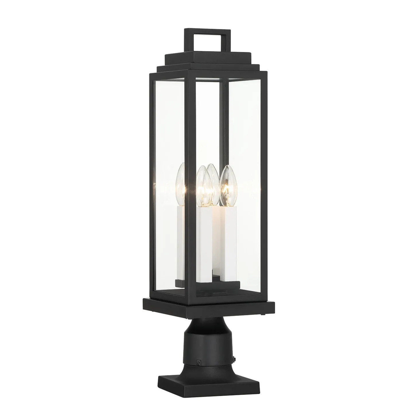 The Easton Outdoor Post Light features a sleek architectural design with a Matte Black finish. Clear glass panels surround four light sources, creating a clean and modern aesthetic for your home’s exterior. This elegant fixture measures 22″ tall and 6.5″ wide, making it perfect for illuminating driveways, walkways, or garden areas. The stepped crown detail adds subtle visual interest to the contemporary silhouette. Weather-resistant and wet-rated for outdoor use, the Easton combines elegant style with durable construction to enhance your landscape lighting design.
