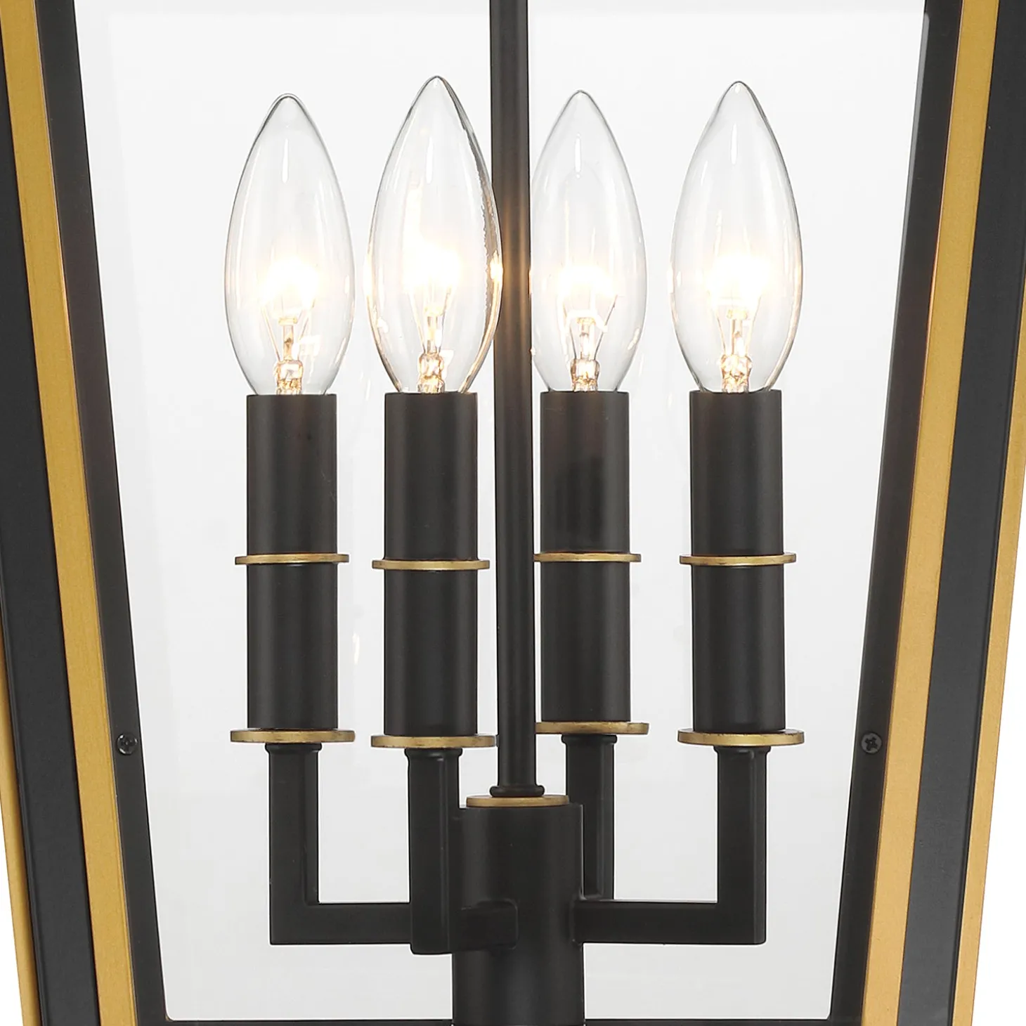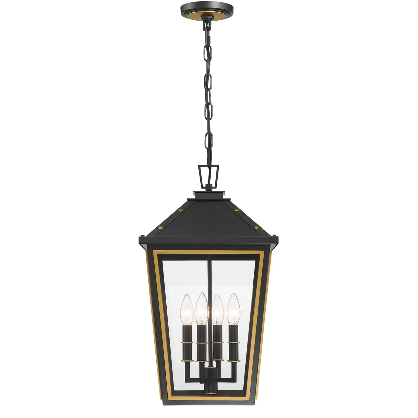 The Ellington Outdoor Hanging Light features a classic lantern design with a Black finish and Textured Gold accents. Clear glass panels surround four candelabra bulbs, creating a welcoming glow for your home’s exterior. This elegant outdoor pendant measures 21.5″ tall and 12″ wide, making it perfect for covered porches, pergolas, or entryways with high ceilings. The traditional silhouette is enhanced with decorative gold rivets and frame details for a modern twist on a timeless style. The included 72″ chain allows for versatile installation heights, while the weather-resistant, wet-rated construction ensures this fixture will withstand the elements. Add sophisticated style to your outdoor living space with this hanging light.