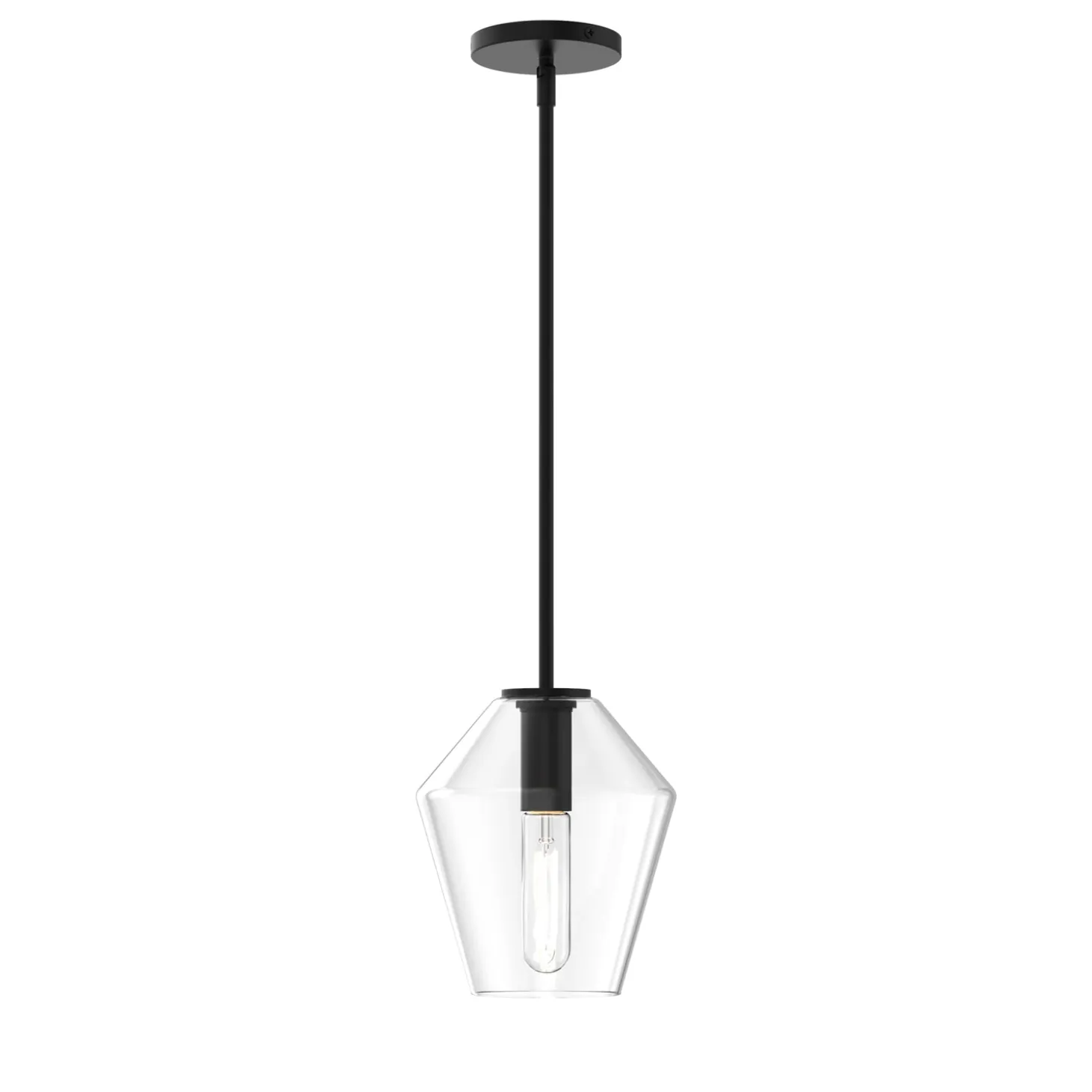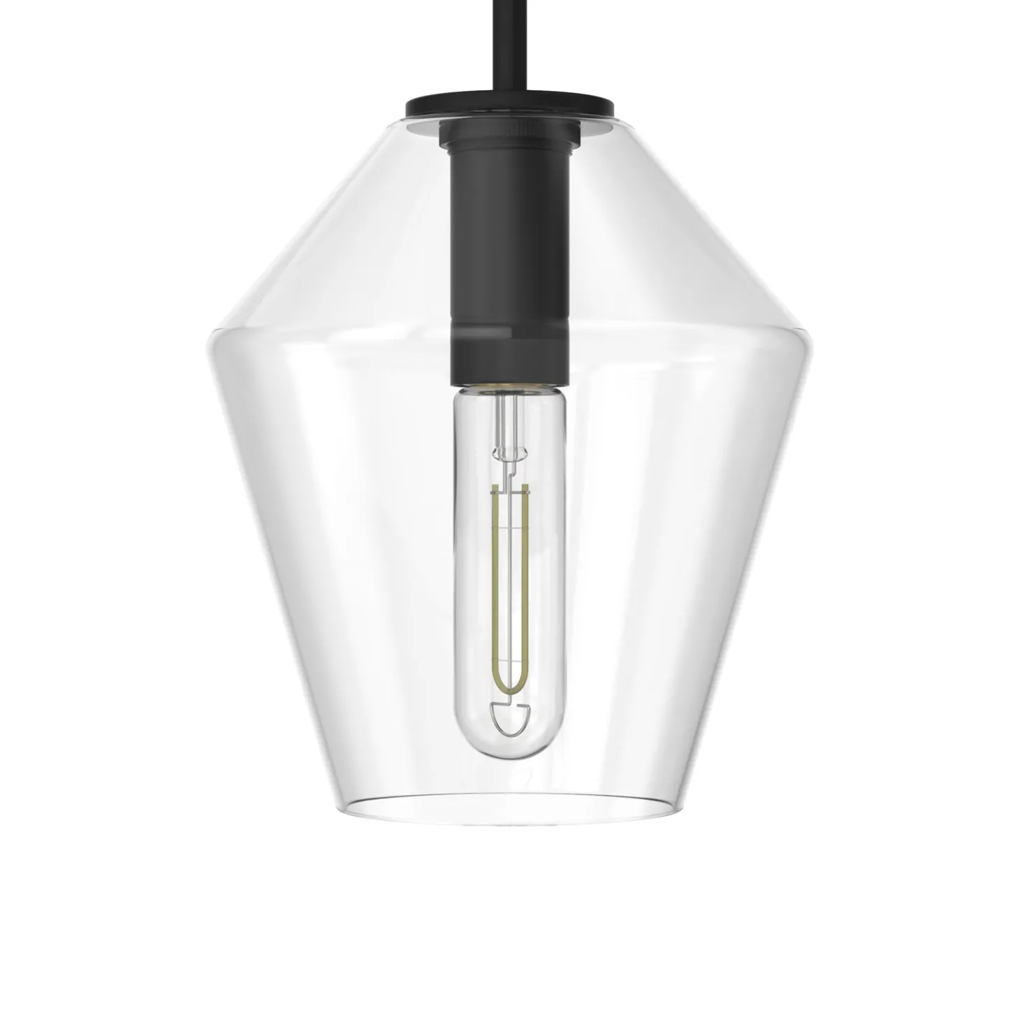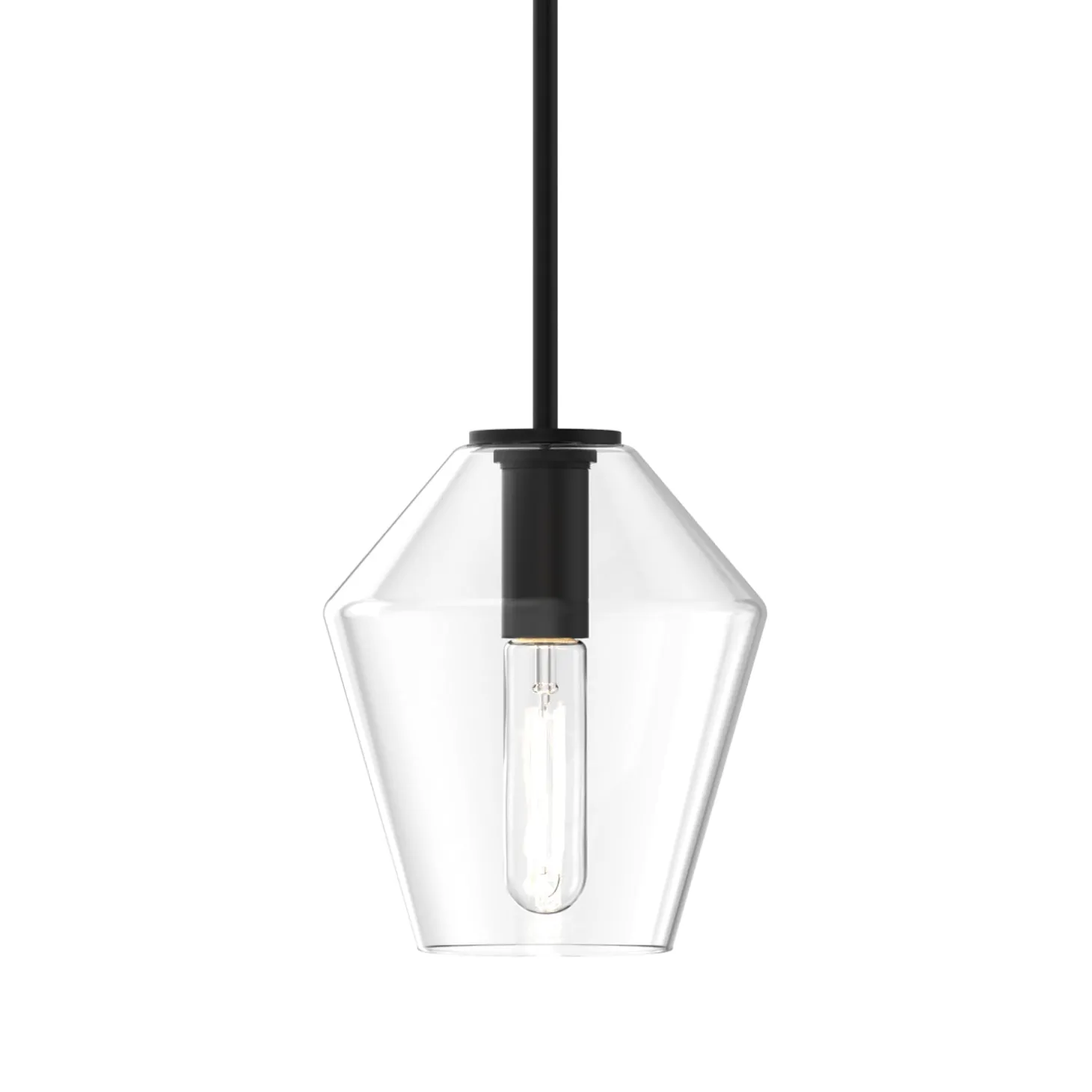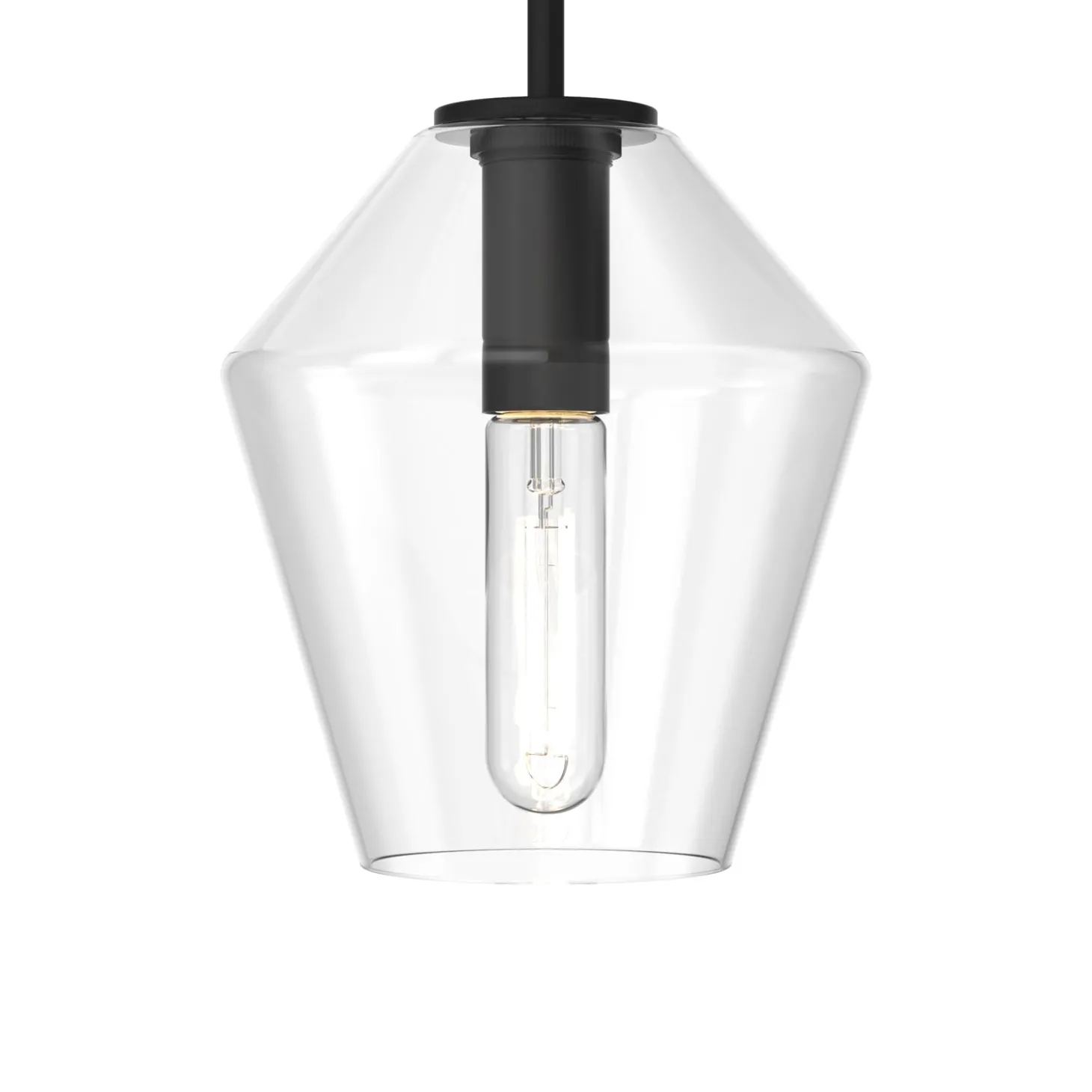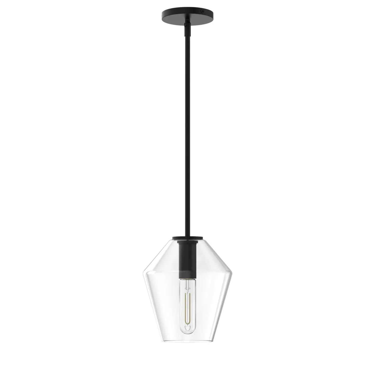 The Eva 9″ Clear Diamond Pendant Light is a beautiful, modern interpretation of the classic pendant ceiling light. Features a daring, gem-shaped shade in crystal clear glass surrounding a smooth metal socket and suspended by adjustable down rods and a circular canopy- all in a sharp matte black finish. This updated fixture pairs superior materials with exceptional style, for a look that is both timeless and chic. Ideal in hallways with standard or tall ceilings, above a small table, or grouped up over a kitchen island. The Eva 9″ pendant in matte black is also damp-rated and can be used in covered outdoor settings, like a front porch or veranda.