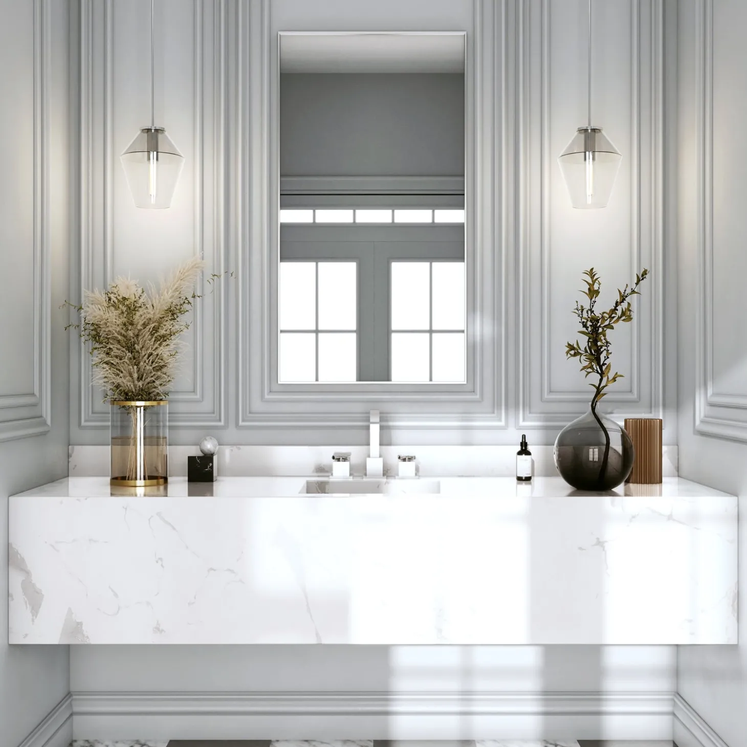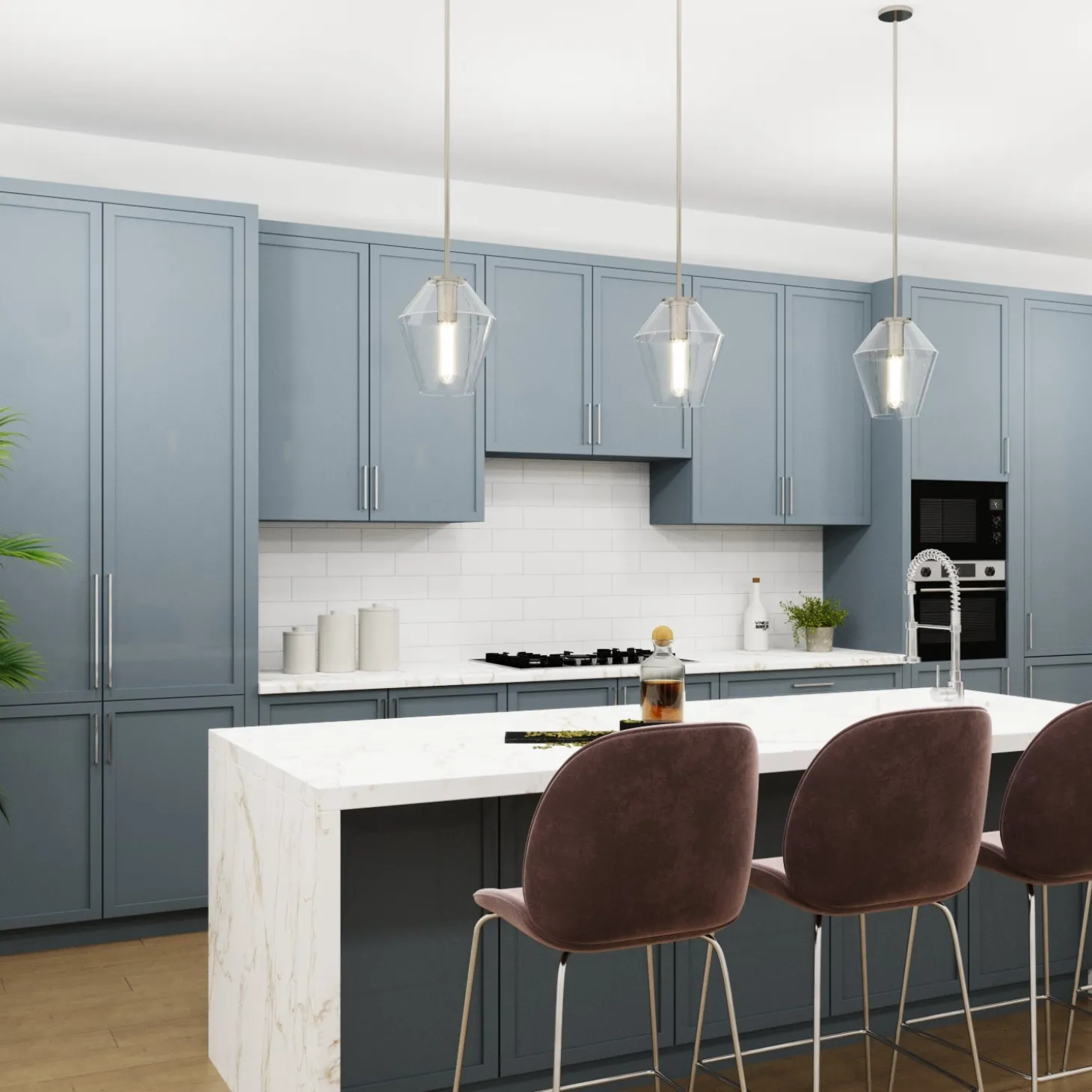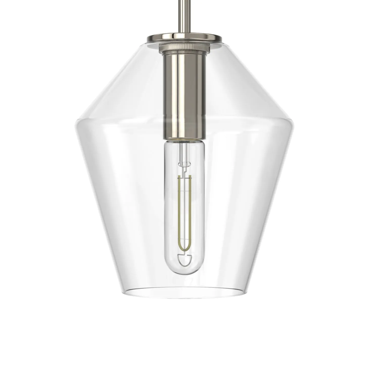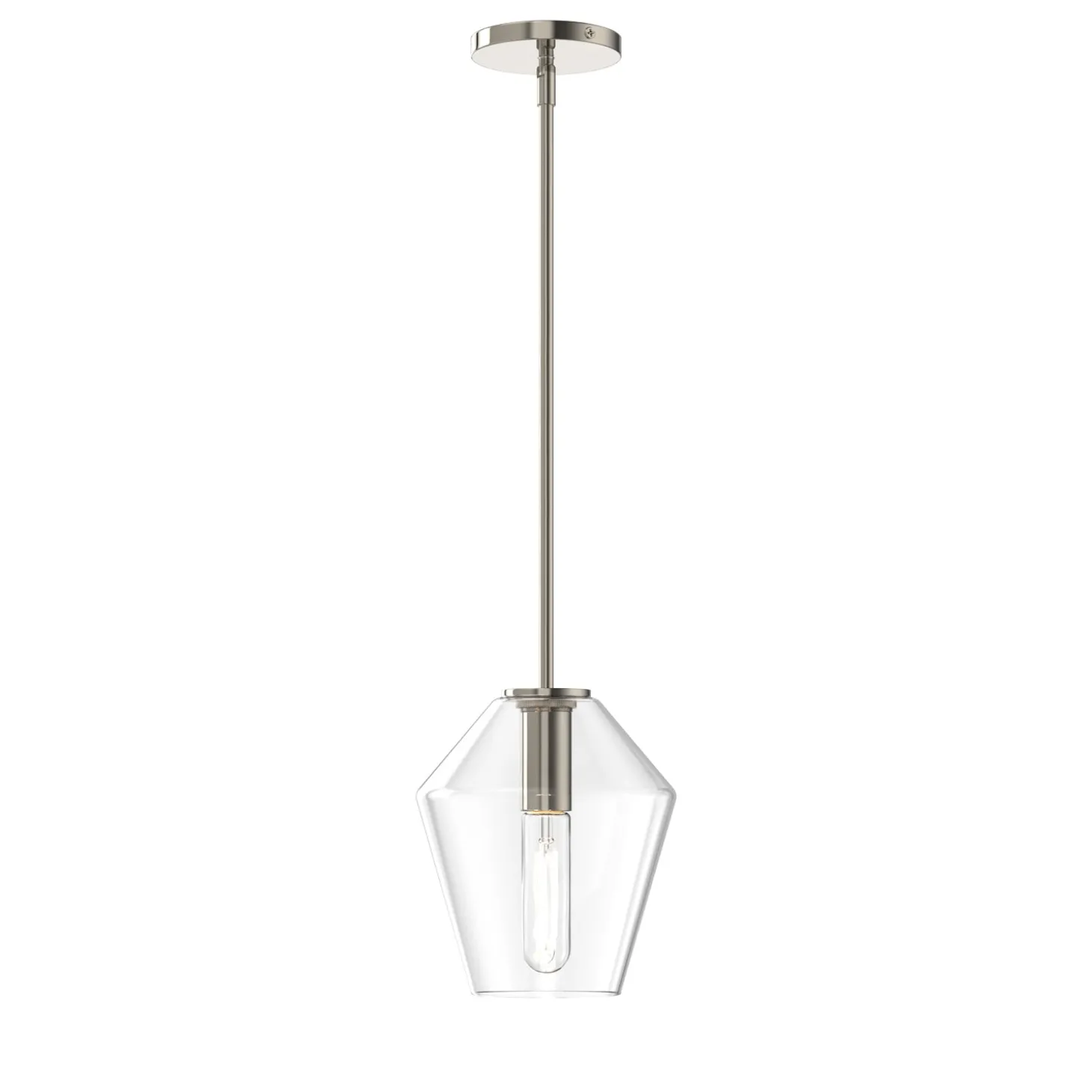 The Eva 9″ Clear Diamond Pendant Light is a beautiful, modern interpretation of the classic pendant ceiling light. Features a daring, gem-shaped shade in crystal clear glass surrounding a smooth metal socket and suspended by adjustable down rods and a circular canopy- all in a gleaming polished nickel finish. This updated fixture pairs superior materials with exceptional style, for a look that is both timeless and chic. Ideal in hallways with standard or tall ceilings, above a small table, or paired up over a kitchen island.