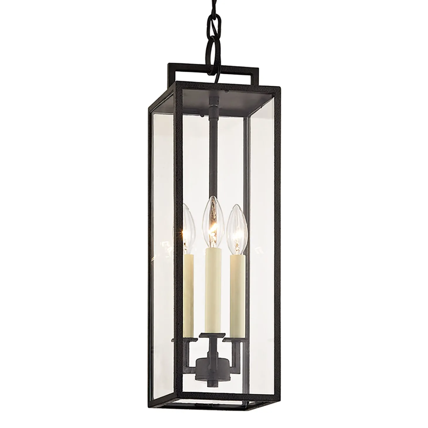The Everett Outdoor Hanging Light brings classic design and modern durability to your exterior spaces. Crafted from durable forged iron, with clear glass side panels, this damp-rated fixture is built to withstand the elements and provides reliable illumination year-round. The outdoor pendant features three candelabra sockets with cream-colored candle sleeves, and an open bottom. With its clean, minimalist silhouette, it adds a touch of elegance to porches, patios, or entryways. Designed for both style and functionality, this hanging light enhances the ambiance of your outdoor space, offering timeless appeal and dependable lighting that will shine through all seasons.
