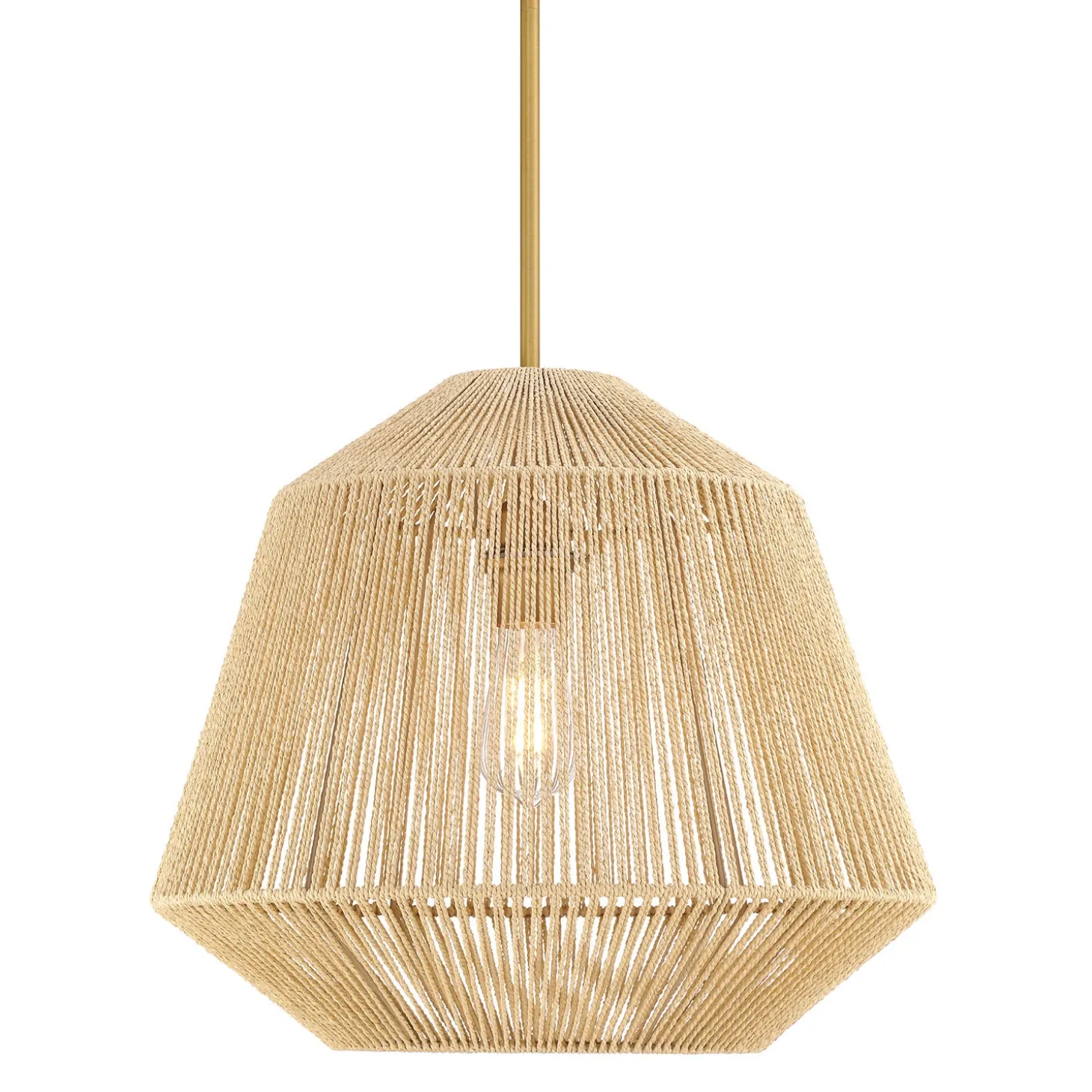• Features a stylish, hanging pendant light comprised of a natural jute shade, with aged brass downrods and canopy