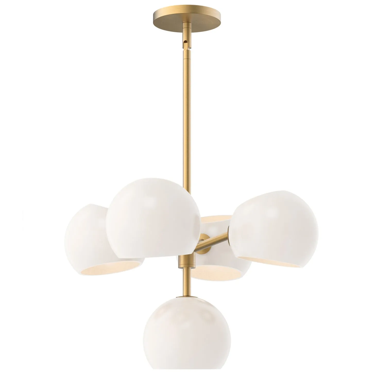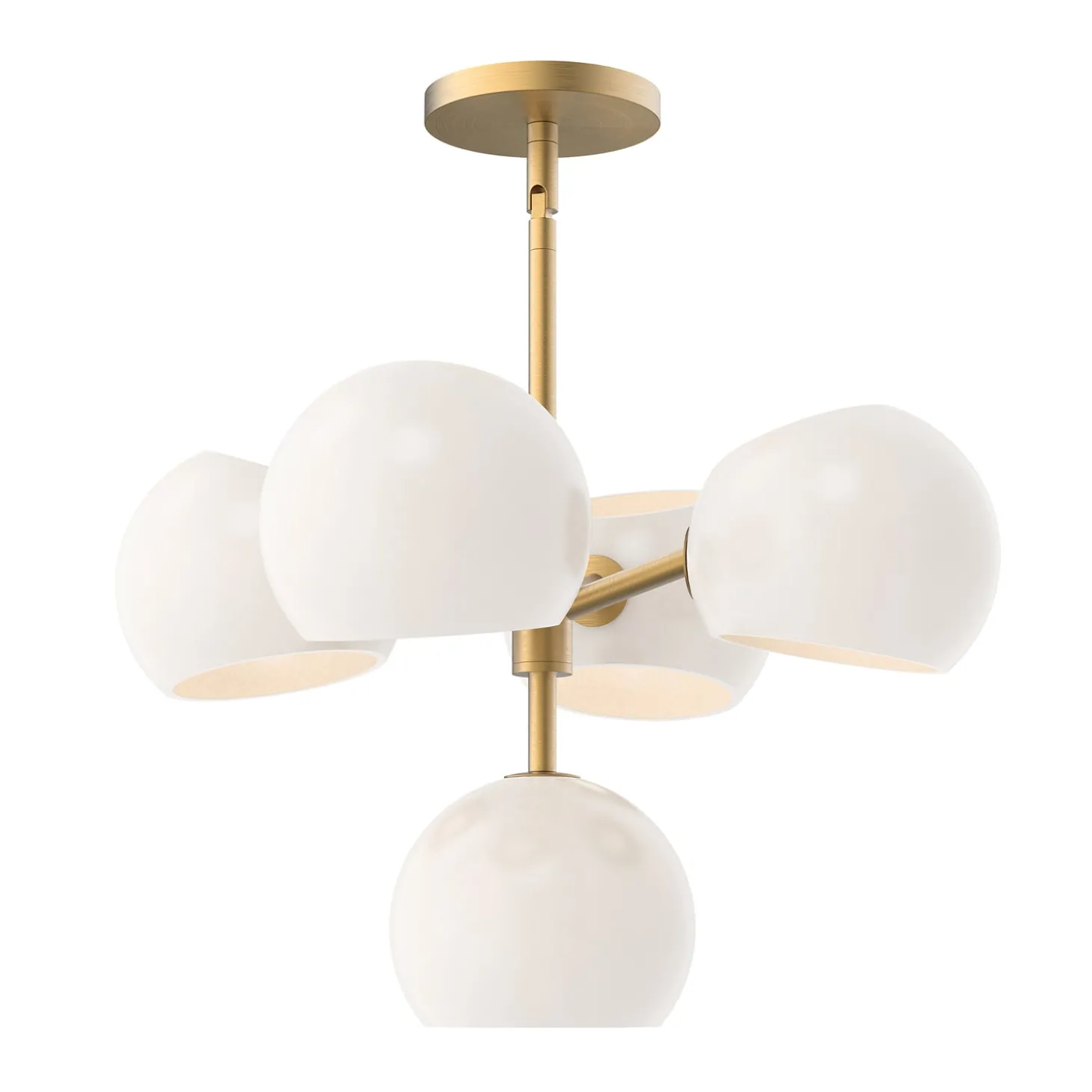 • Features five opal glass globes arranged in a dynamic multi-level design around a brushed brass frame