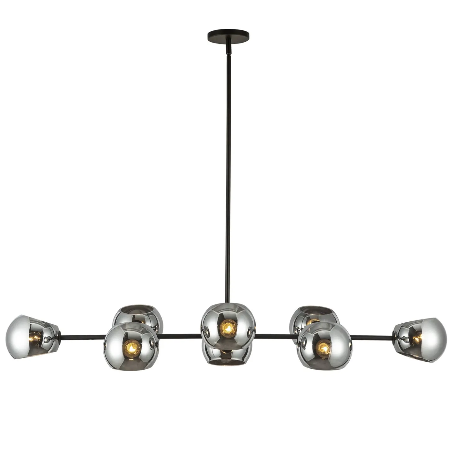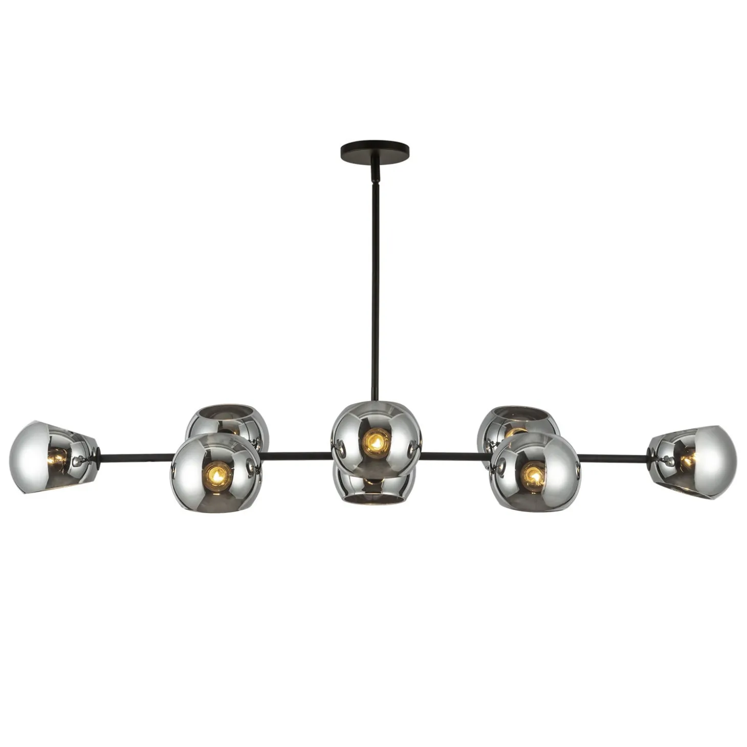 The Flynn 8 Light Linear Pendant showcases an elongated architectural design that creates a stunning visual impact. This expansive fixture features eight smoke glass orbs arranged in a linear formation along a sleek matte black horizontal bar. Each translucent gray globe houses a partially visible bulb, providing subtle, omnidirectional illumination with a moody aesthetic. With an impressive 48-inch length, this mid-century-inspired pendant is perfectly proportioned for long dining tables, kitchen islands, or conference spaces. The clean lines and balanced composition maintain a sense of visual lightness despite its substantial size, blending contemporary elegance with functional artistry.