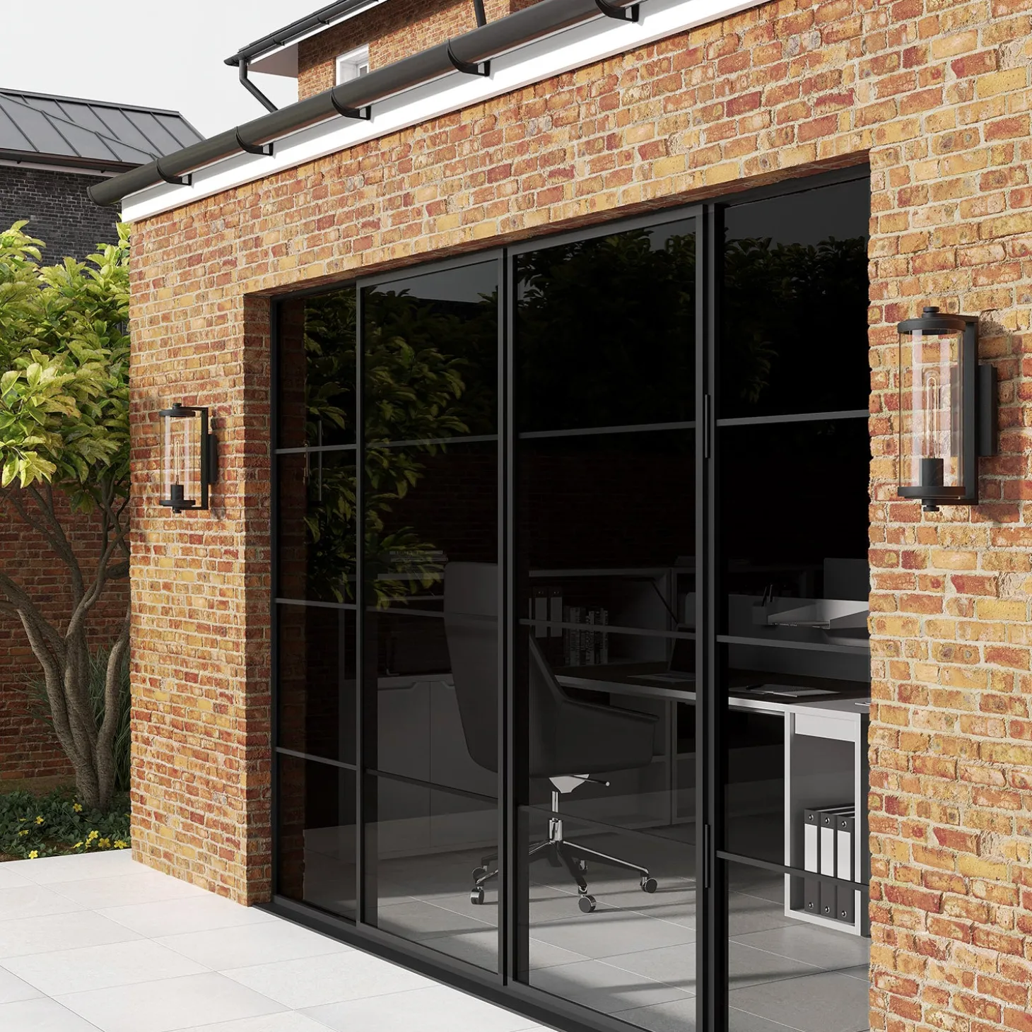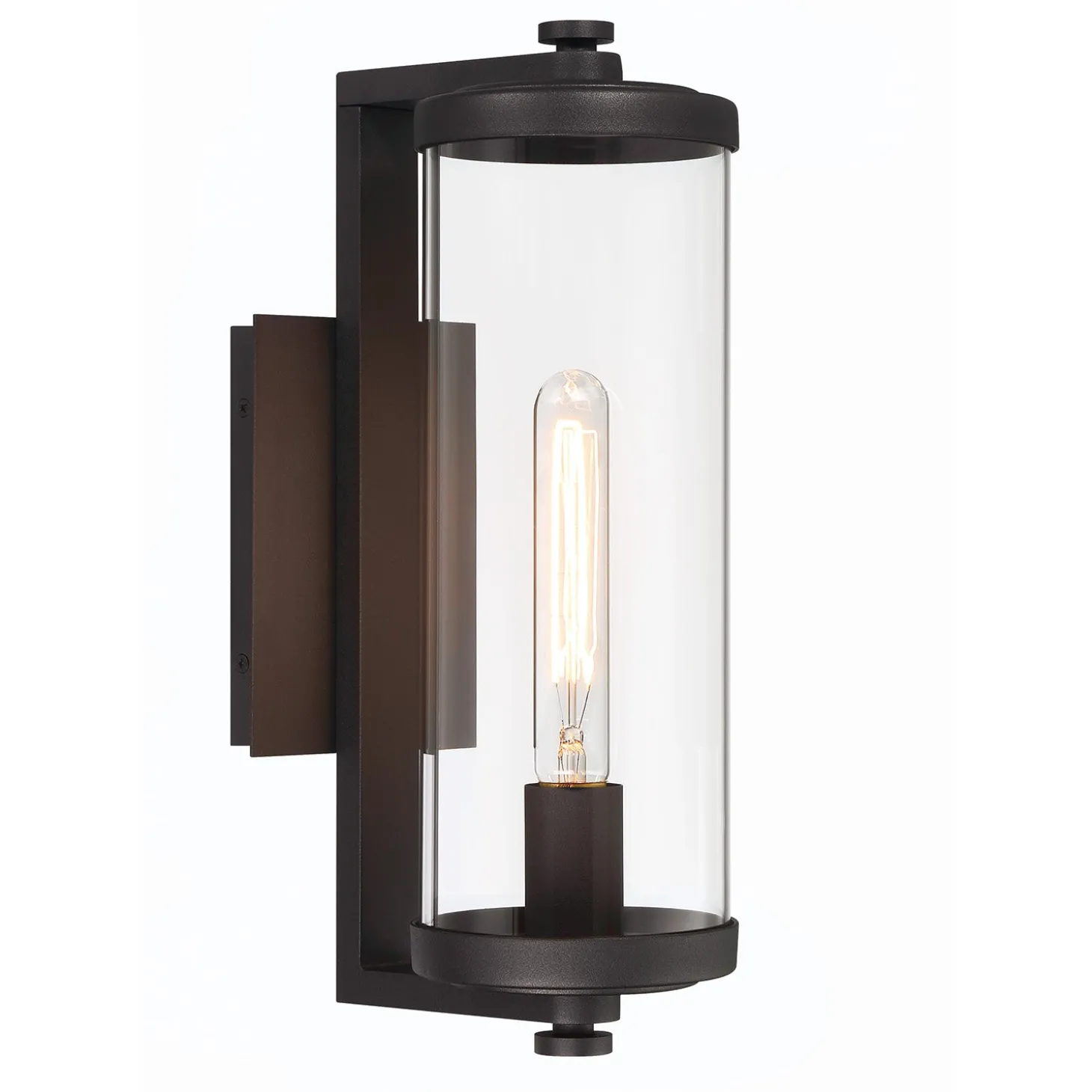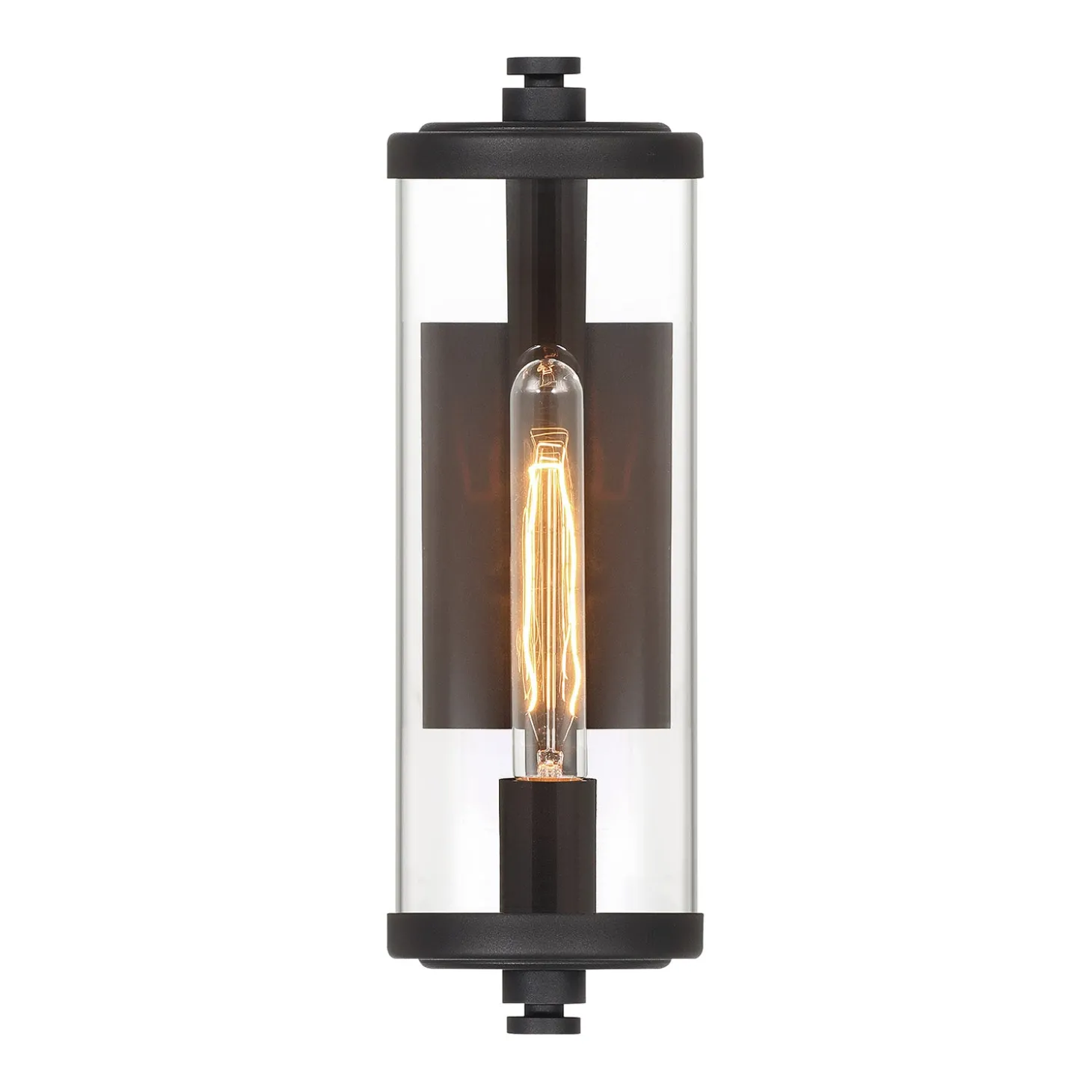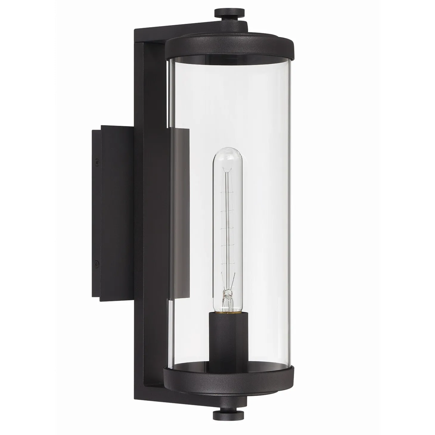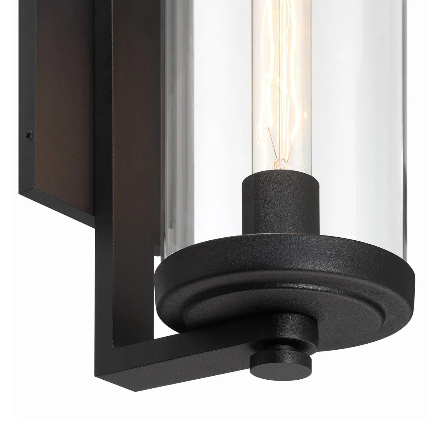 • Outdoor wall-mounted fixture features a single bulb set in a tall cylindrical clear glass surround and metal frame finished in a subtly-textured matte black