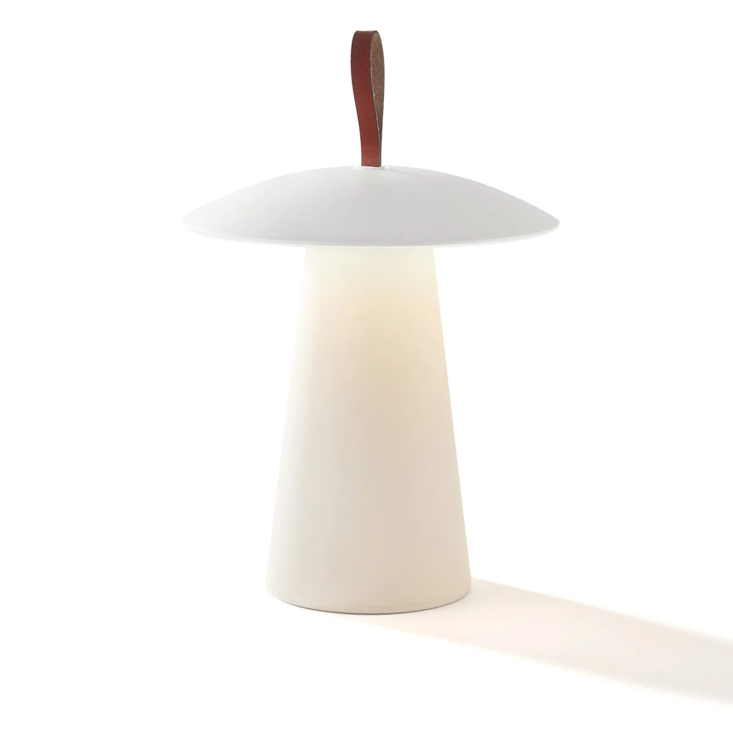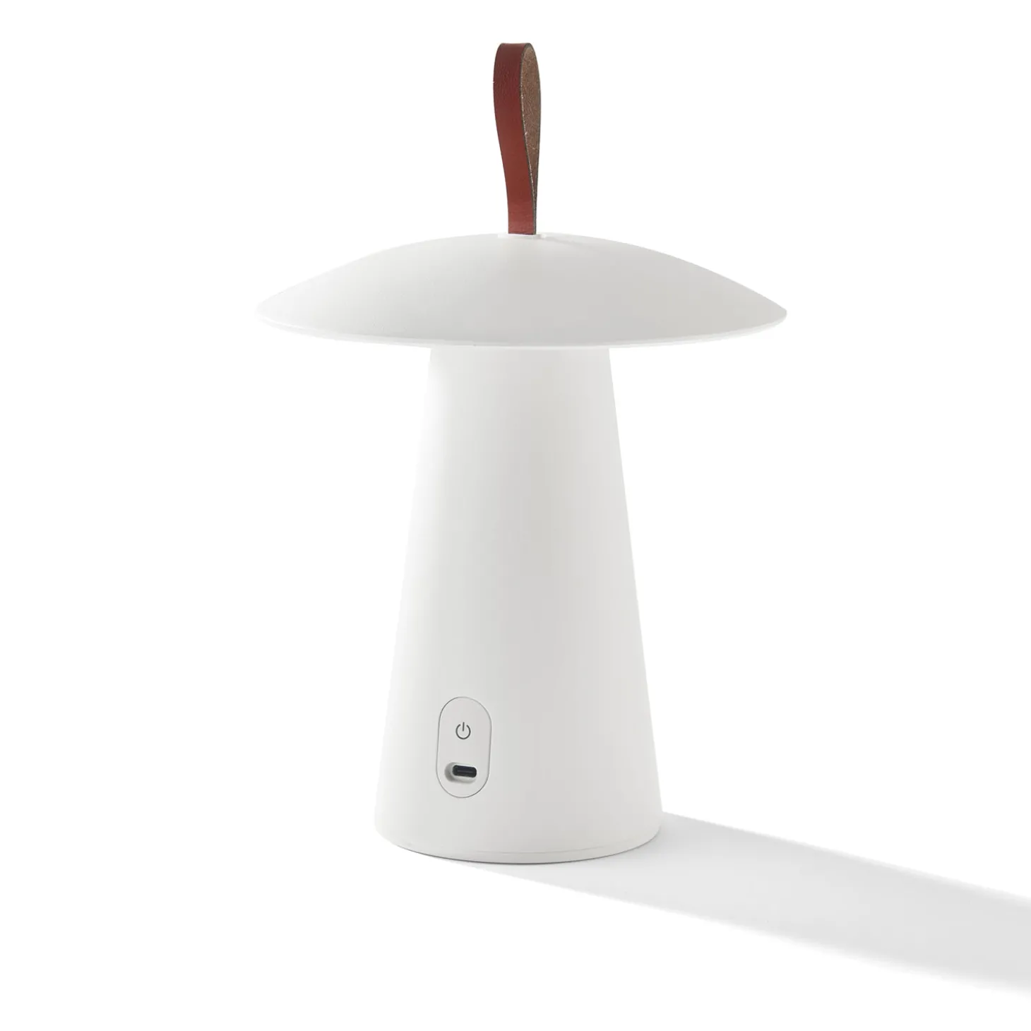 • This modern 11.5″ tall portable table lamp has a powder-coated matte white finish, brown leather top handle, and an integrated LED light