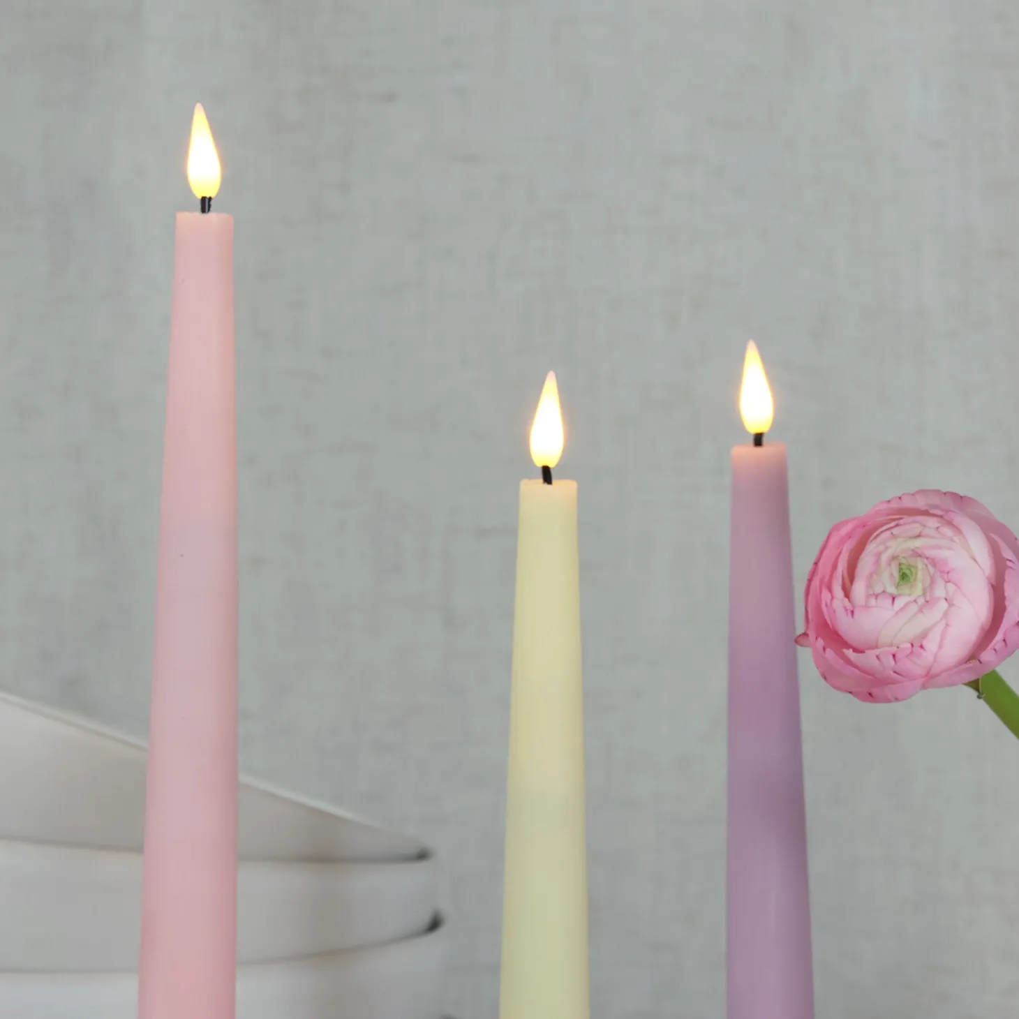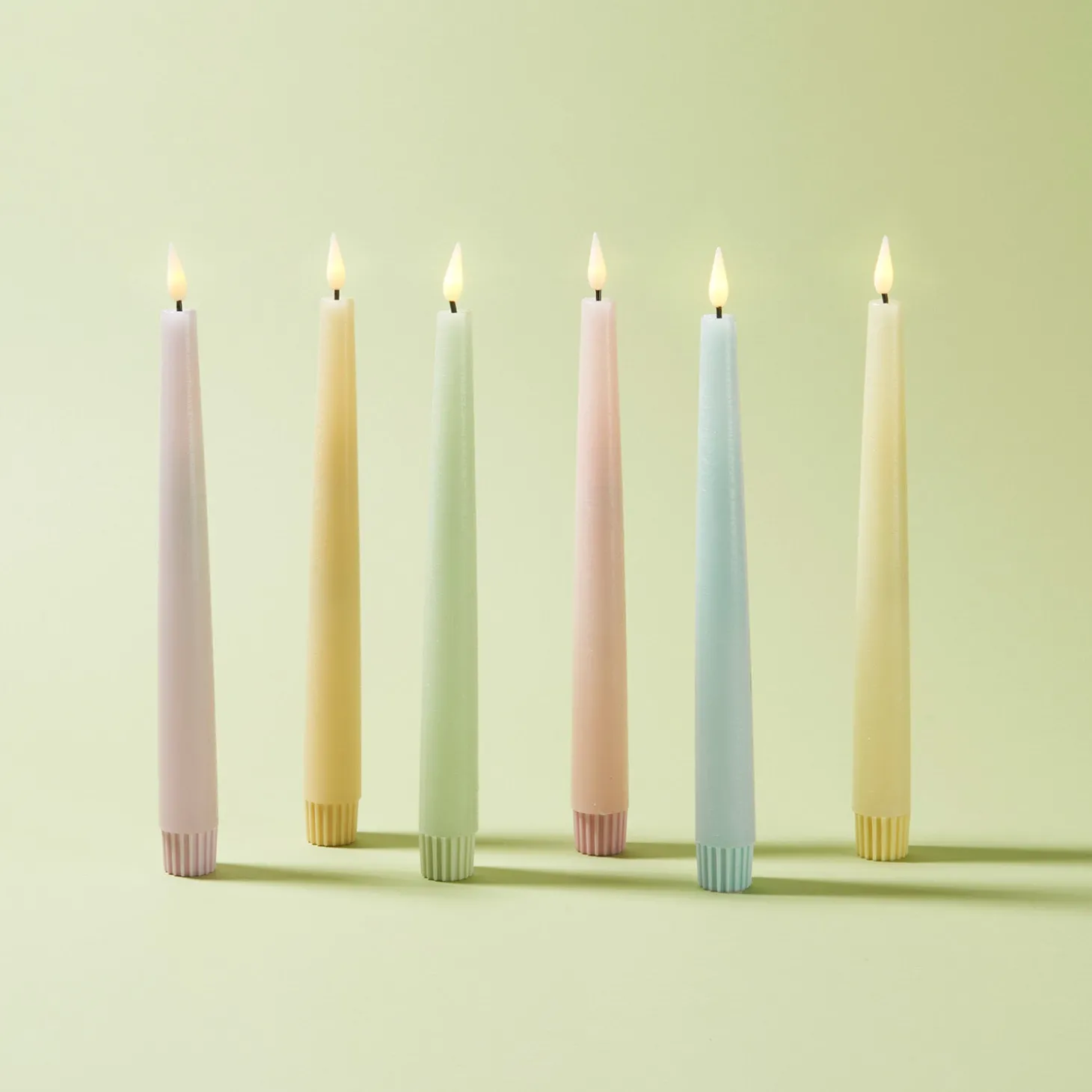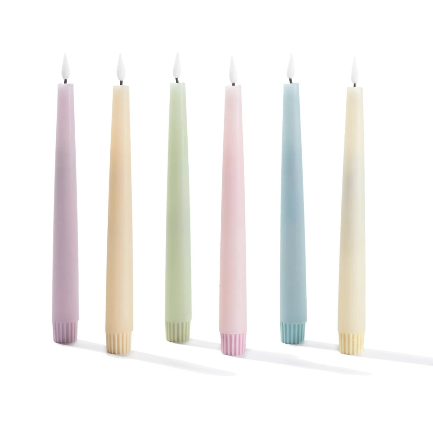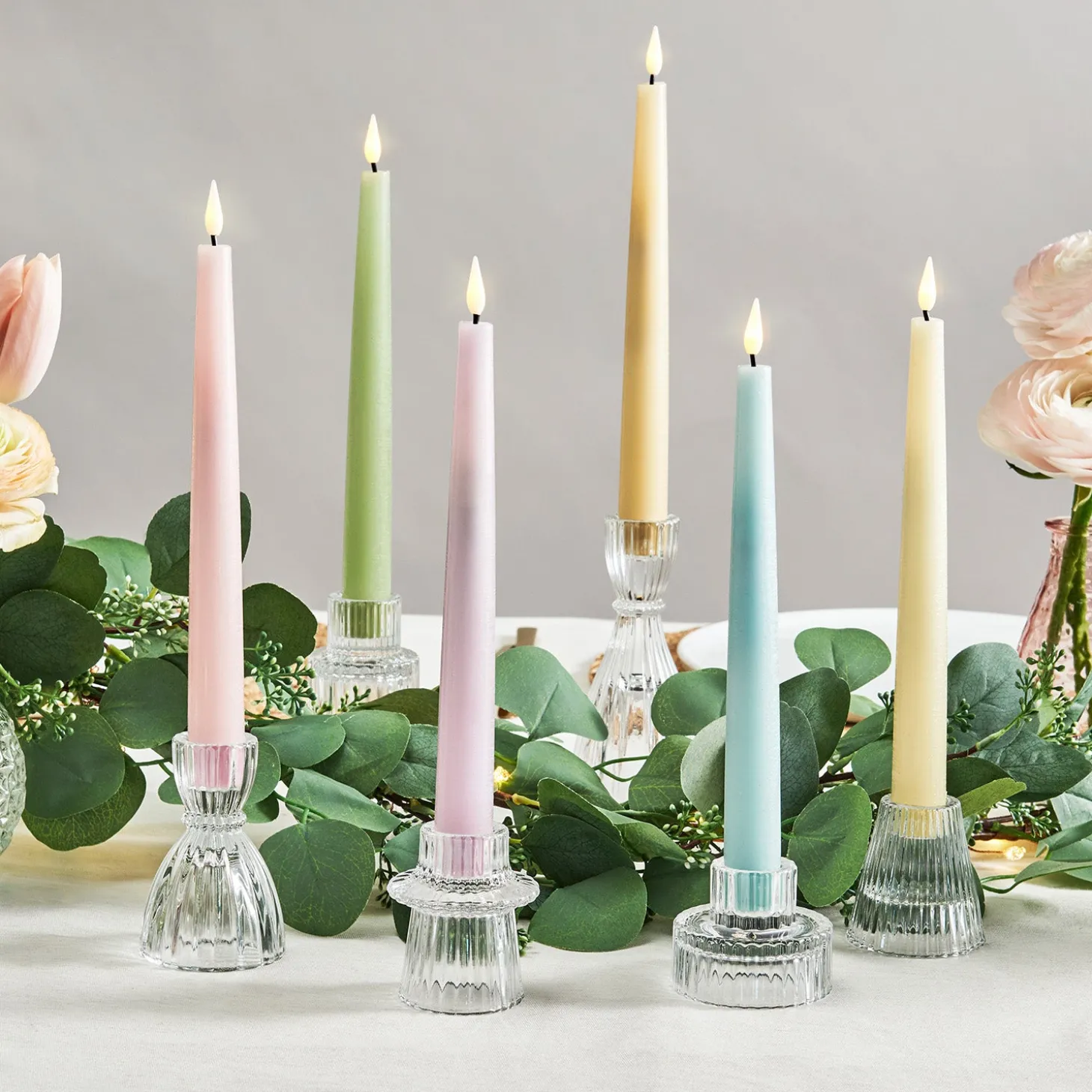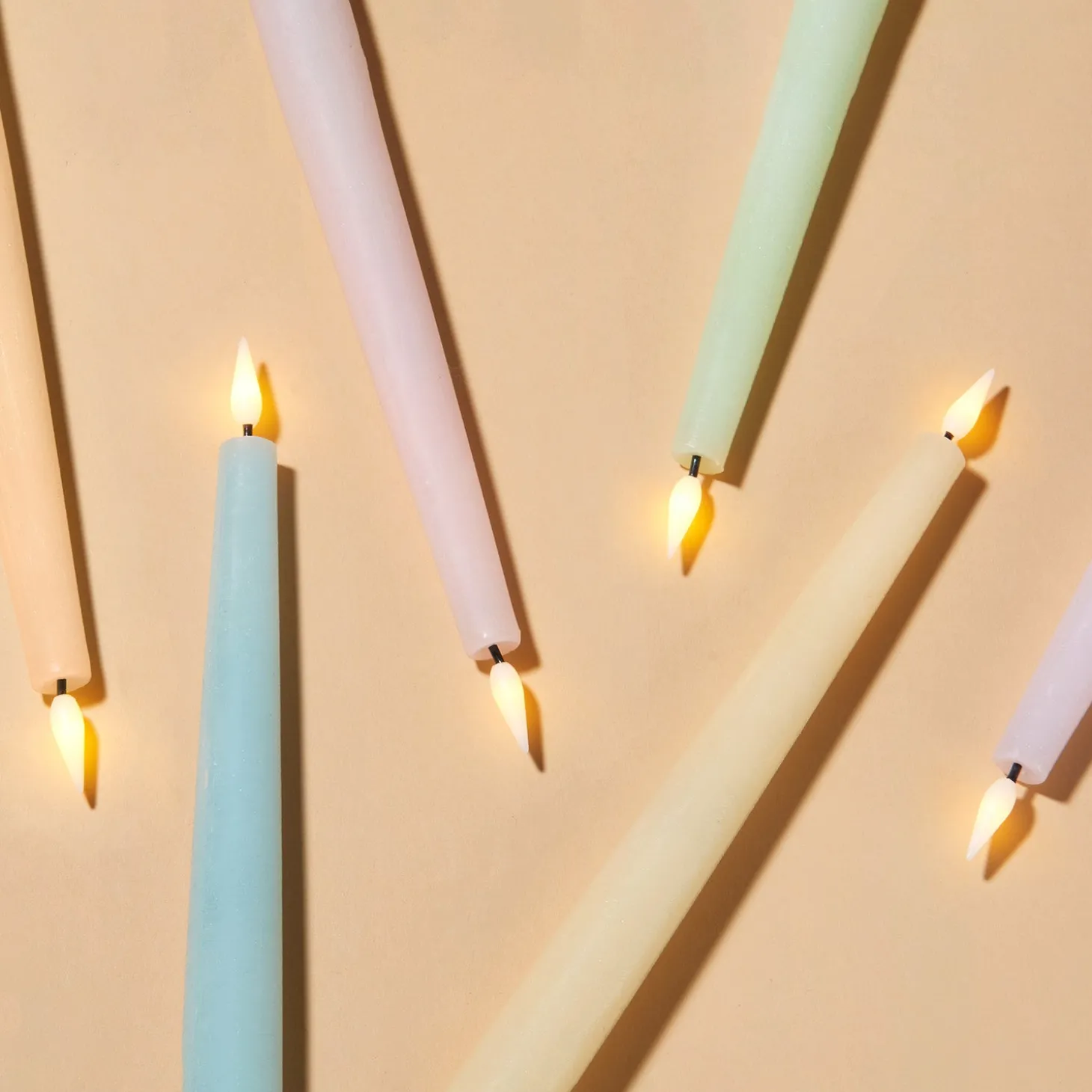 This candle set includes six elegant, colorful pastel candles featuring our distinctive Infinity Wick flames. These taper candles are a beautiful, versatile addition to any style of decor, boasting a real-wax exterior finished with a unique, distressed texture and cheerful pastel hues including pink, purple, green, orange and yellow. These tapers will fit most standard candle holders, and the included remote with timer make these Infinity Wick Candles an ideal gift for Mothers’ Day or housewarming. These pretty, dusty pastel candles are perfect for baby showers, Easter brunch, or even a spring or summer dinner party. Place among botanicals to accentuate a floral centerpiece to elevate any dinner table. Perfect for home, weddings, churches, restaurants, and events.