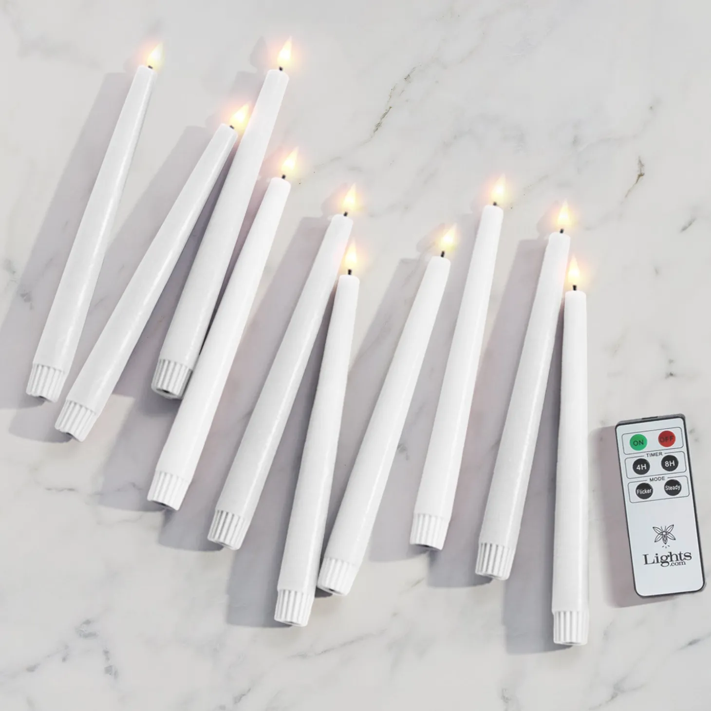 This candle set includes ten elegant white candles featuring our distinctive Infinity Wick flames. These taper candles are a beautiful, versatile addition to any style of decor, boasting a real-wax exterior finished with a unique, distressed texture and classic white hue. These tapers will fit most standard candle holders, and the included remote with timer make these Infinity Wick Candles an ideal gift for Christmas, housewarming, or for the newlyweds in your family. Place among botanicals to accentuate a floral centrepiece to elevate any dinner table. Group together on a side table or mantel, or distribute around a room to bring a touch of cheer to shadowy corners. Perfect for home, weddings, churches, restaurants, and events.