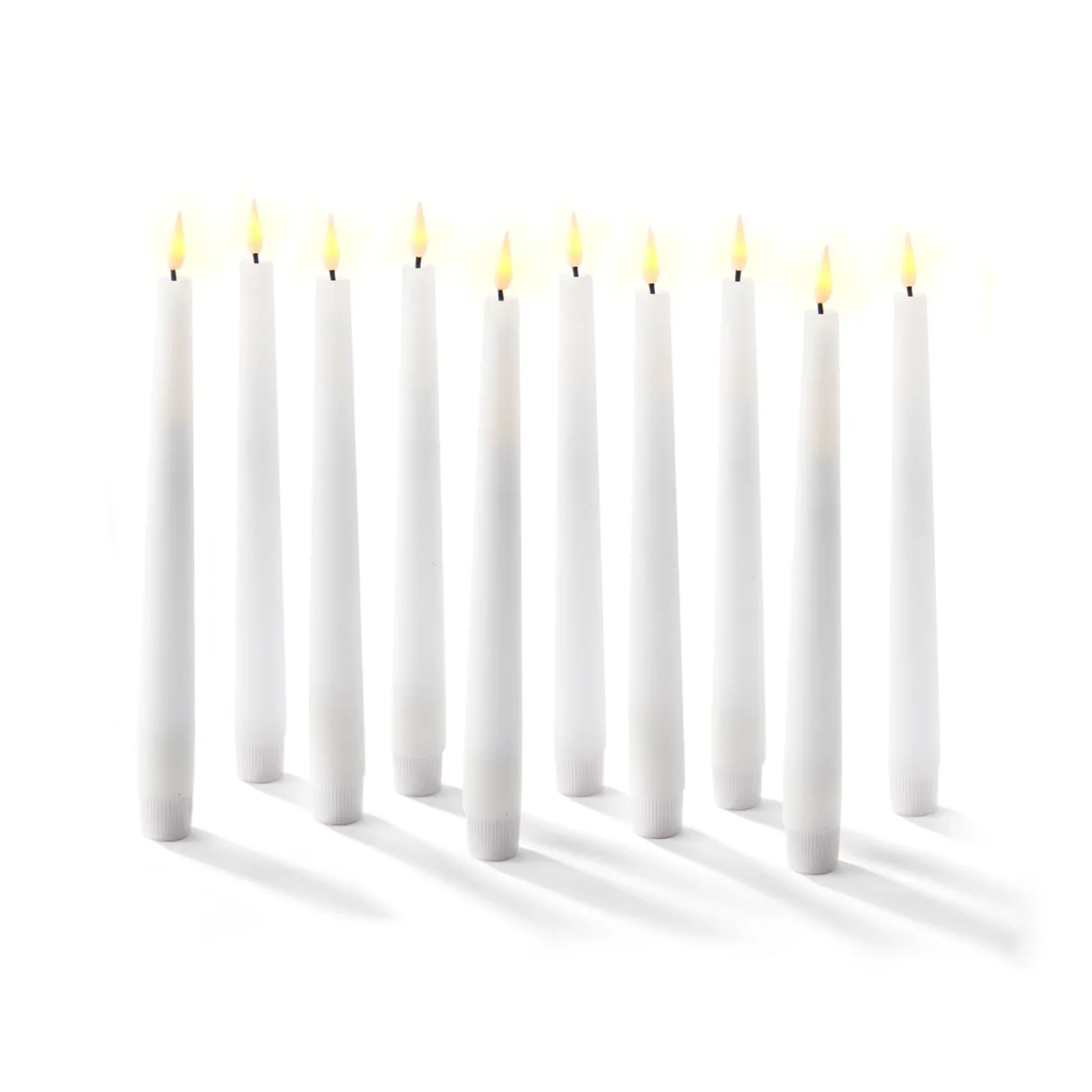 • Ten flameless taper candles measuring .75″ in diameter and 9″ in height, featuring our distinctive and ultra-realistic Infinity Wick flame