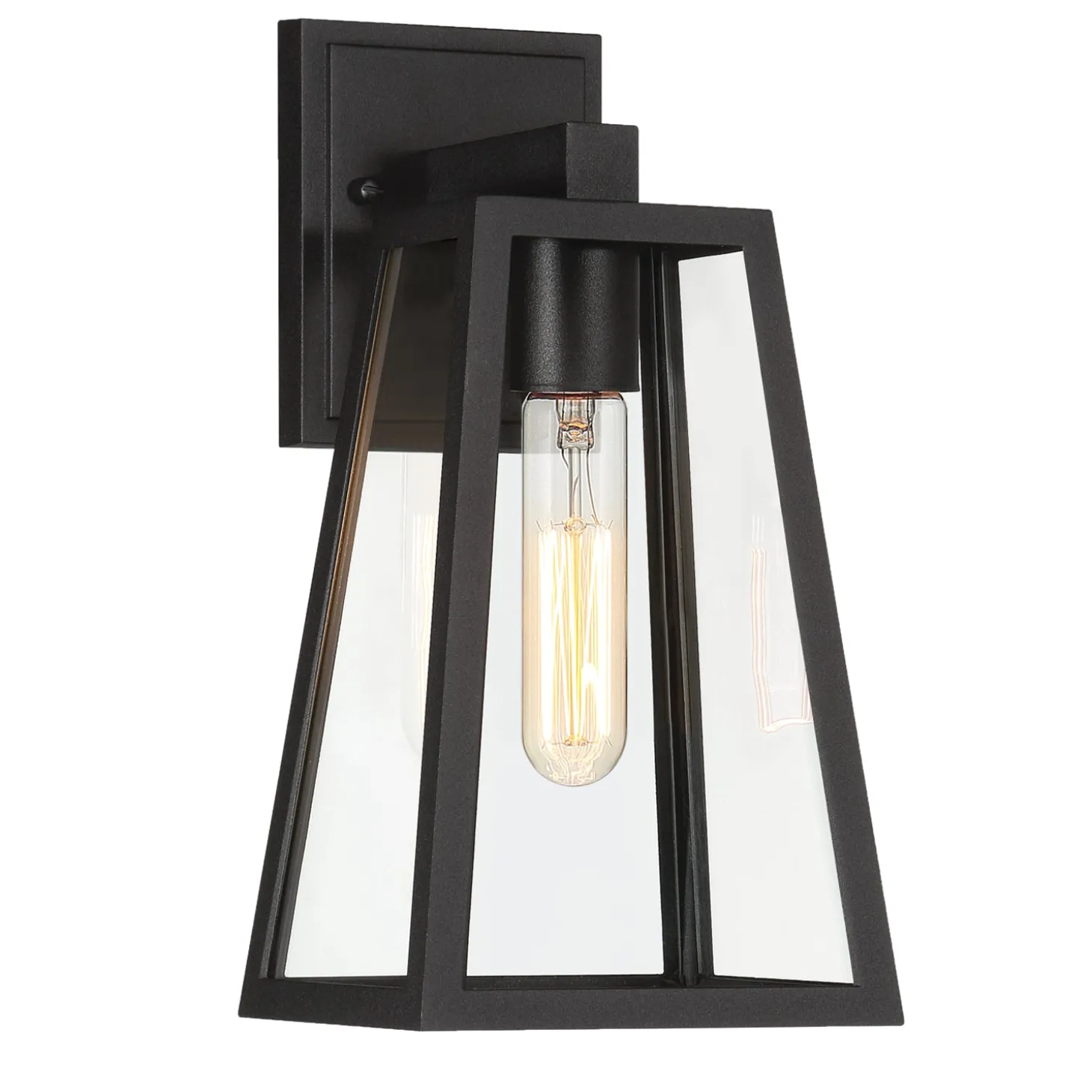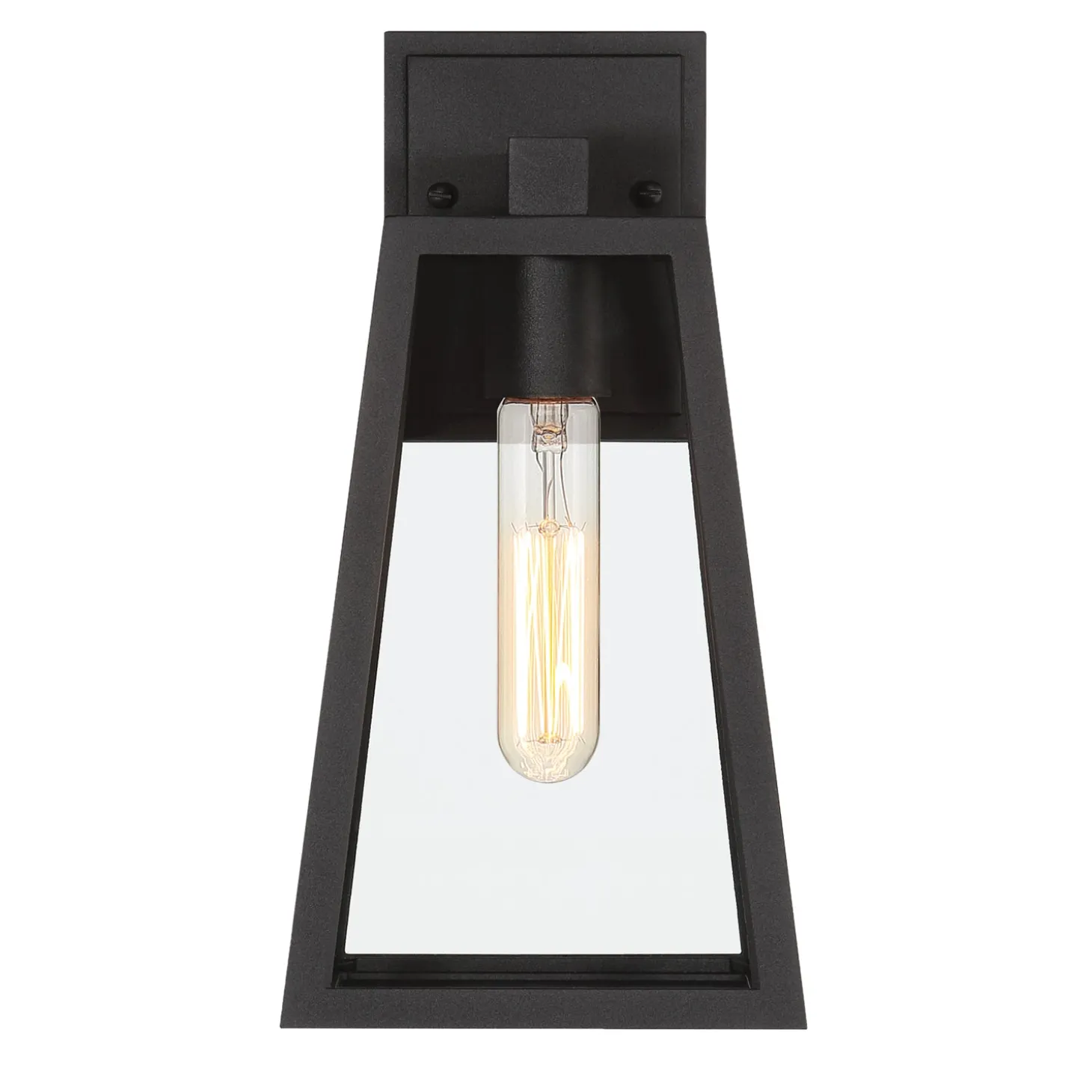 • Small wall light is 12.5″ tall and features a single bulb showcased in a boldly tapered matte black frame with clear glass panels