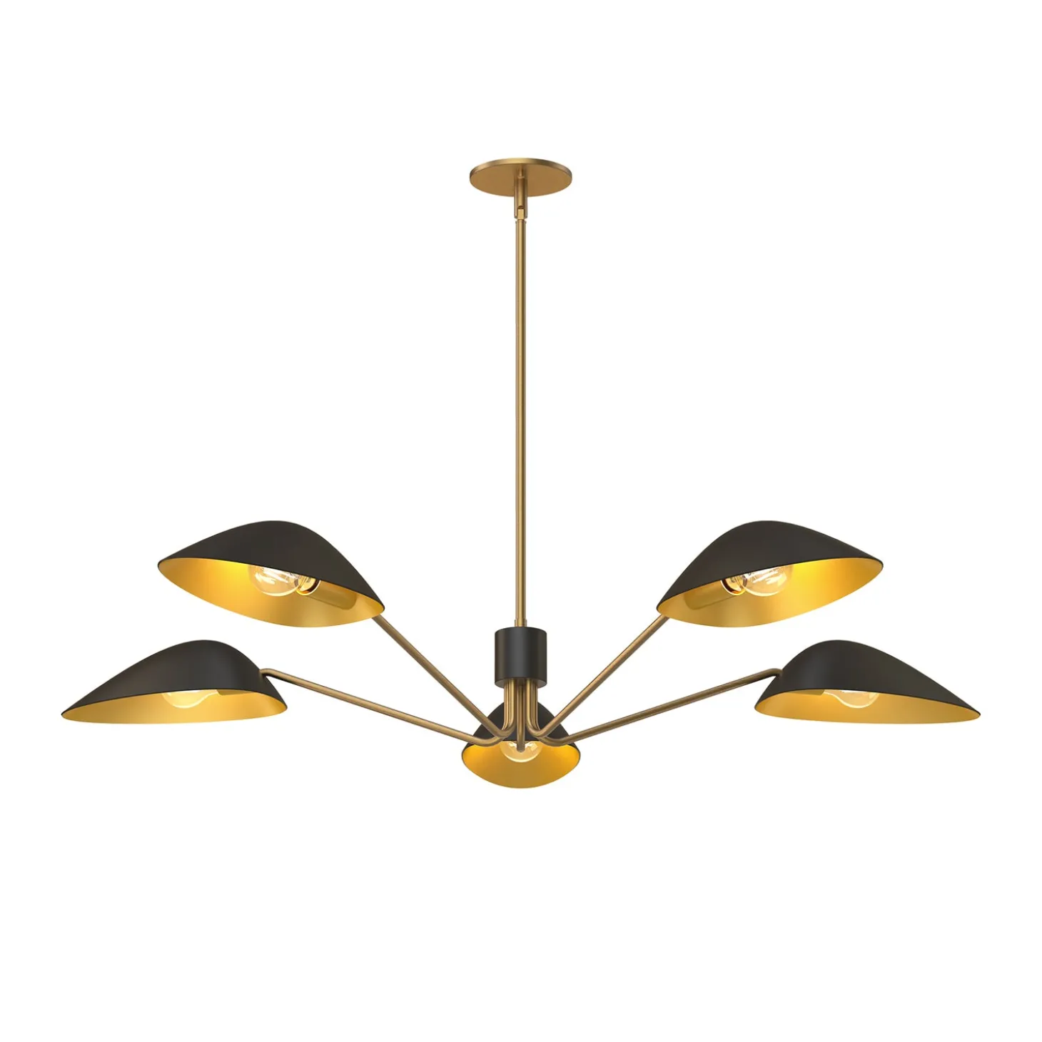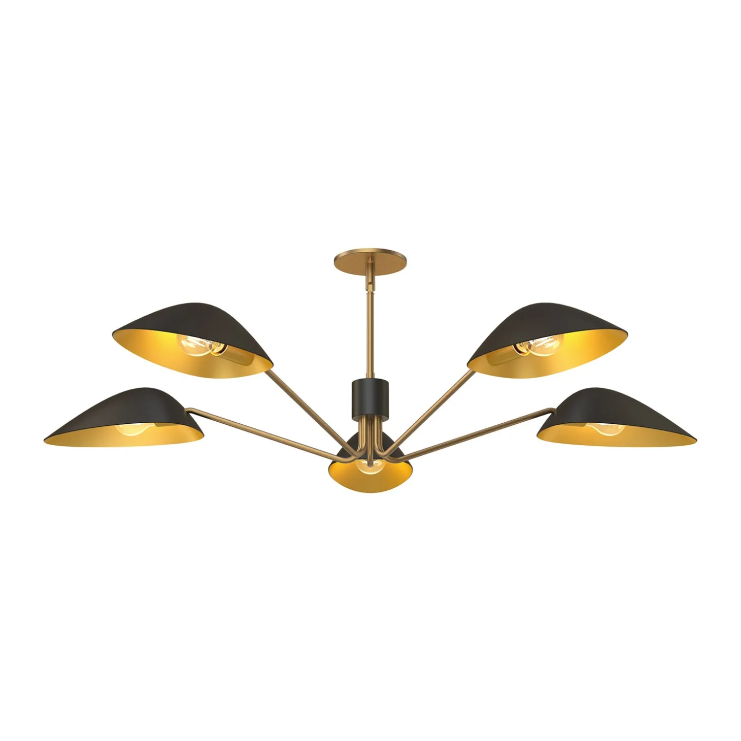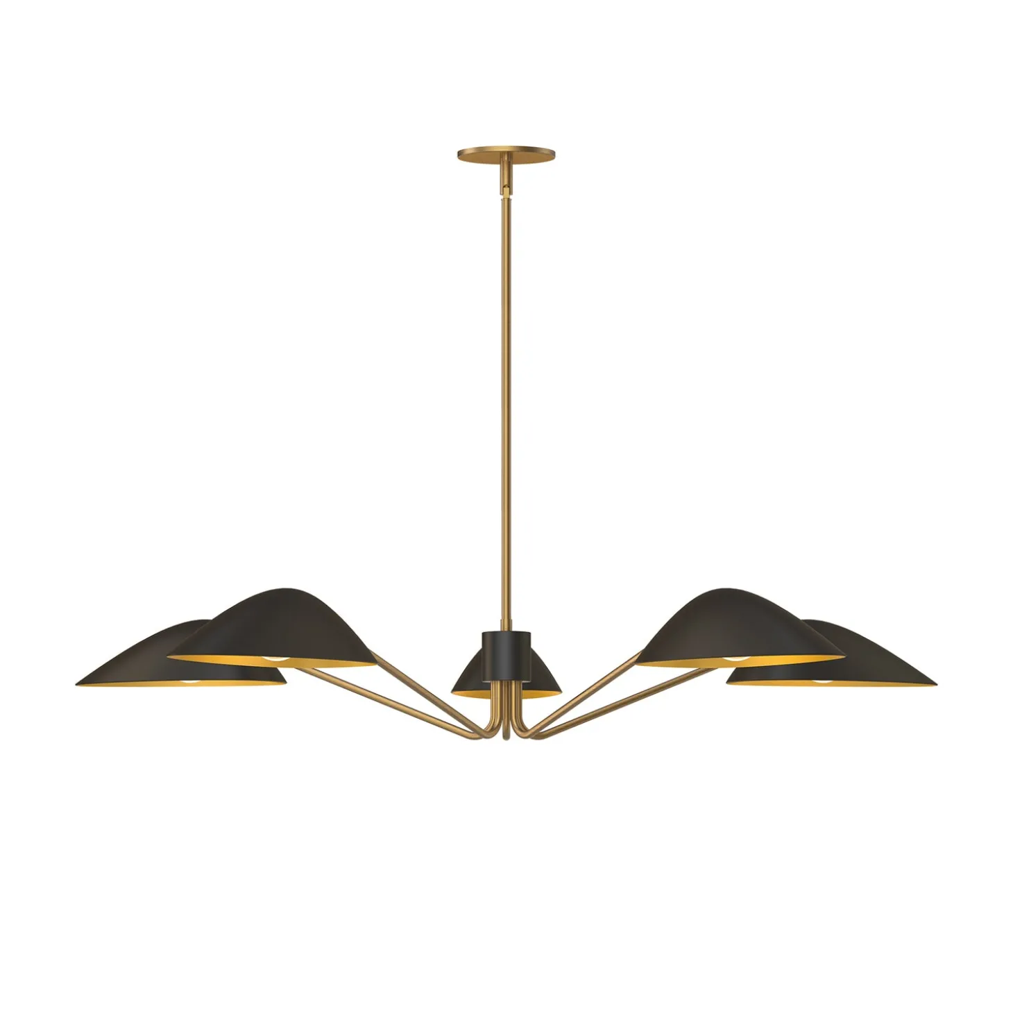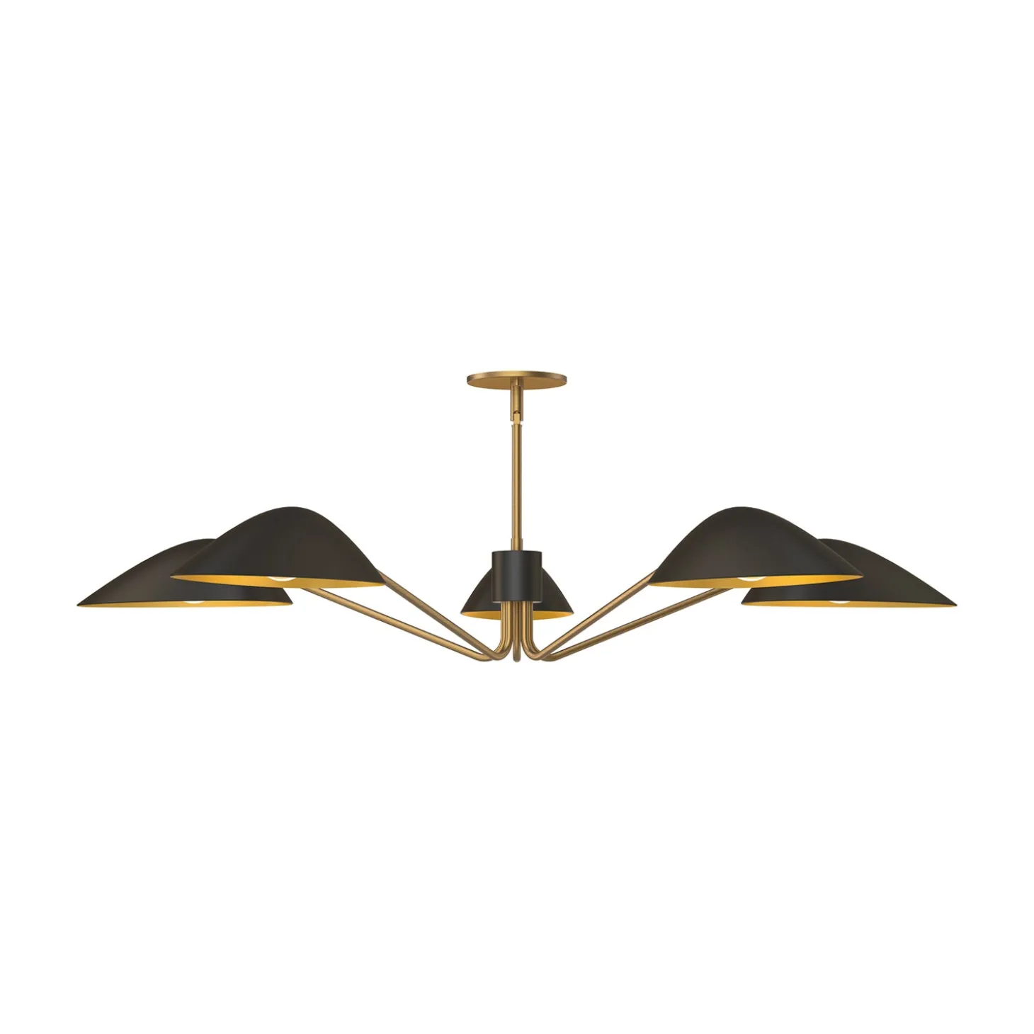 • Mantis-style chandelier features five arms and angular metal shades in matte black with antique brass interiors and detailing