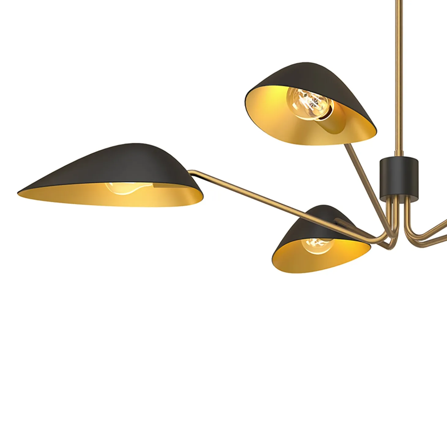 The Jade Chandelier makes a bold, modern statement with its distinctive and memorable ‘mantis’ design. This eye-catching fixture features three angular metal shades that extend outward from a central hub, creating a dynamic silhouette with an architectural presence. Each matte black shade has a contrasting antique brass interior that reflects light beautifully while directing illumination downward. The warm metallic tones continue through the angled arms, slim central column, and canopy, adding refined elegance to the contemporary form. With its expansive 46-inch spread, this chandelier commands attention over large dining tables, kitchen islands, or in spacious living areas, offering a perfect blend of mid-century inspiration and current design trends.