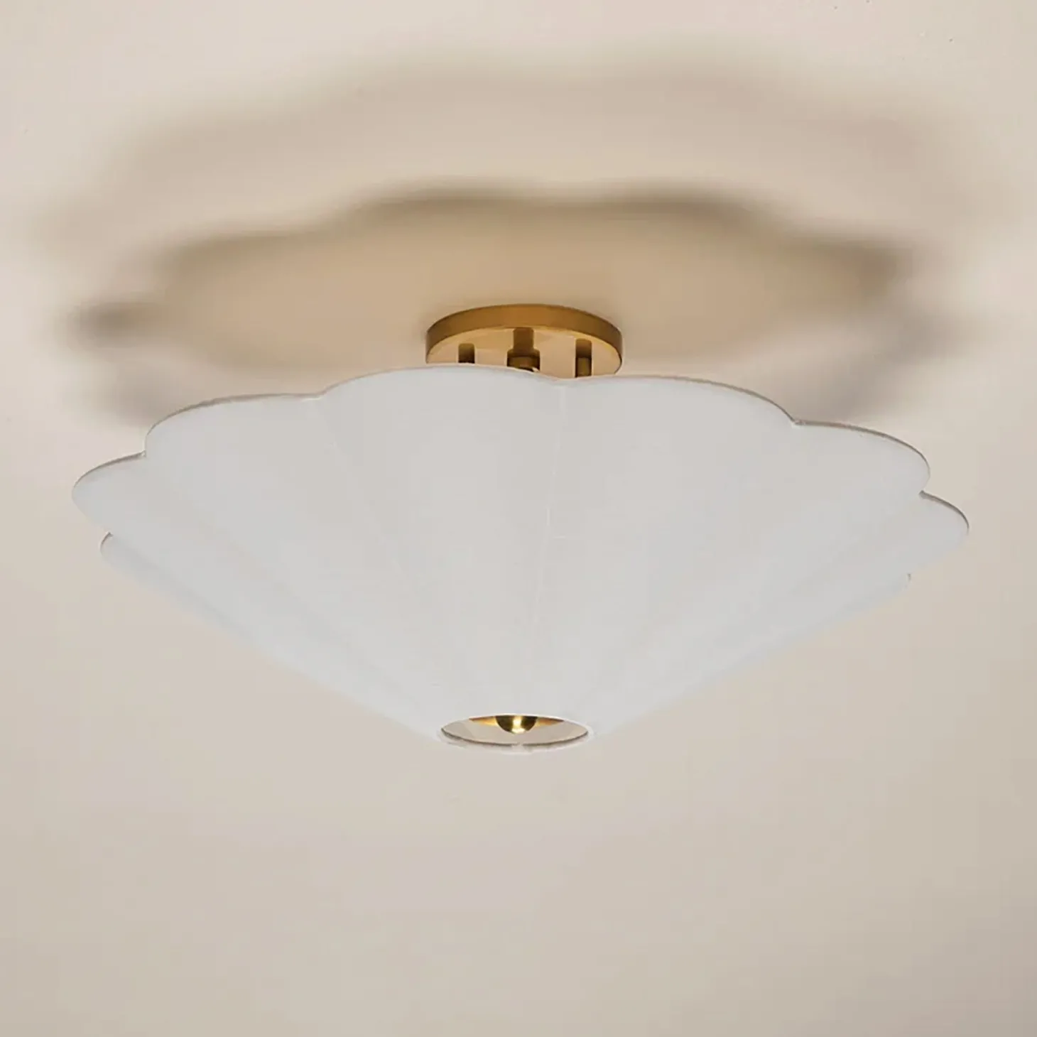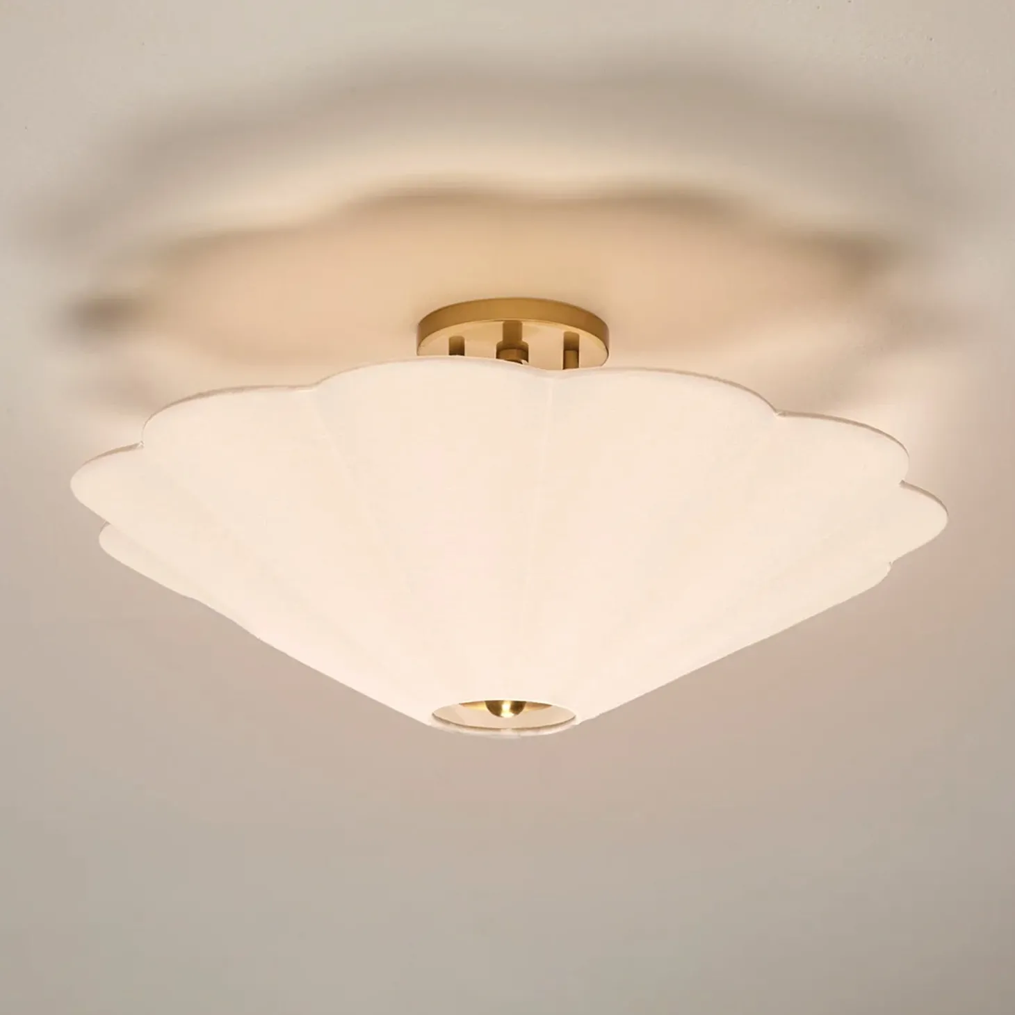 The Liza Semi-Flush Mount combines vintage-inspired elegance with a soft, scalloped, linen shade that beautifully diffuses light, creating a warm and inviting glow. With aged brass accents, it adds a refined, welcoming ambiance to any room. A selection of additional down rods are included to extend this semi-flush mount into a pendant light. Perfect for bedrooms, hallways, or entryways, this semi-flush mount brings effortless sophistication to your space.