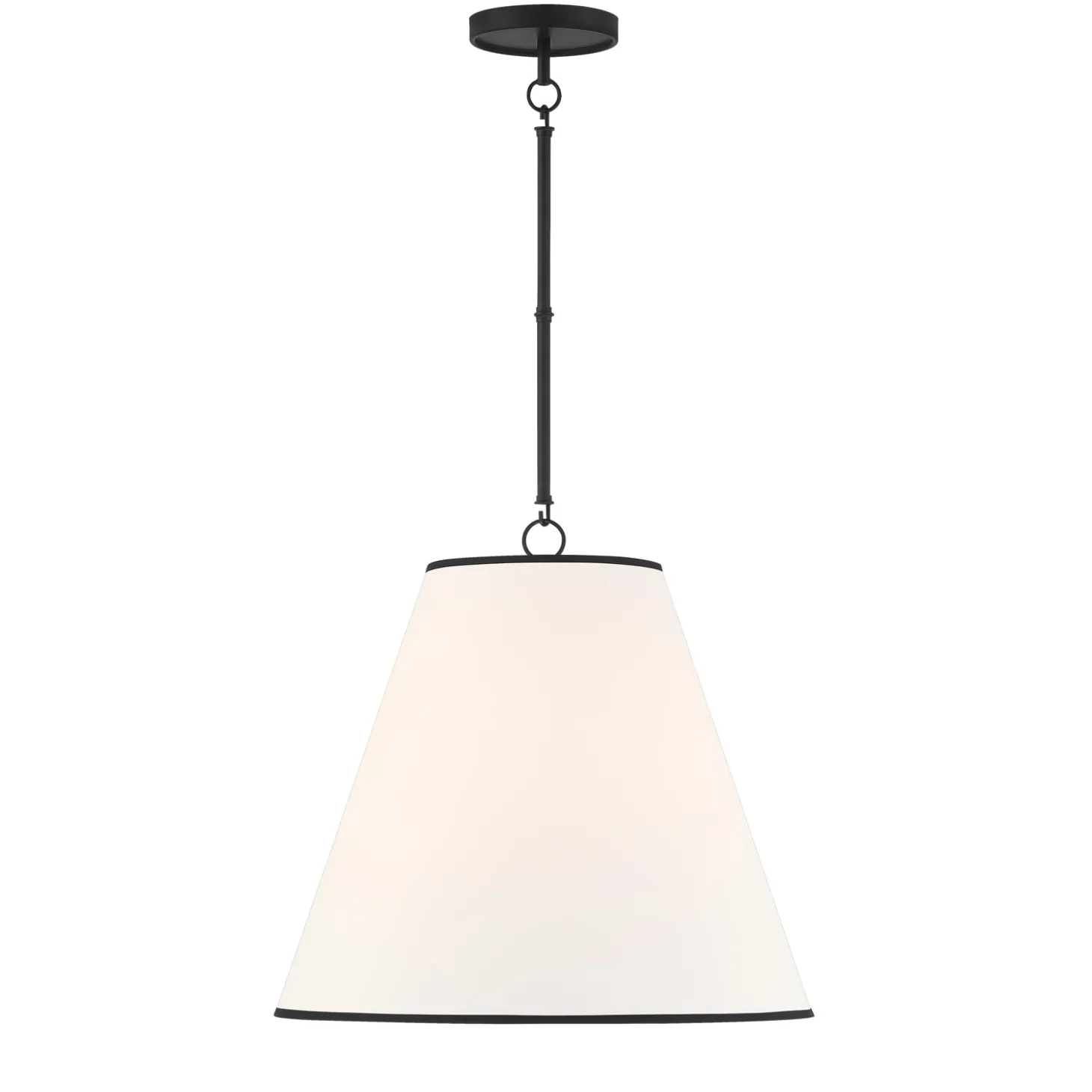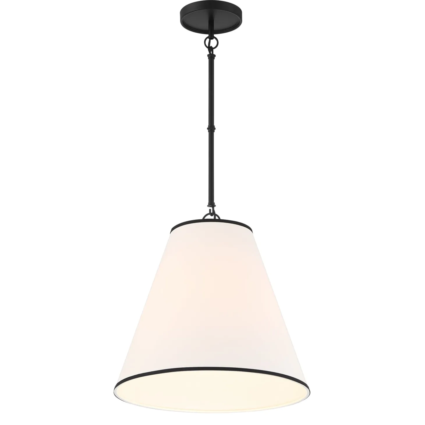The Luca Large 18″ Conical Pendant is comprised of a stunning matte black metal body paired with a dramatic, tapered white fabric shade with black detailing. While boasting a classic tapered drum pendant silhouette, the Luca provides updated, smart details- perfectly executed contrast with black trim at the edges of the shade, and adjustable hanging height by way of six-inch rods and decorative couplers. With a traditional shape and modern finishes and textures, this pendant works well in transitional, traditional, or modern spaces. The gorgeous fabric shade is optimal for overhead lighting, helping to diffuse and soften the light from any bulb. The Luca series of fabric pendant lights are perfect in sets above dining room tables, kitchen islands or as a single light in a bedroom, entryway, or kitchenette.