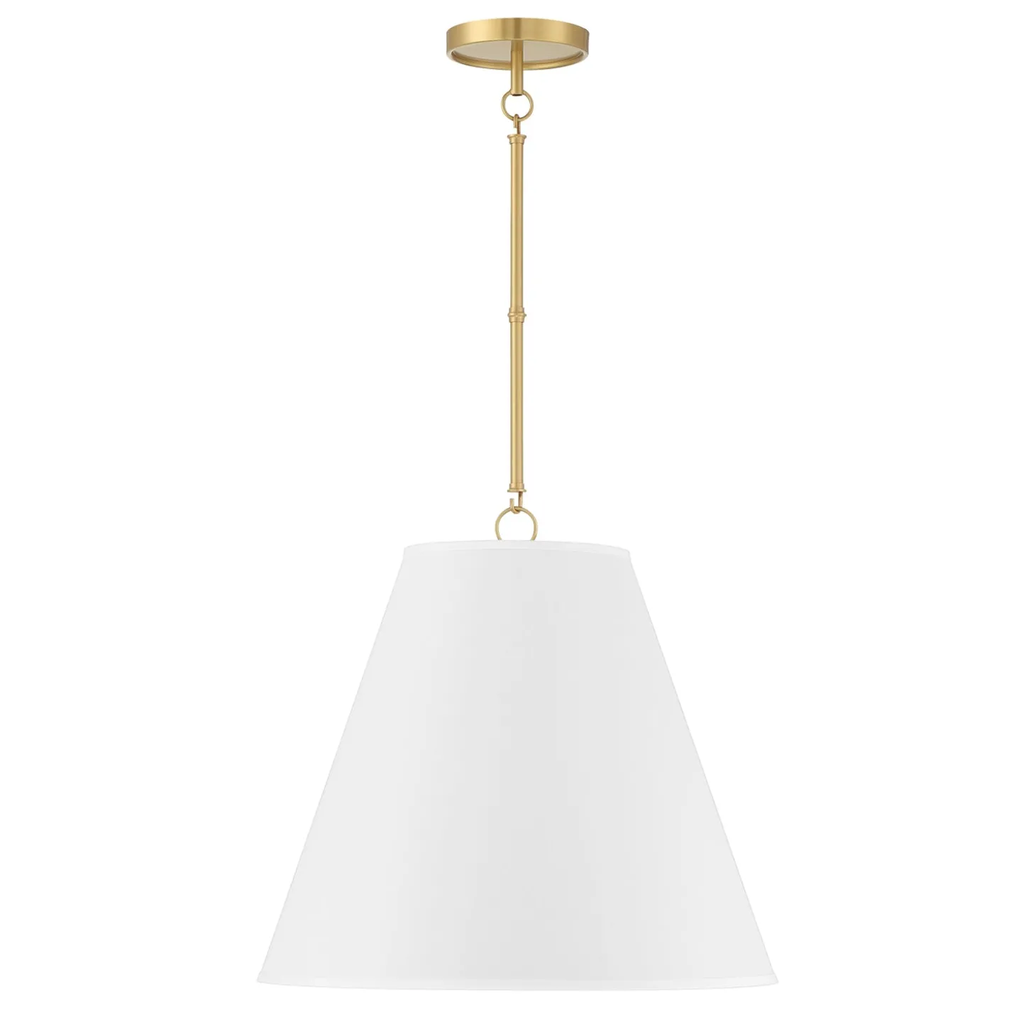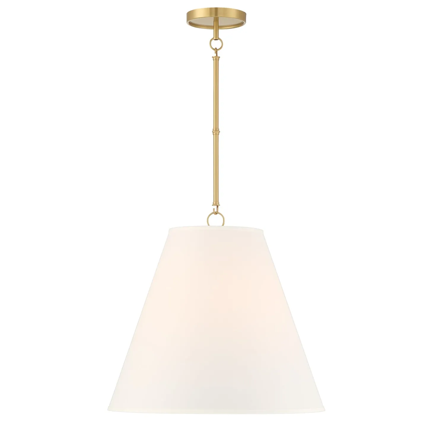 The Luca Large 18″ Conical Pendant is comprised of a gleaming satin brass metal body paired with a dramatic, tapered white fabric shade. While boasting a classic tapered drum pendant silhouette, the Luca provides updated, smart details- a perfectly executed complementary white shade and adjustable hanging height by way of six-inch rods and decorative couplers. With a traditional shape and modern finishes and textures, this pendant works well in transitional, traditional, or modern spaces. The gorgeous fabric shade is optimal for overhead lighting, helping to diffuse and soften the light from any bulb. The Luca series of fabric pendant lights are perfect in sets above dining room tables, kitchen islands or as a single light in a bedroom, entryway, or kitchenette.
