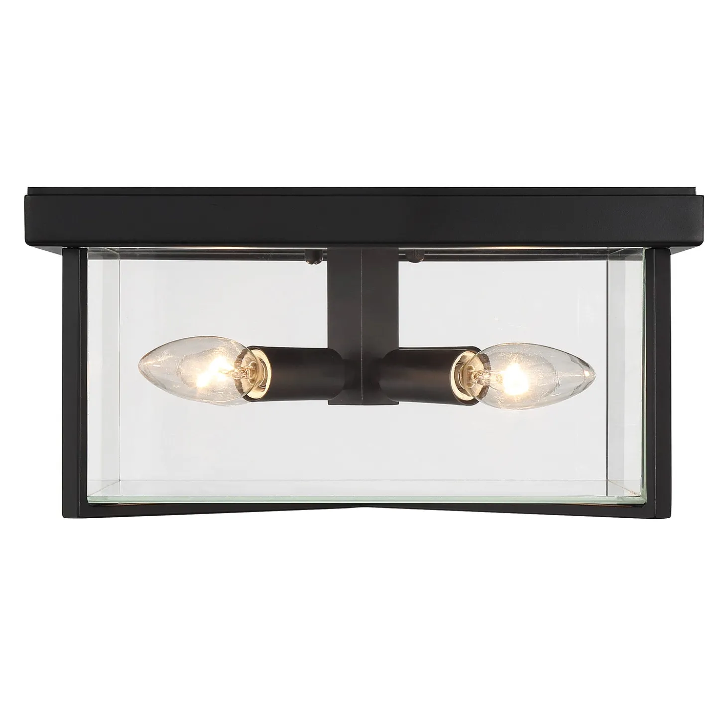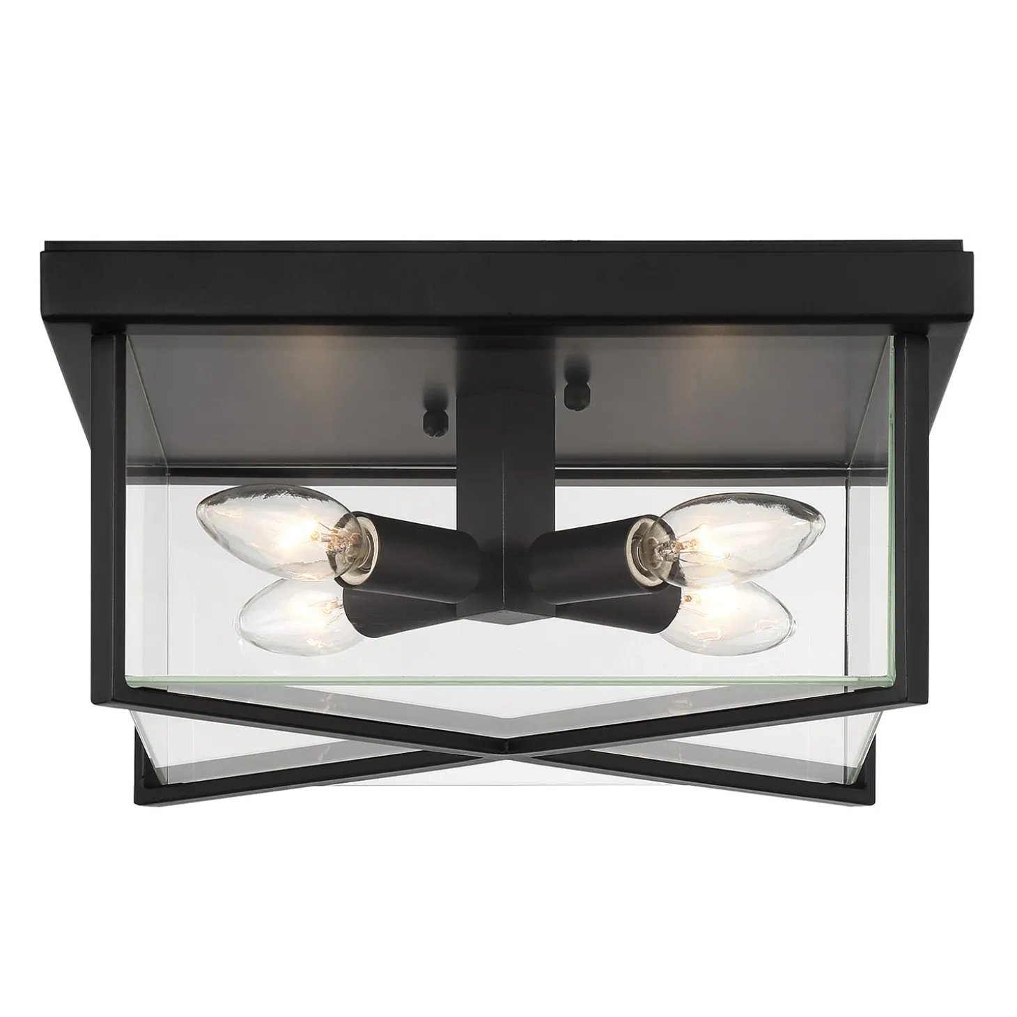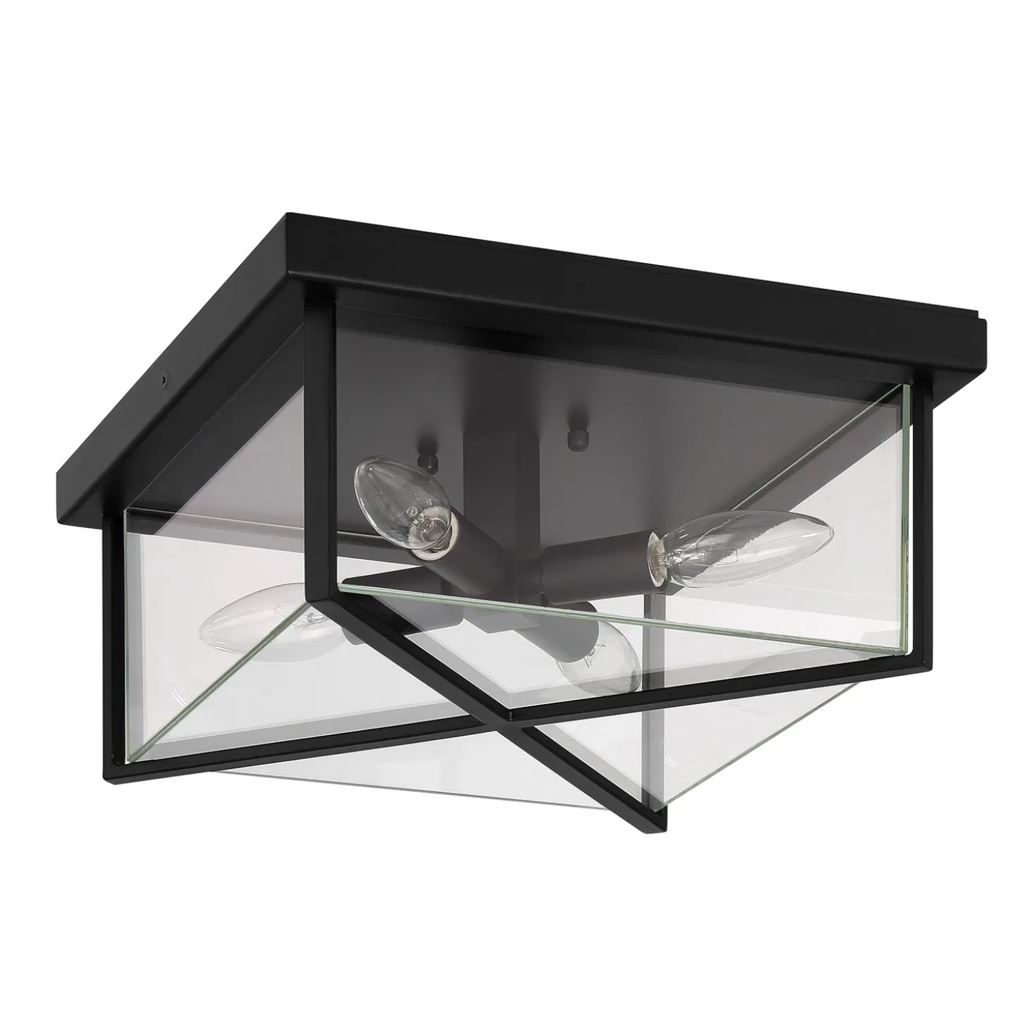 The Miles Indoor/Outdoor Flush Mount exudes modern elegance with its crisp lines and sleek finish. The matte black finish of its mounting plate and square frame, with unique cross detailing, gently reflects light from the four candelabra bulbs set behind clear glass. This ceiling-mounted light is damp-rated, making it an exquisite addition to a covered porch or patio, and is perfectly suited to add a warm glow to your indoor spaces like a bathroom, hallway, or bedroom. From modern to traditional, the Miles Flush Mount will fit into your home’s design aesthetic.