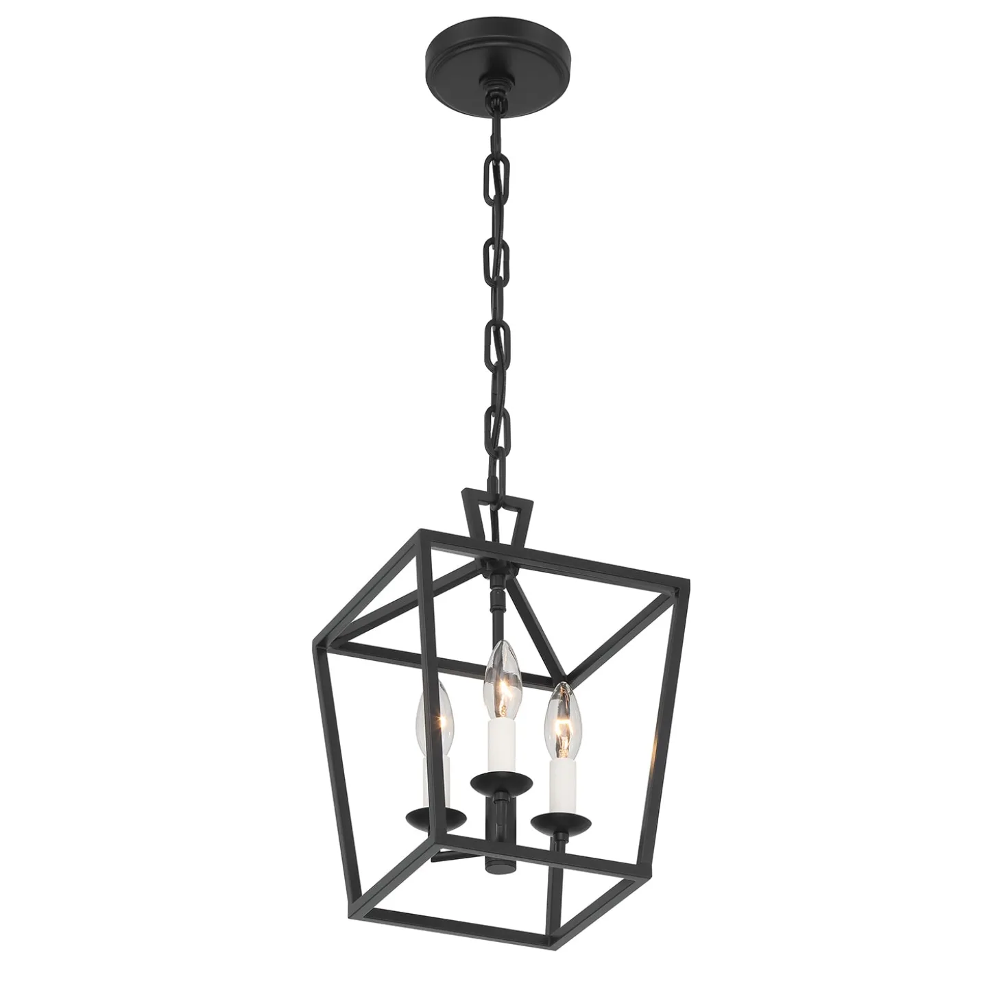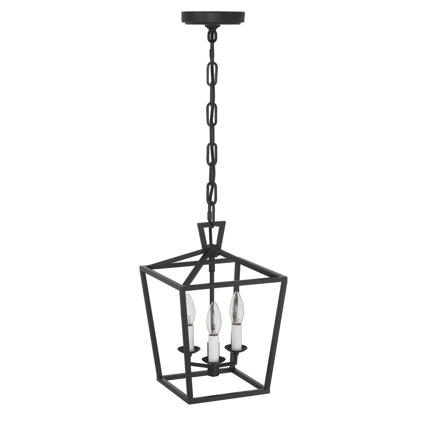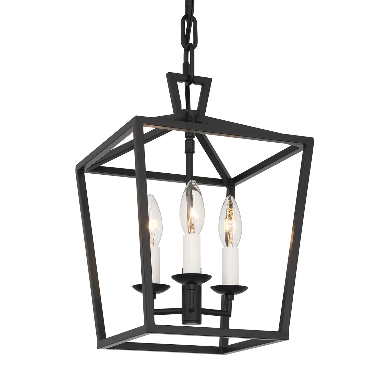 The Anover Collection of dramatic, open frame pendant lights is inspired by a classic silhouette and enhanced with modern detailing and finishes. The Anover 10″ Wide Lantern Pendant Light features three candelabra lights set in a timeless open metal frame, finished in a striking matte black. The entire structure is suspended by a beautiful, adjustable matching chain and circular canopy. Each component has been thoughtfully styled and produced; including a delicately tiered canopy, seamless body welds punctuated with rivets, stunning top loop, and flawless chain links. This beautiful fixture is dimmable with compatible bulbs and dimmer. Perfect for an entryway, hallway, or above a small dining table.