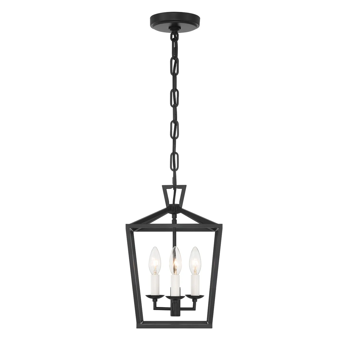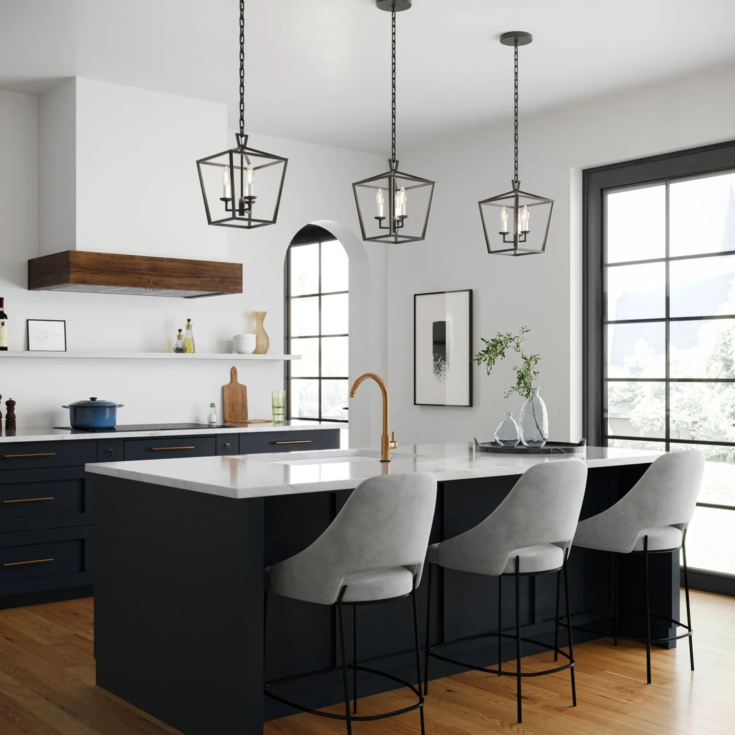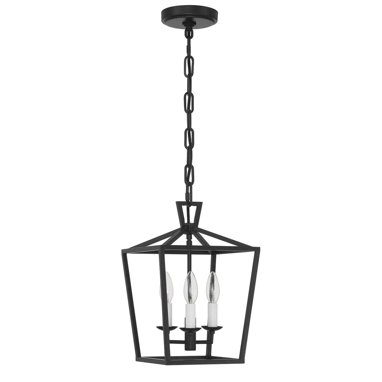 The Anover Collection of dramatic, open frame pendant lights is inspired by a classic silhouette and enhanced with modern detailing and finishes. The Anover 10″ Wide Lantern Pendant Light features three candelabra lights set in a timeless open metal frame, finished in a striking matte black. The entire structure is suspended by a beautiful, adjustable matching chain and circular canopy. Each component has been thoughtfully styled and produced; including a delicately tiered canopy, seamless body welds punctuated with rivets, stunning top loop, and flawless chain links. This beautiful fixture is dimmable with compatible bulbs and dimmer. Perfect for an entryway, hallway, or above a small dining table.