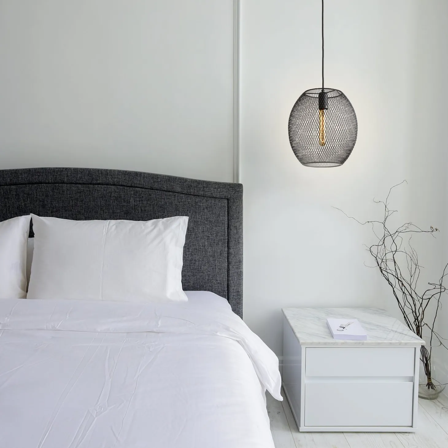 Modern, minimalistic, and versatile, the Bergen collection is both edgy and timeless. This oval mesh cage pendant light is our contemporary take on a classic, industrial fixture. Features a sleek, black metal cage frame that reveals the warm glow of a vintage-inspired Edison bulb of your choice. The large oval pendant light is suspended by an adjustable length black cord from a matching ceiling canopy. Striking in an office, a hallway, or in multiples over a kitchen island.