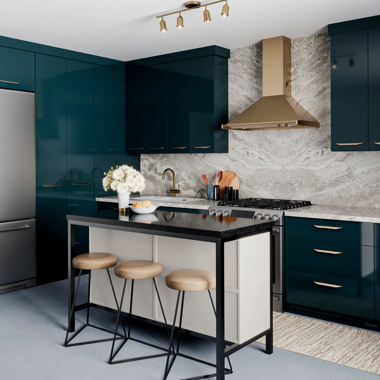 • One modern track light constructed of sturdy steel and finished in warm brushed brass, featuring four adjustable heads with swiveling necks for precision lighting