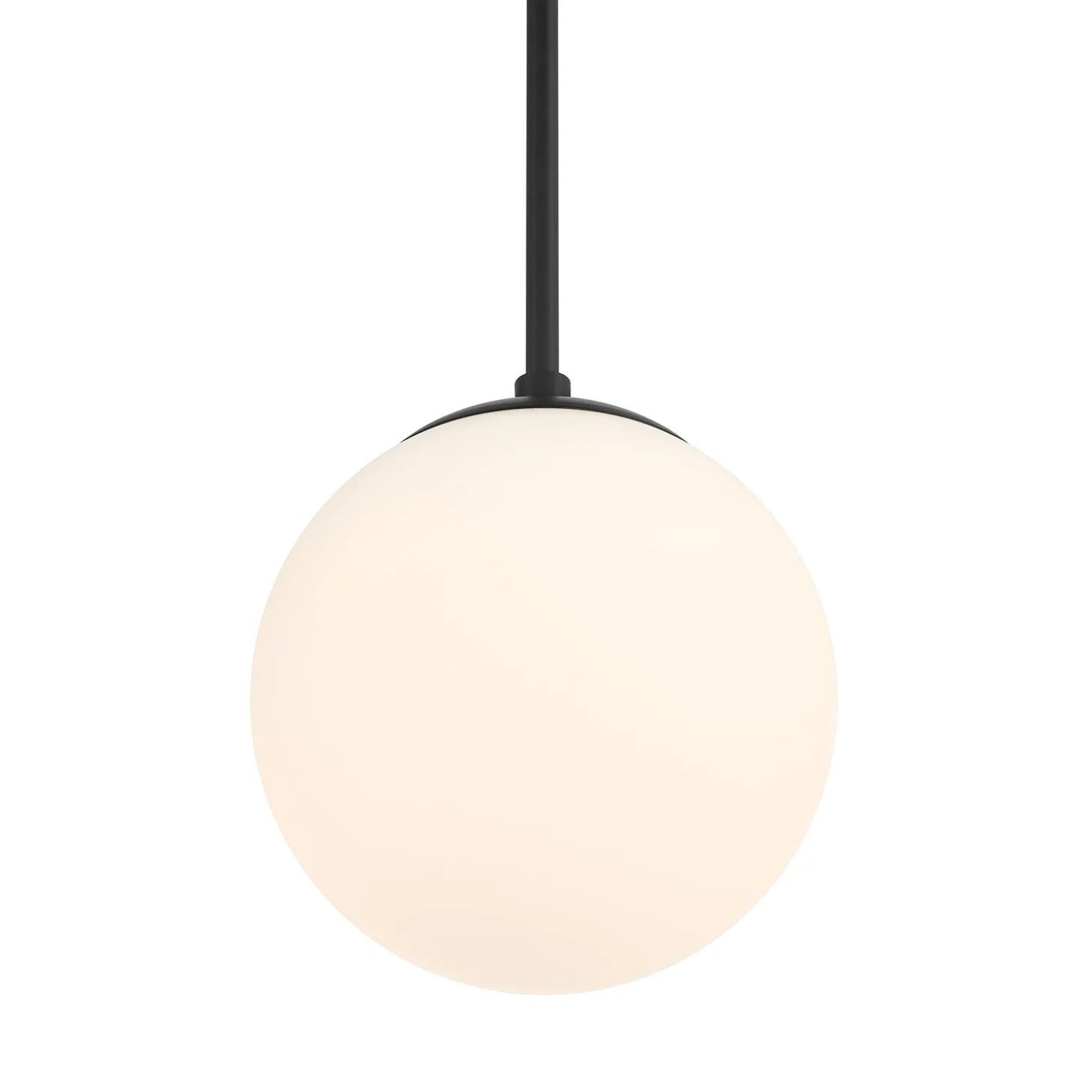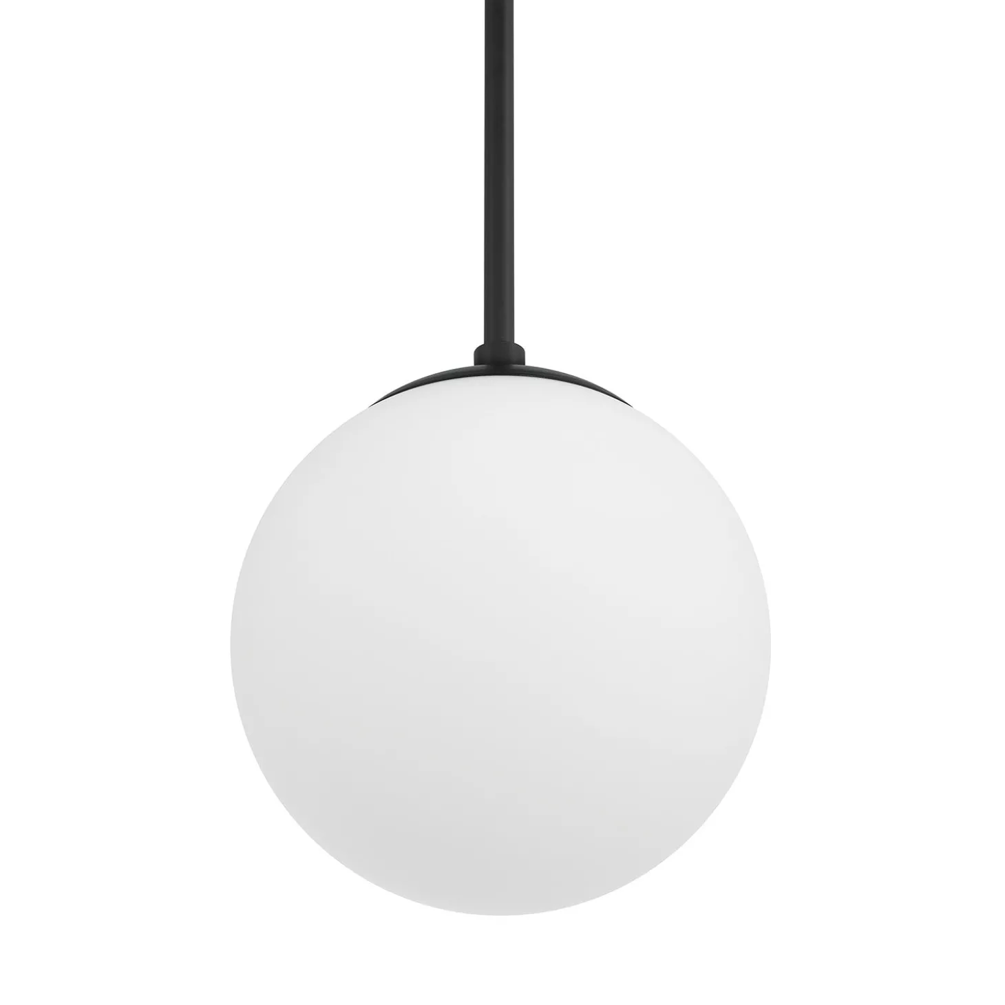 • Single pendant light features an 8″ frosted white glass orb capped with a spun metal, matte black hood