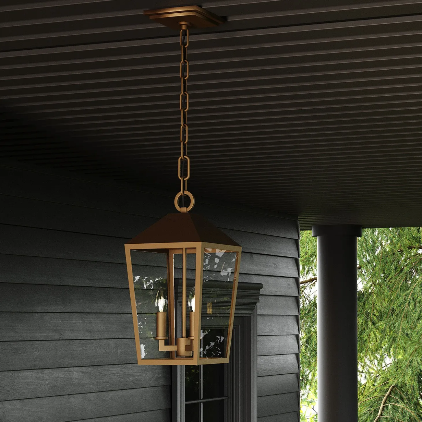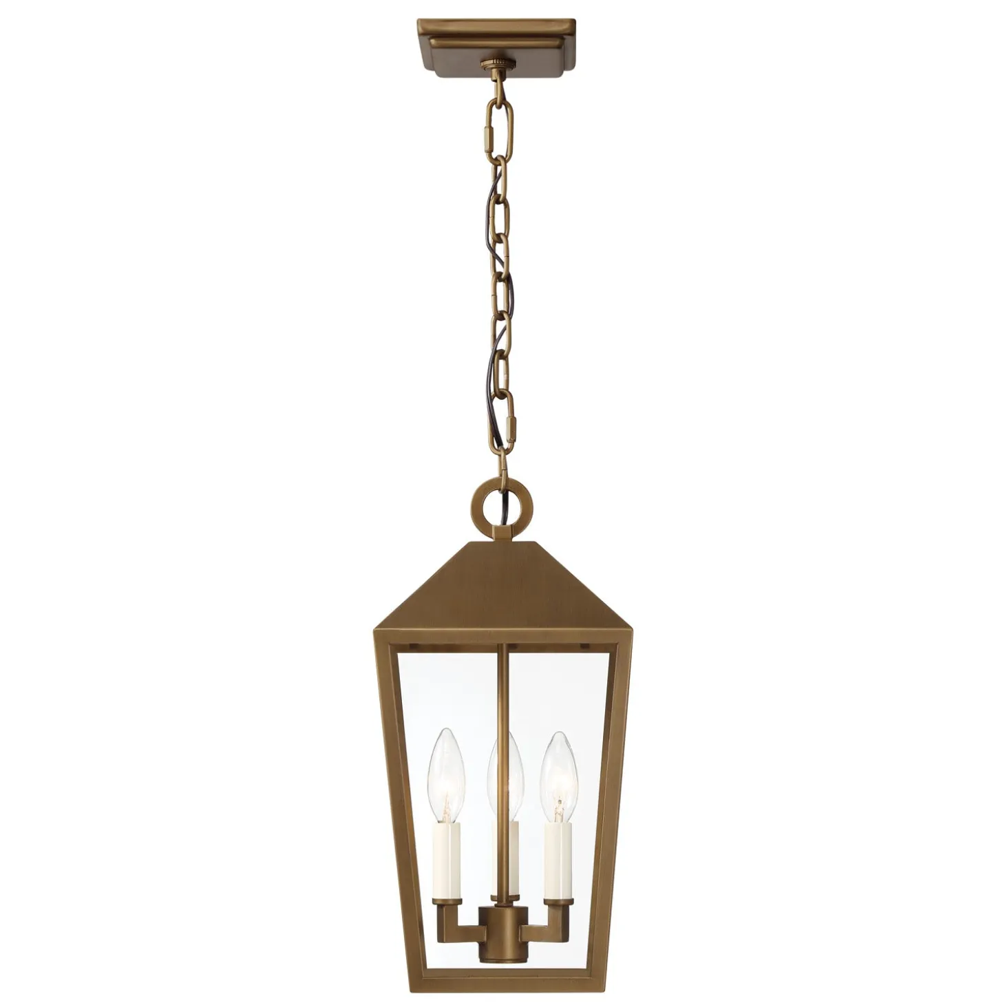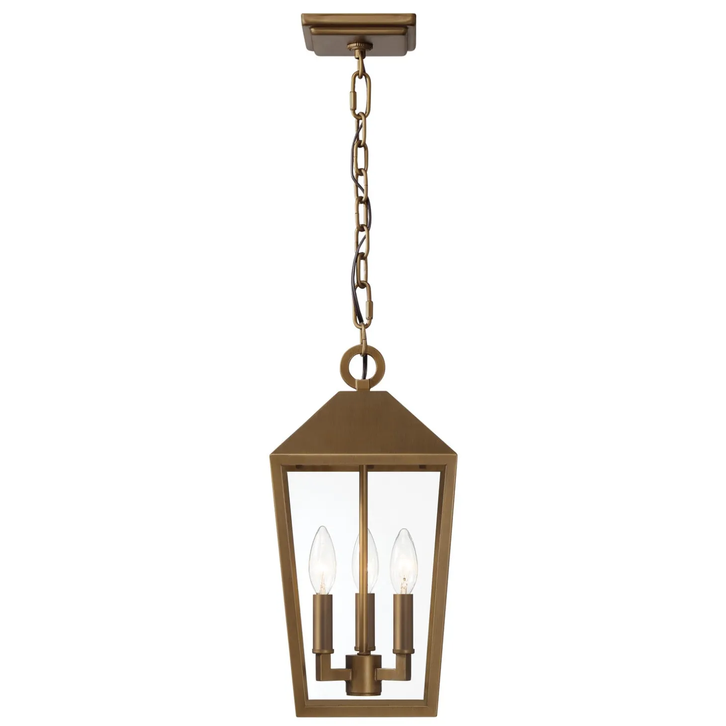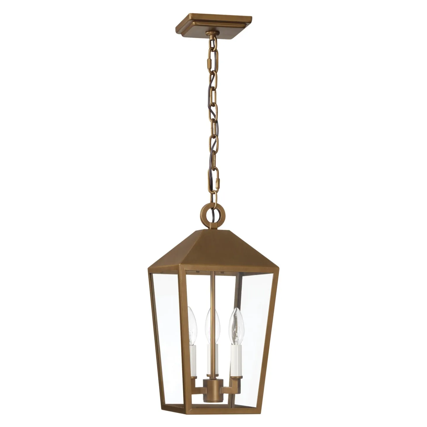 The Cole Outdoor Hanging Light is a timeless and classic lantern design with a modern sensibility. A slightly tapered silhouette reveals simple lines that seamlessly frame clear glass and three candelabra style bulbs, housed in burnished brass or cream-colored sleeves. The outdoor hanging light fixture is topped with a weatherproof canopy that blends harmoniously with the frame. A coordinated metal chain securely hangs the light and accentuates the arching ring detail. This sturdy outdoor light is designed to withstand the elements complete with a burnished brass, powder-coated finish. Perfect as a single fixture illuminating an entryway, or used in multiples for lighting a porch or patio, this fixture can also be used indoors to light up a foyer or in multiples as pendants over an island. This medium-sized outdoor pendant light is part of the larger Cole Outdoor Lighting collection, including post and wall lights to complete your exterior lighting project.