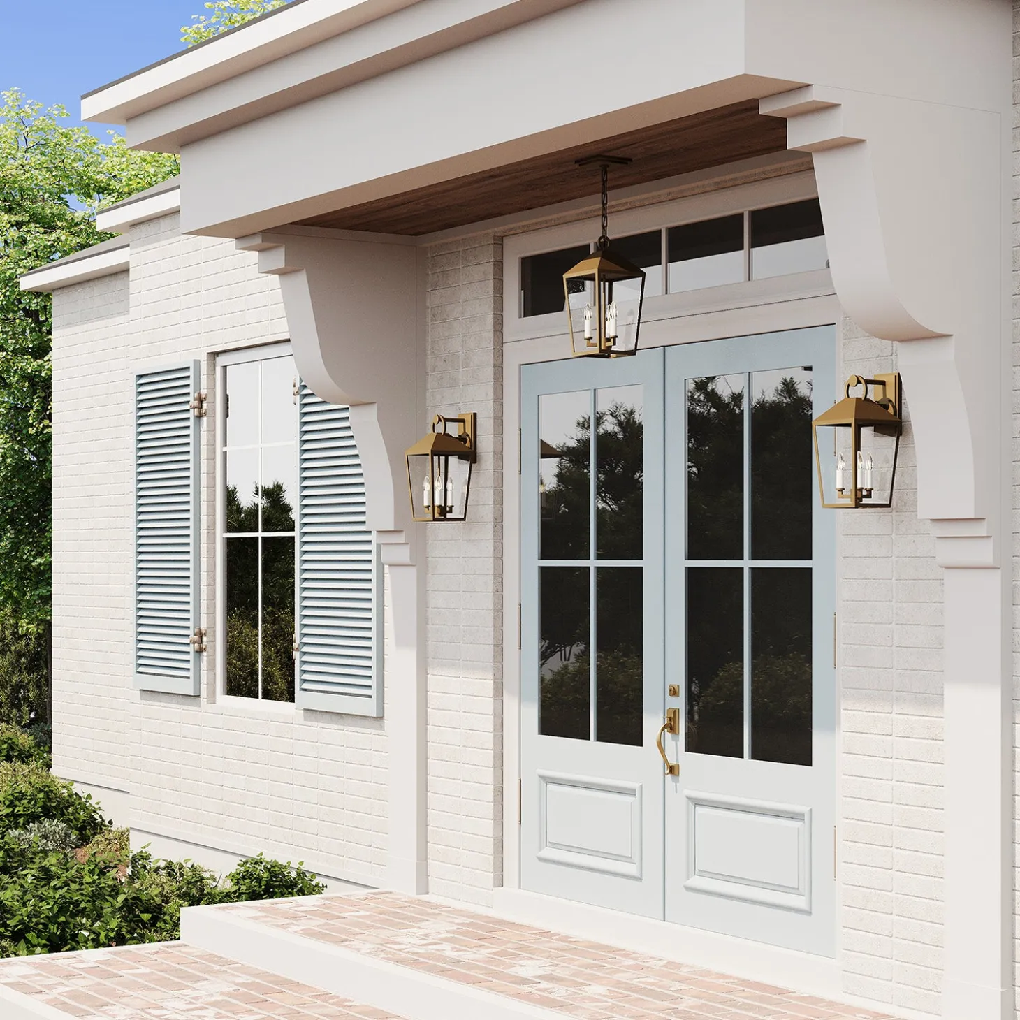• Outdoor 16″ pendant light features three candelabra bulbs set in a classic lantern-style metal and glass fixture and finished in burnished brass
