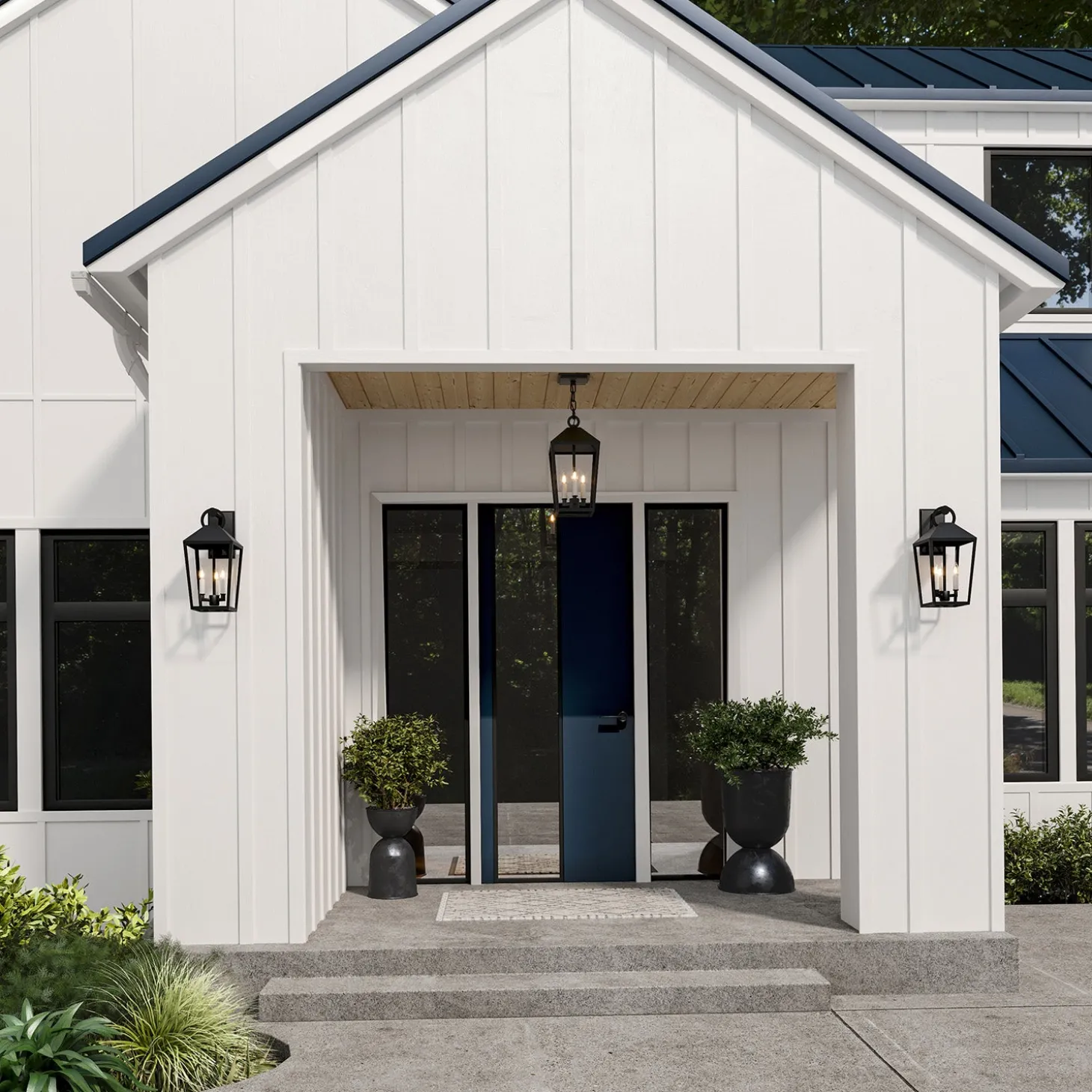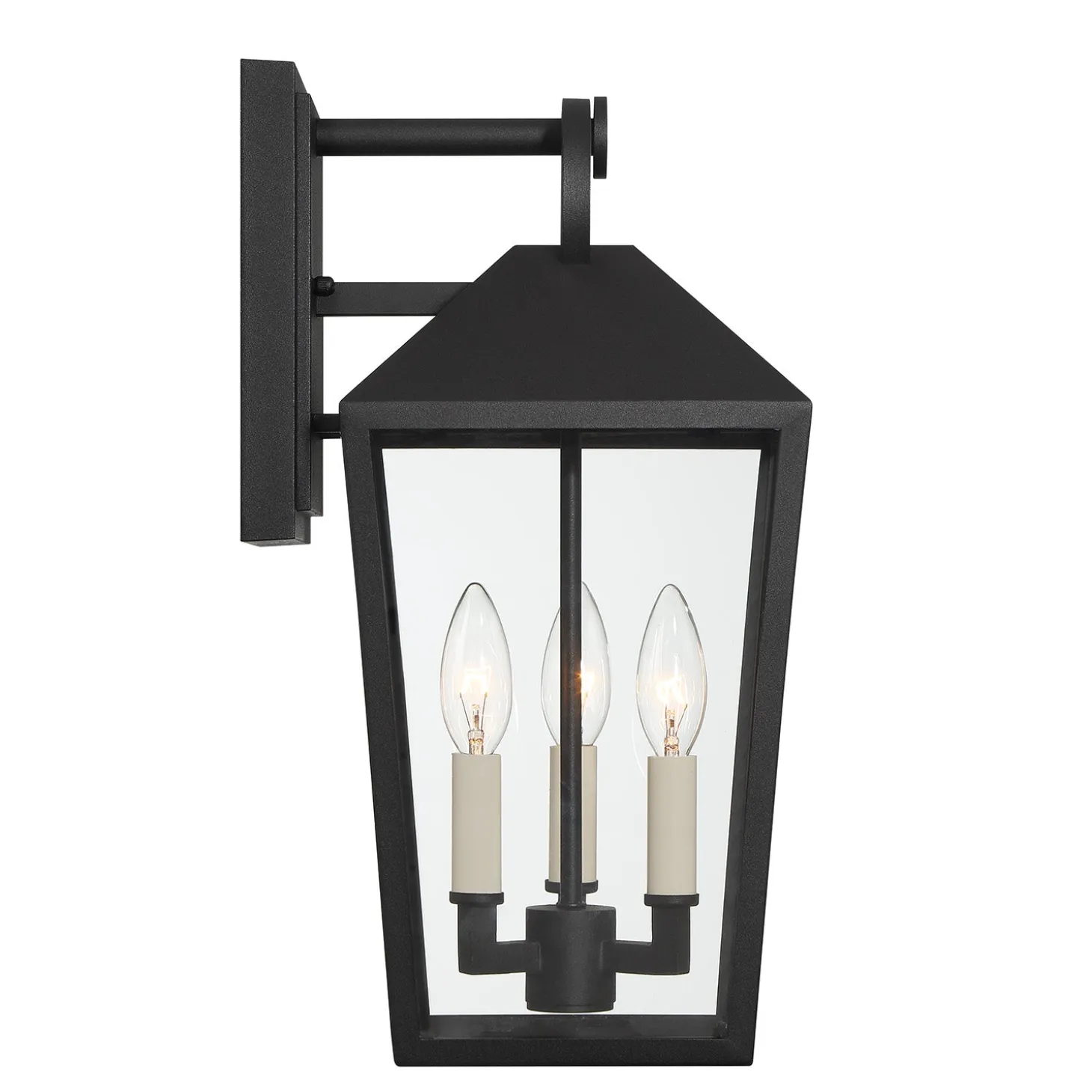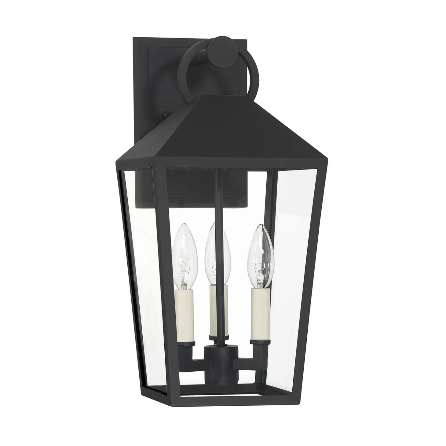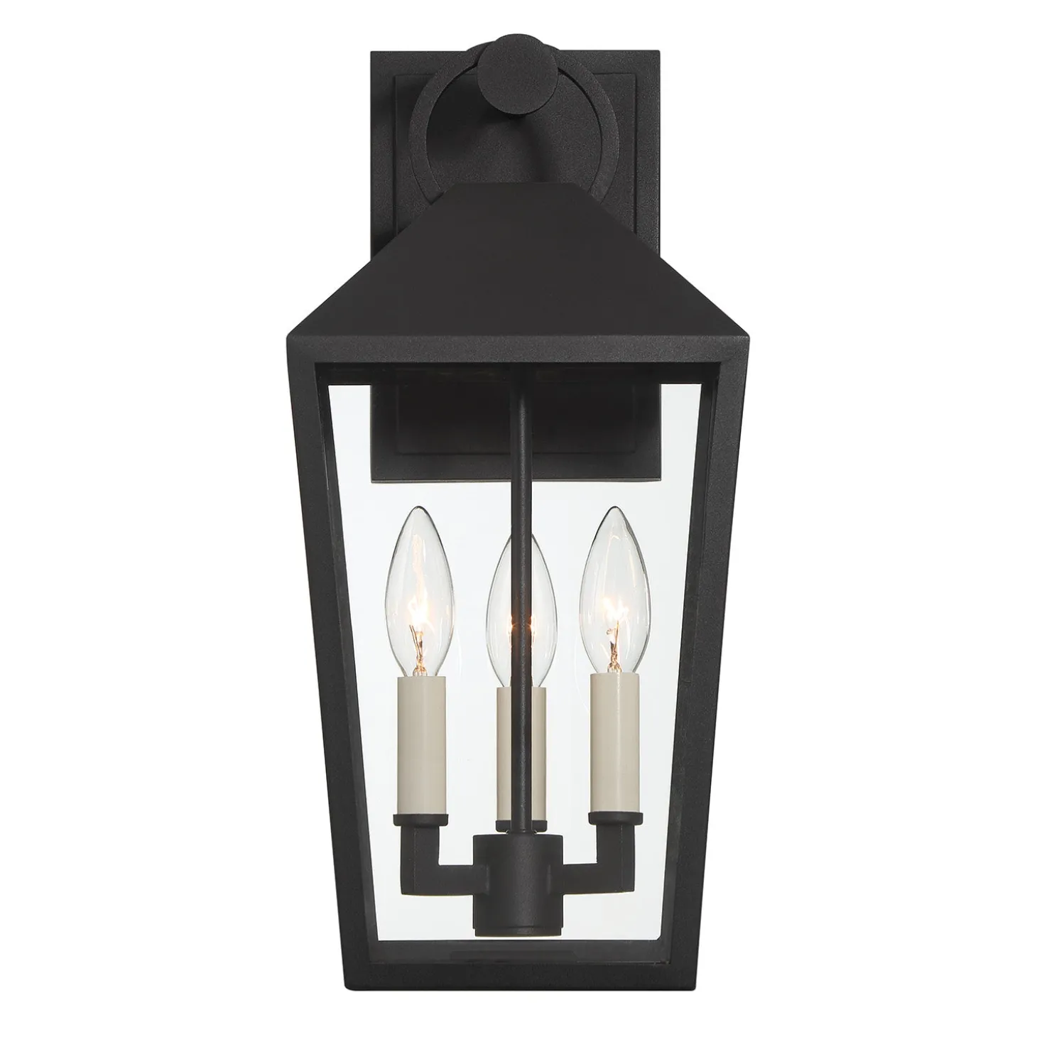 The Cole Outdoor Medium Wall Light is a timeless and classic lantern design with a modern sensibility. A slightly tapered silhouette reveals simple lines that seamlessly frame clear glass side panels and three candelabra style bulbs, housed in cream-colored sleeves. This outdoor wall fixture is topped with a weatherproof canopy that blends harmoniously with the frame and accentuates the arching ring detail. This sturdy outdoor light is designed to withstand the elements complete with a matte black, powder-coated finish, and is wet-rated. Perfect for illuminating an entryway, lighting a patio, or in pairs flanking garage doors, this medium outdoor wall light is part of the larger Cole Outdoor Lighting collection, including post and hanging lights to complete your exterior lighting project.