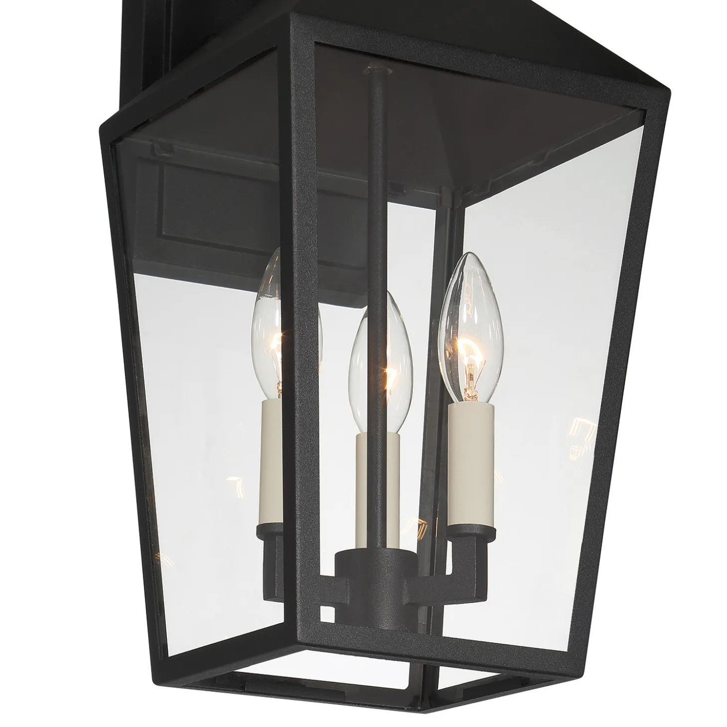 • Outdoor wall-mounted light features three candelabra bulbs set in a classic lantern style metal and glass fixture and finished in matte black