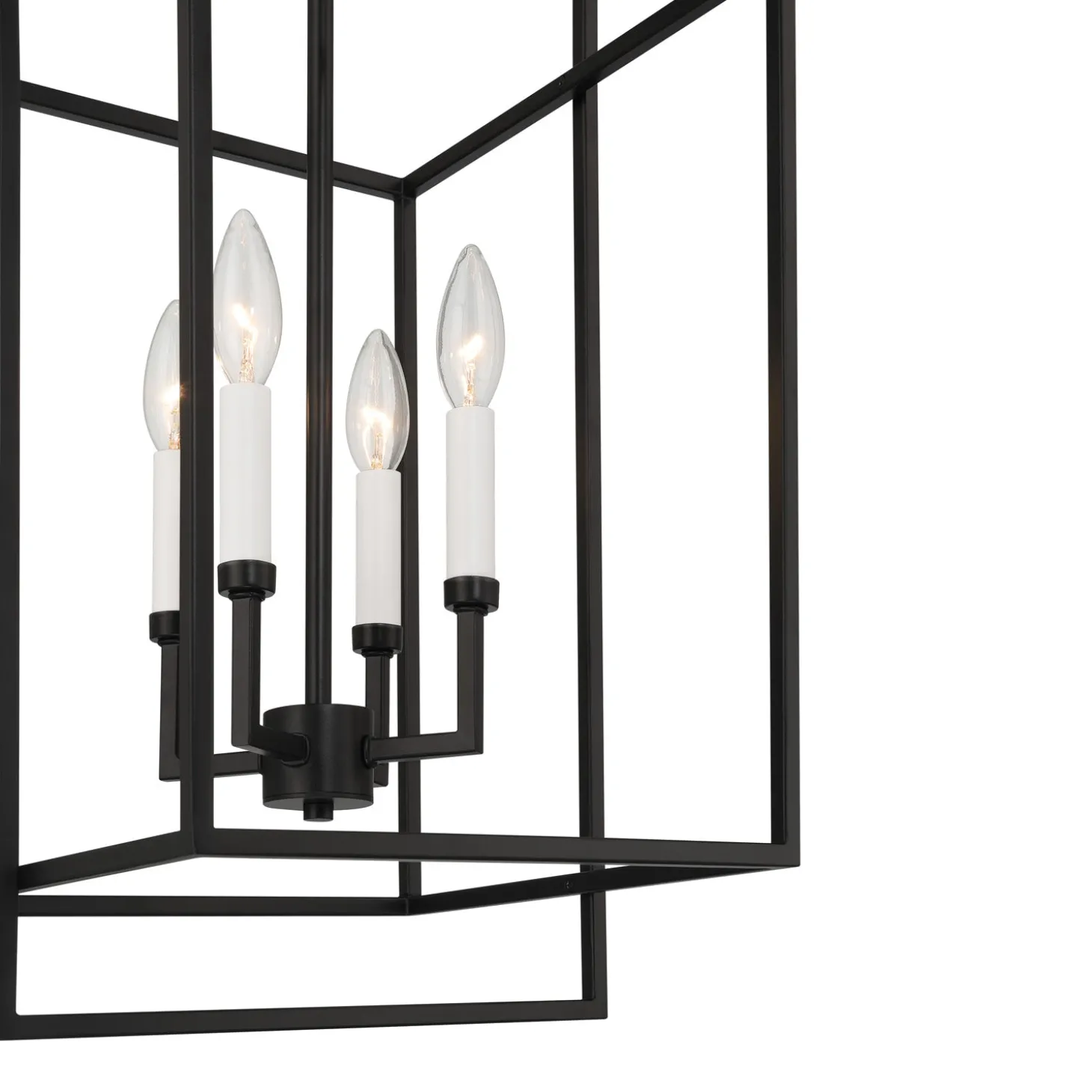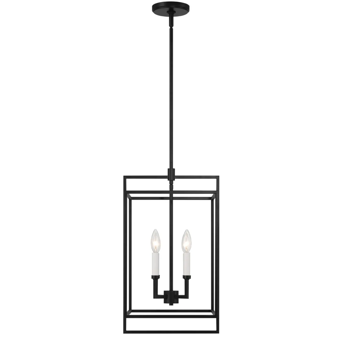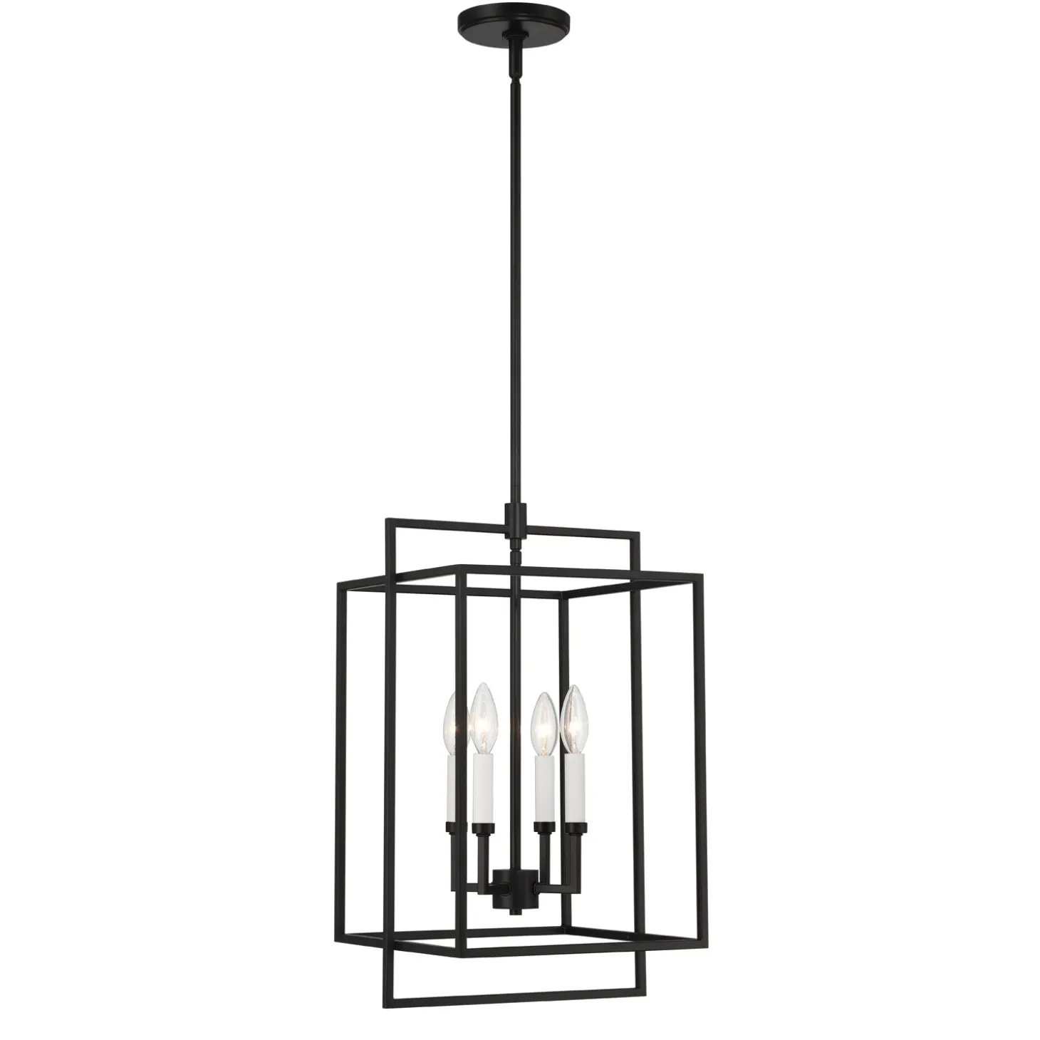 • Matte Black hanging pendant features four candelabra bulbs in an updated open frame lantern design, suspended by matching down rods
