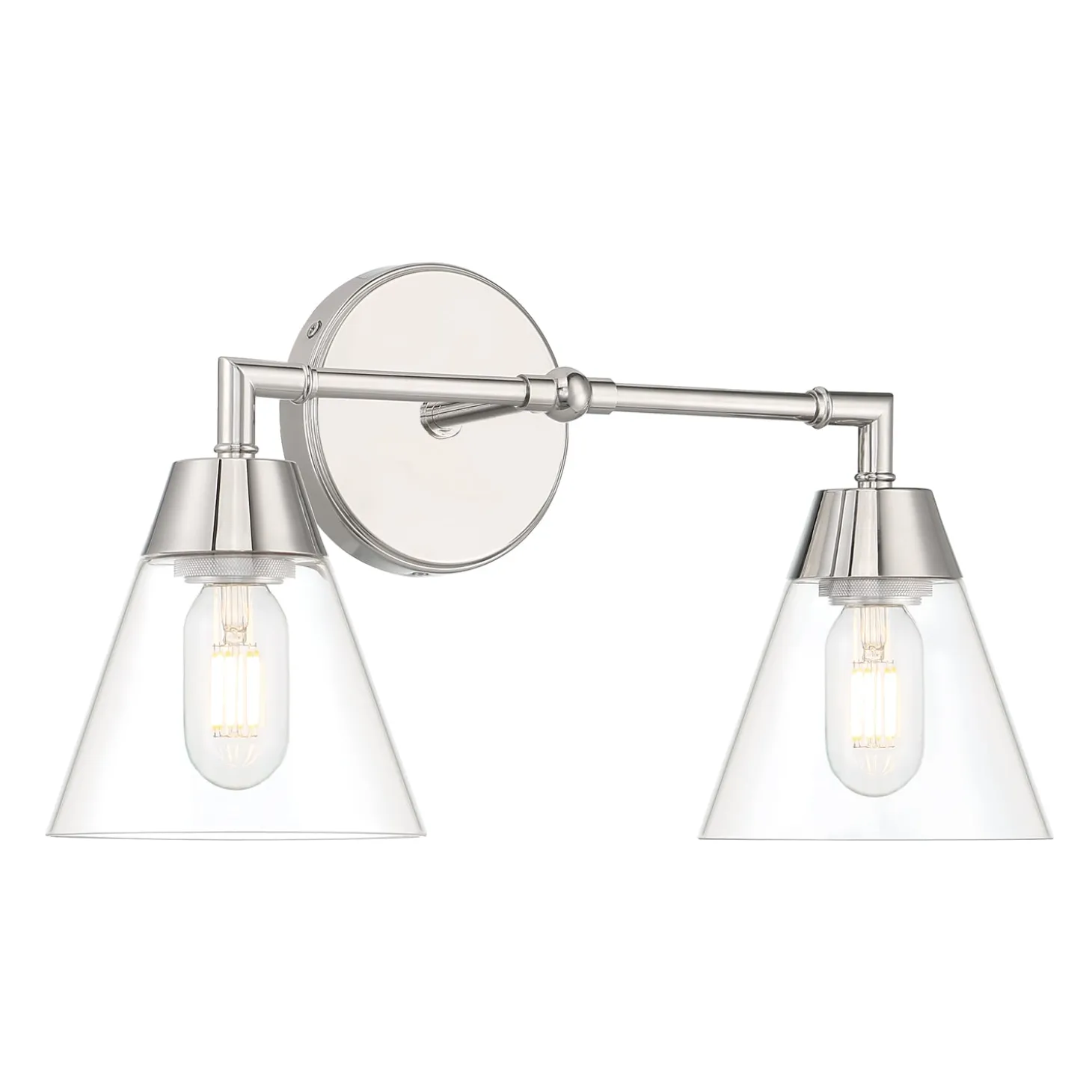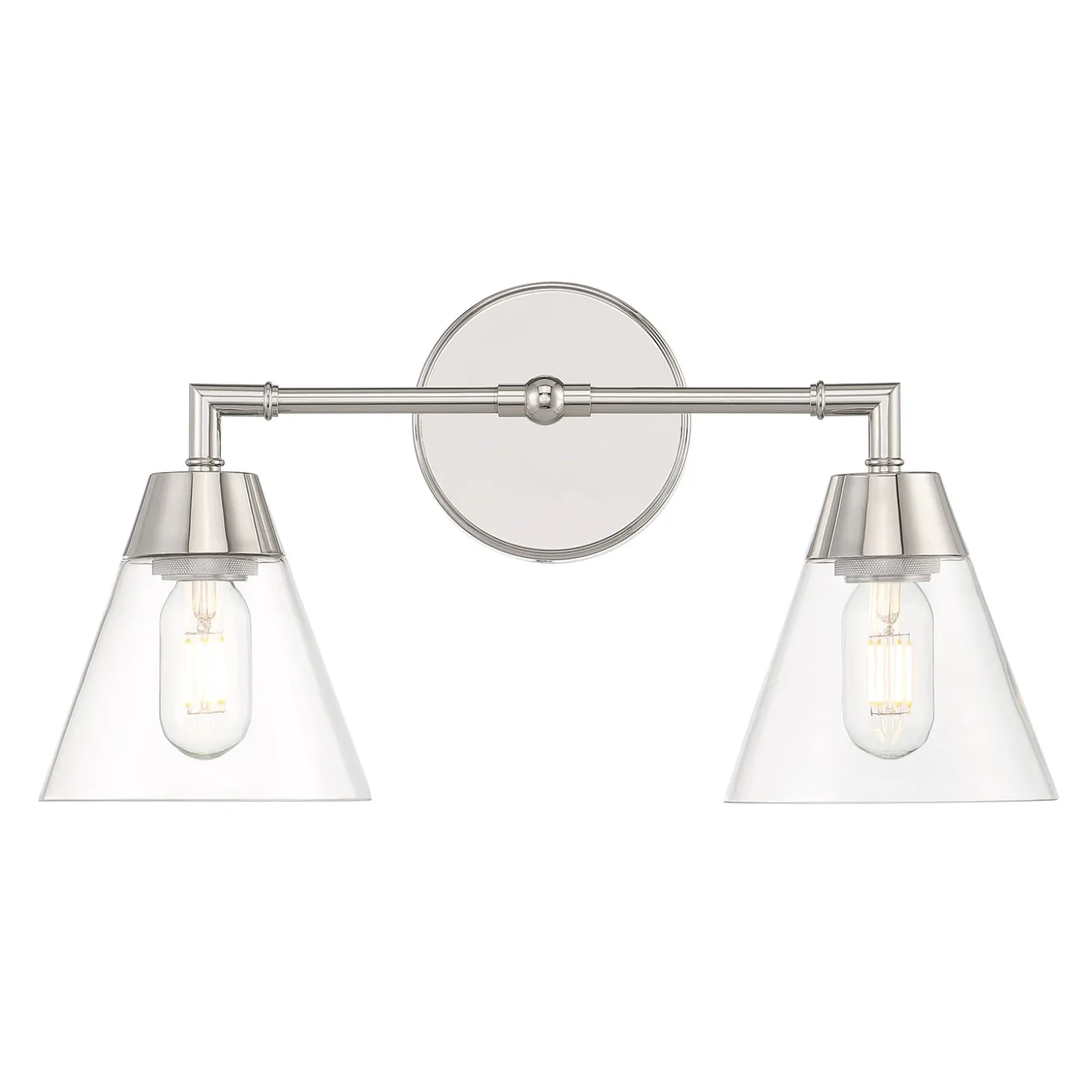 Inspired by industrial design with a touch of art-deco style, the Owen Vanity 2-Light Wall Sconce is a modern spin on a traditional silhouette. Featuring two tapered clear glass shades suspended by a gleaming polished nickel bar and backplate, this light fixture was designed especially for rooms with clean lines and lux accents. The Owen is perfectly at a place in modern or transitional settings.