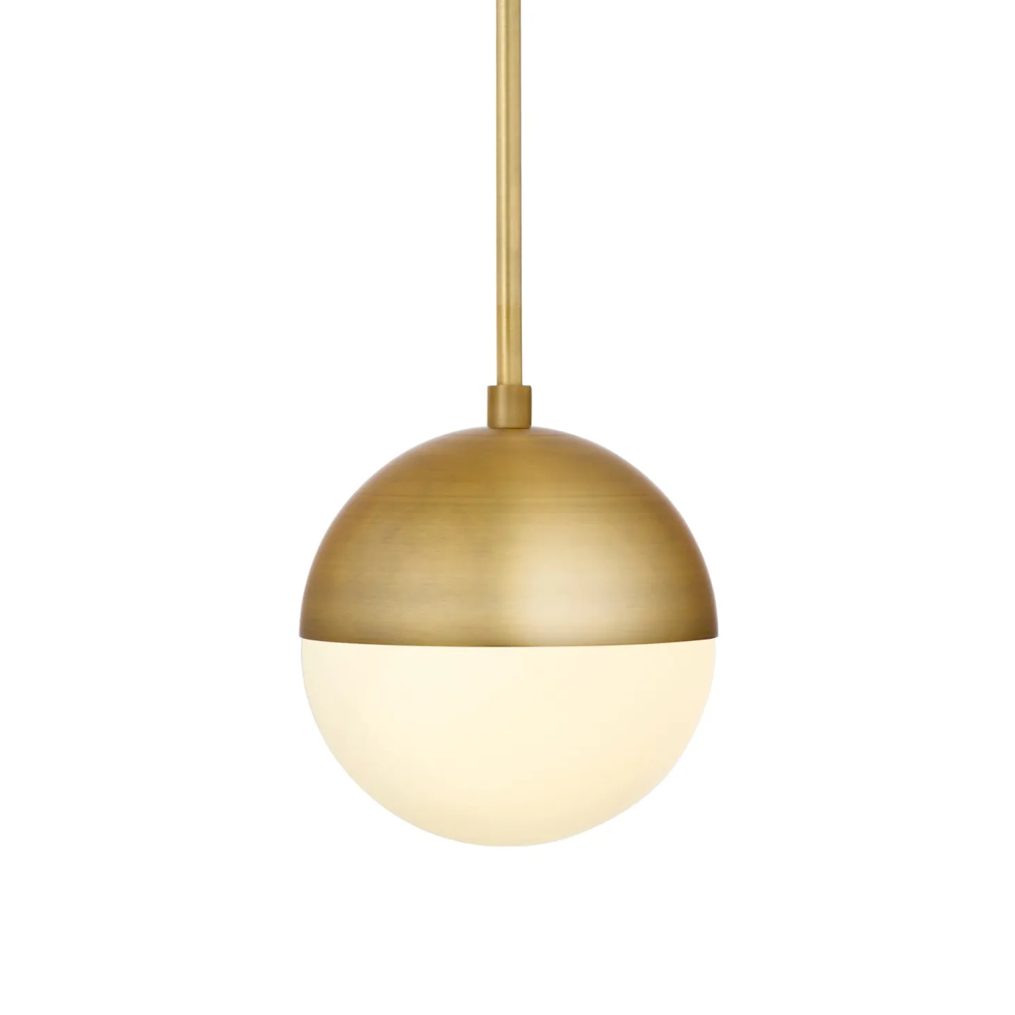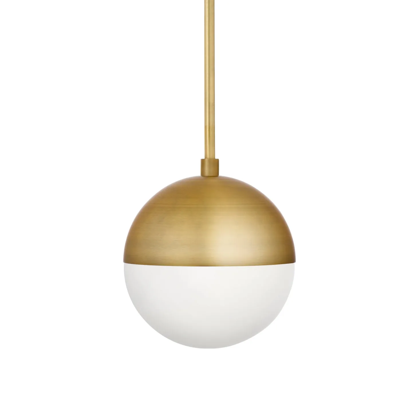 The Powell Pendant Light is a contemporary spin on a mid-century classic. Features a frosted, glass globe capped with a spun-metal hood that is suspended by an adjustable down rod and circular canopy – all in a warm, aged brass finish. Ideal in hallways with tall ceilings, above a small table, or paired up over a kitchen island.