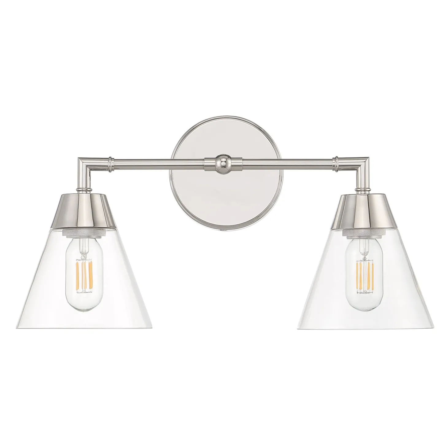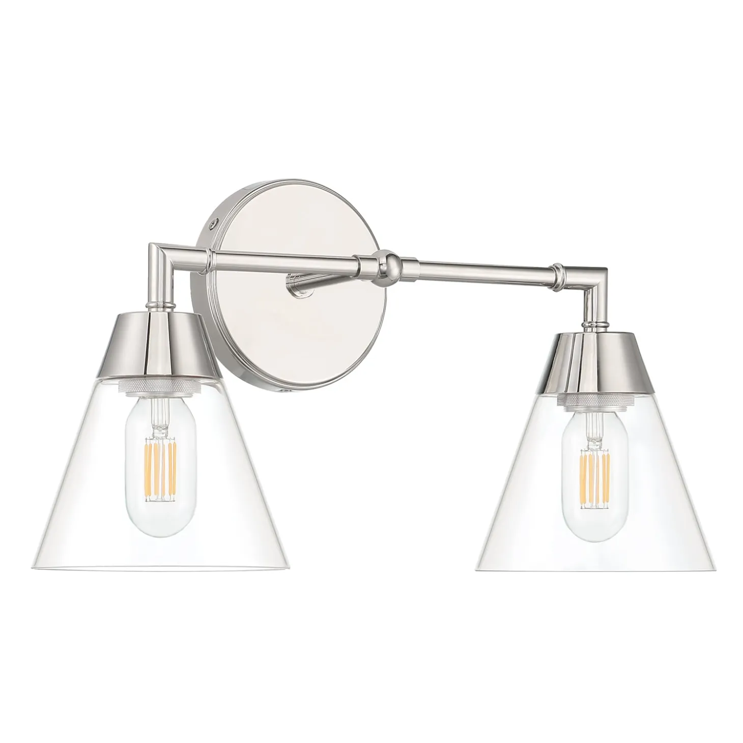 Inspired by industrial design with a touch of art-deco style, the Owen Vanity 2-Light Wall Sconce is a modern spin on a traditional silhouette. Featuring two tapered clear glass shades suspended by a gleaming polished nickel bar and backplate, this light fixture was designed especially for rooms with clean lines and lux accents. The Owen is perfectly at a place in modern or transitional settings.