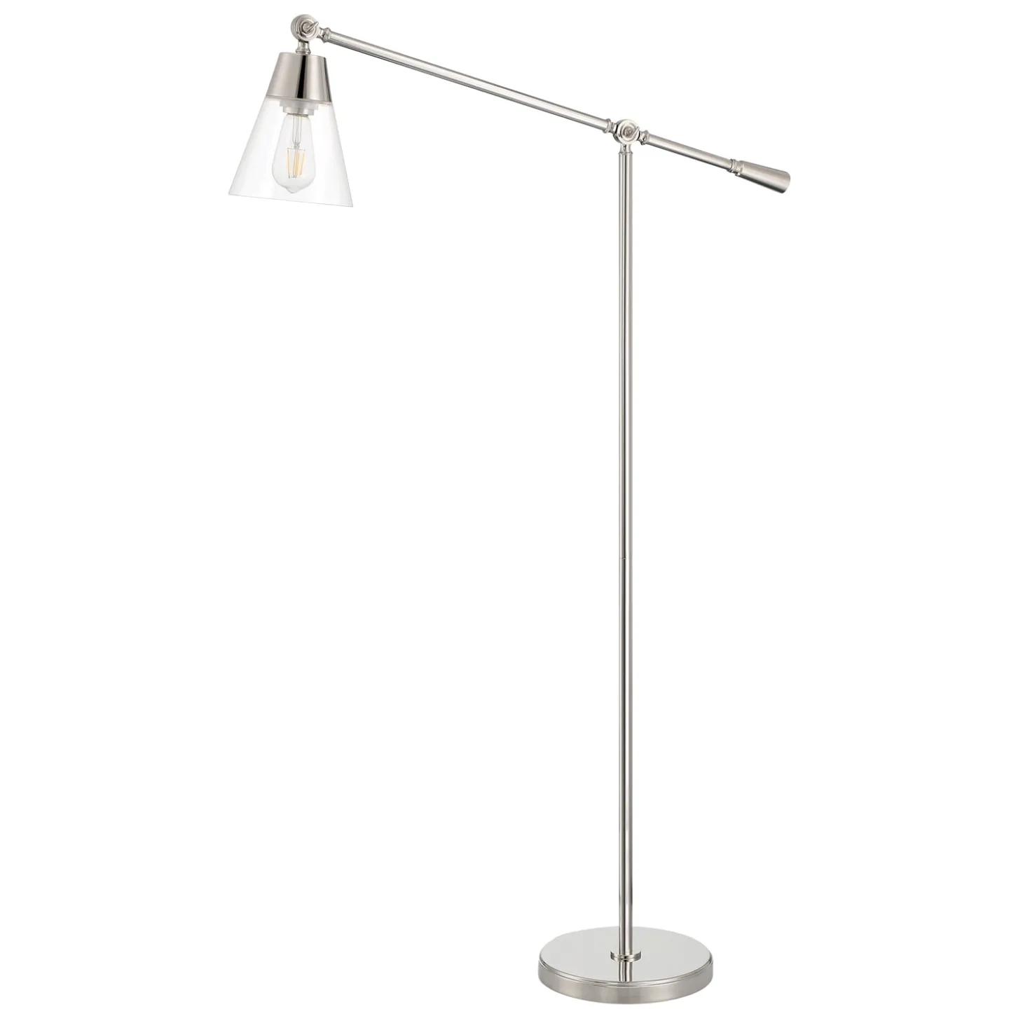 The Owen Floor Lamp offers an elegant, modern approach with a distinct vintage style. A classic balance of modern farmhouse and industrial aesthetics and finished in gleaming polished nickel, this standing lamp balances versatility with an updated, bold style. The Owen is built with classic, lux materials and details; including masterly finished metal surfaces, crystal-clear tapered glass shades and a subtle black fabric cord. The details are updated and remarkable, movable arms and decorative keys at each joint allow for precision adjustment, embellishments along the arms and counterweight, and a smart on/off switch located on the power cord. The Owen is functional and striking, a perfect addition to chic homes or fashionable office spaces. This stylish lamp is a practical option for task lighting in your work-from-home refuge, or as a reading lamp next to your favorite recliner.