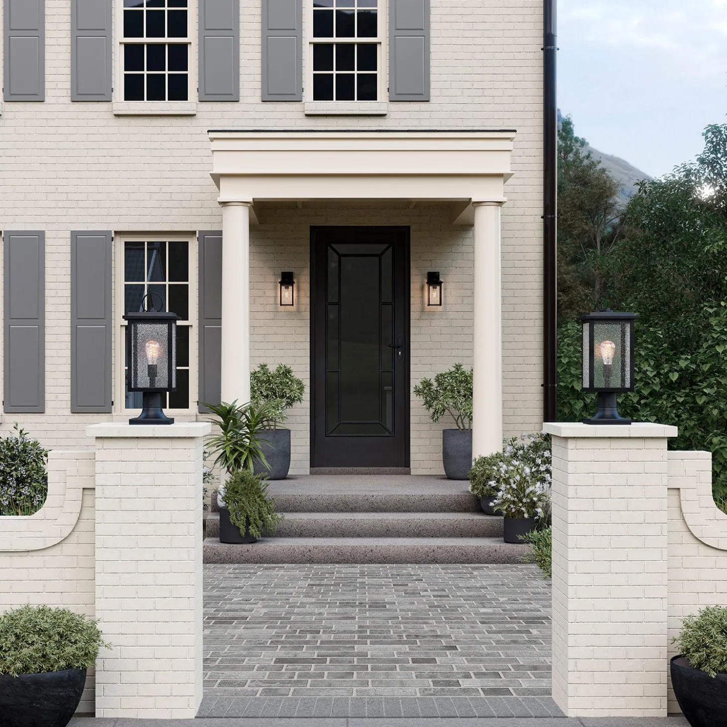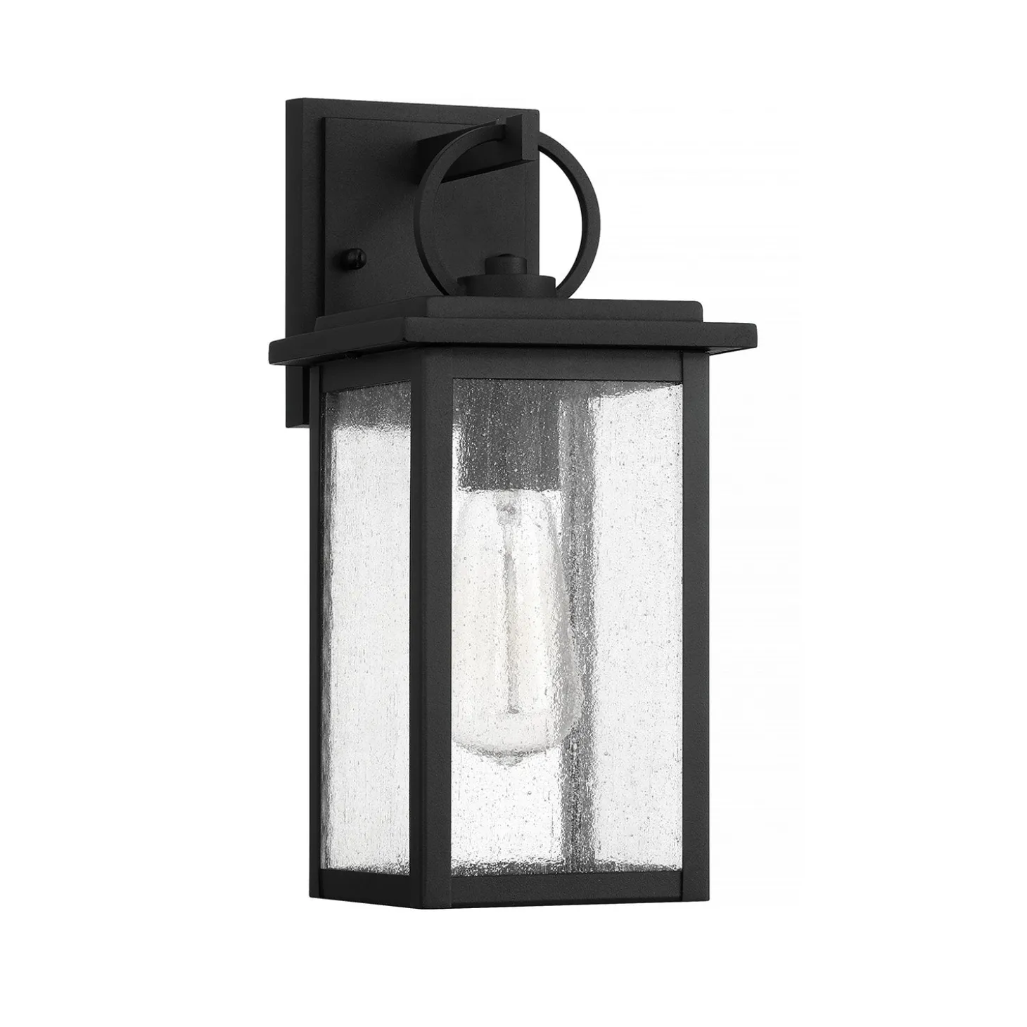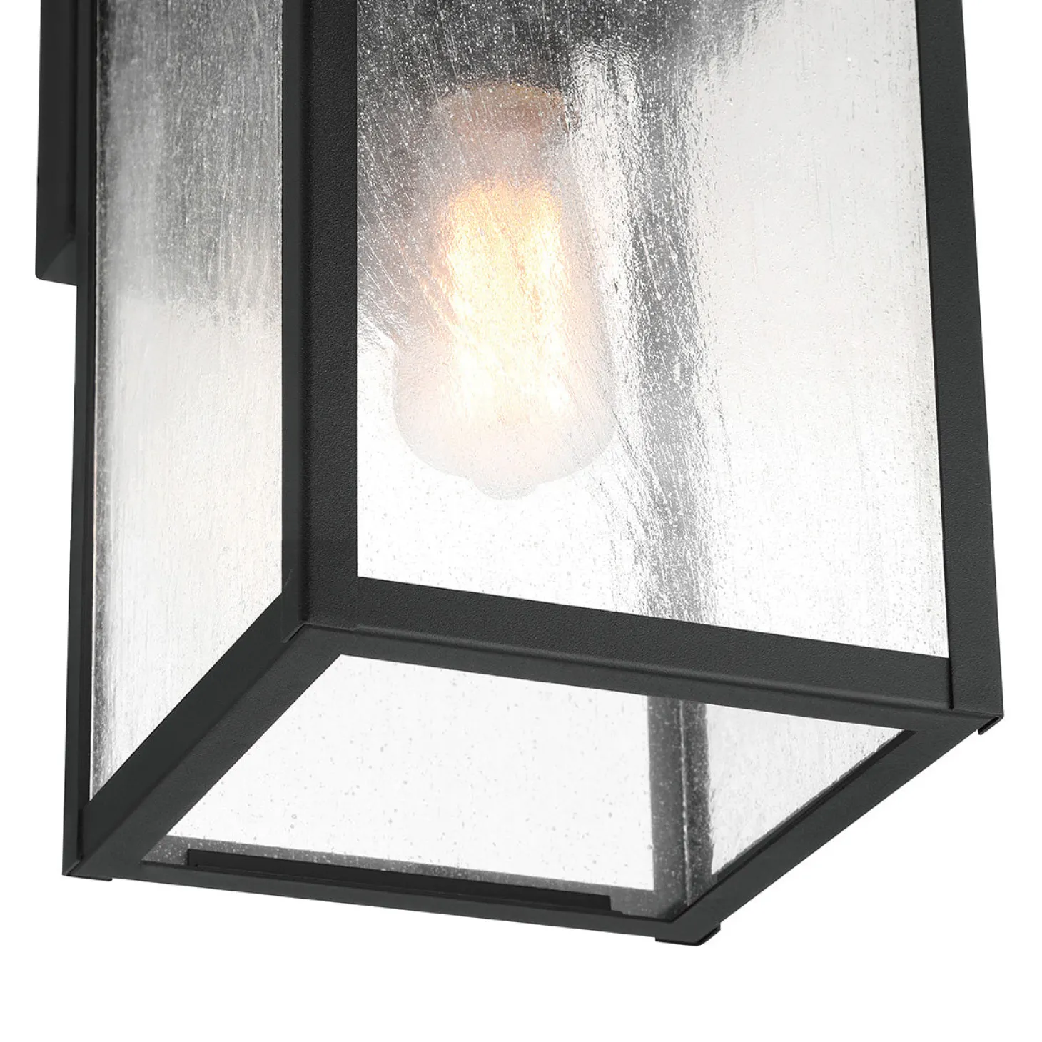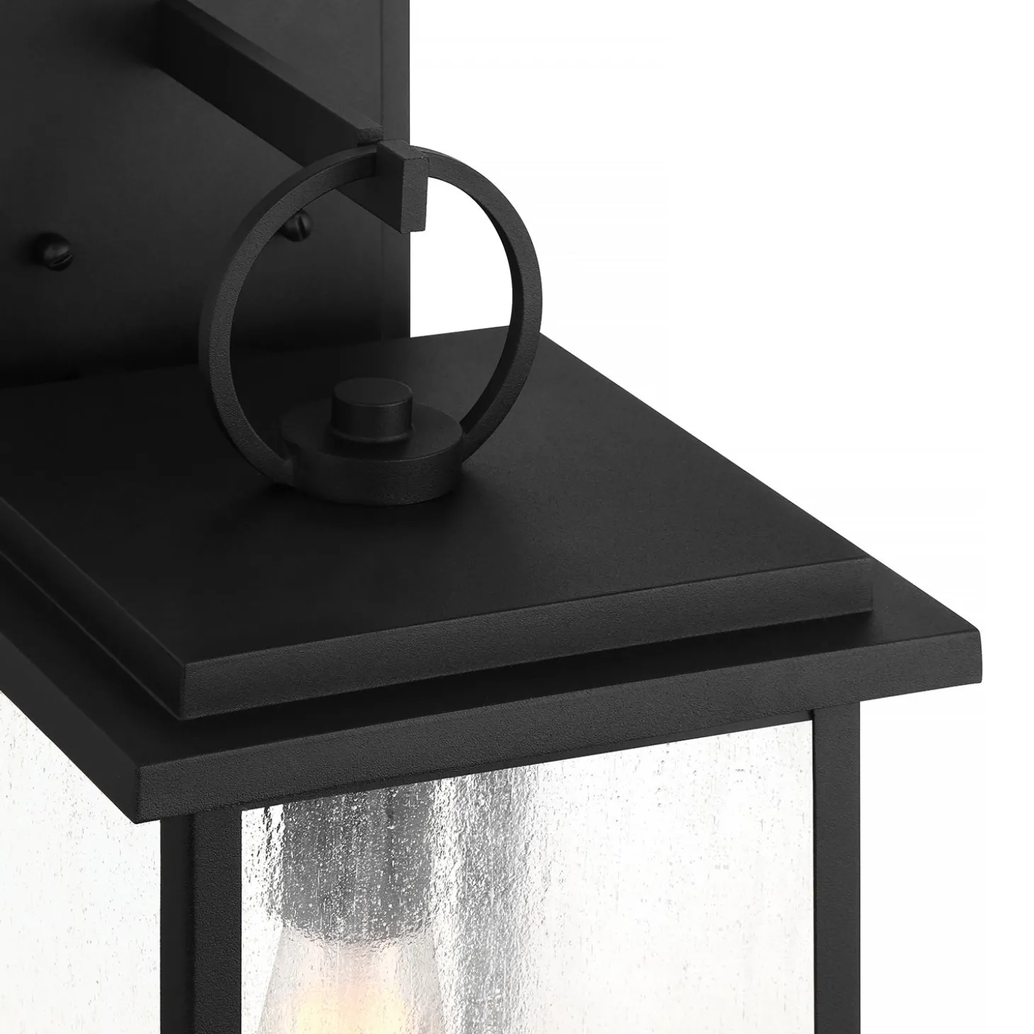 The Paterson Outdoor Small Wall Light is a timeless and classic lighting design with a modern sensibility. A rectangular mission-inspired silhouette reveals simple lines that seamlessly frame clear, seeded glass side panels and a single E26 bulb. A round hanging ring tops off the canopy and suspends the wall sconce from its backplate. This sturdy outdoor light is designed to withstand the elements complete with a textured matte black, powder-coated finish, and is wet-rated. Perfect for illuminating an entryway, lighting a patio, or in pairs flanking garage doors, this 13″ outdoor wall light is part of the larger Paterson outdoor lighting collection, including post and hanging lights to complete your exterior lighting project.
