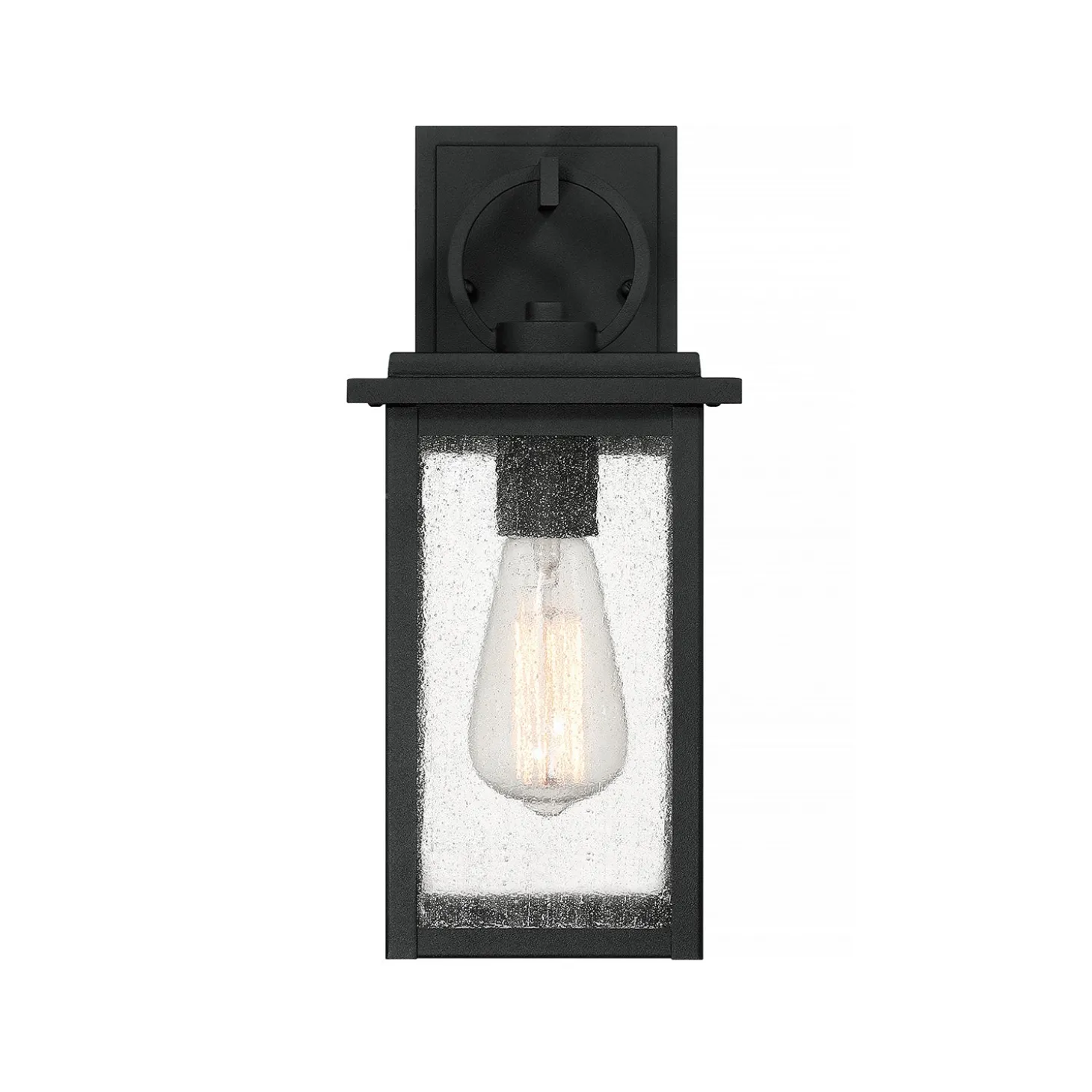 • Outdoor 13″ wall-mounted light features a single bulb set in a classic mission-style metal and seeded glass fixture and finished in textured matte black