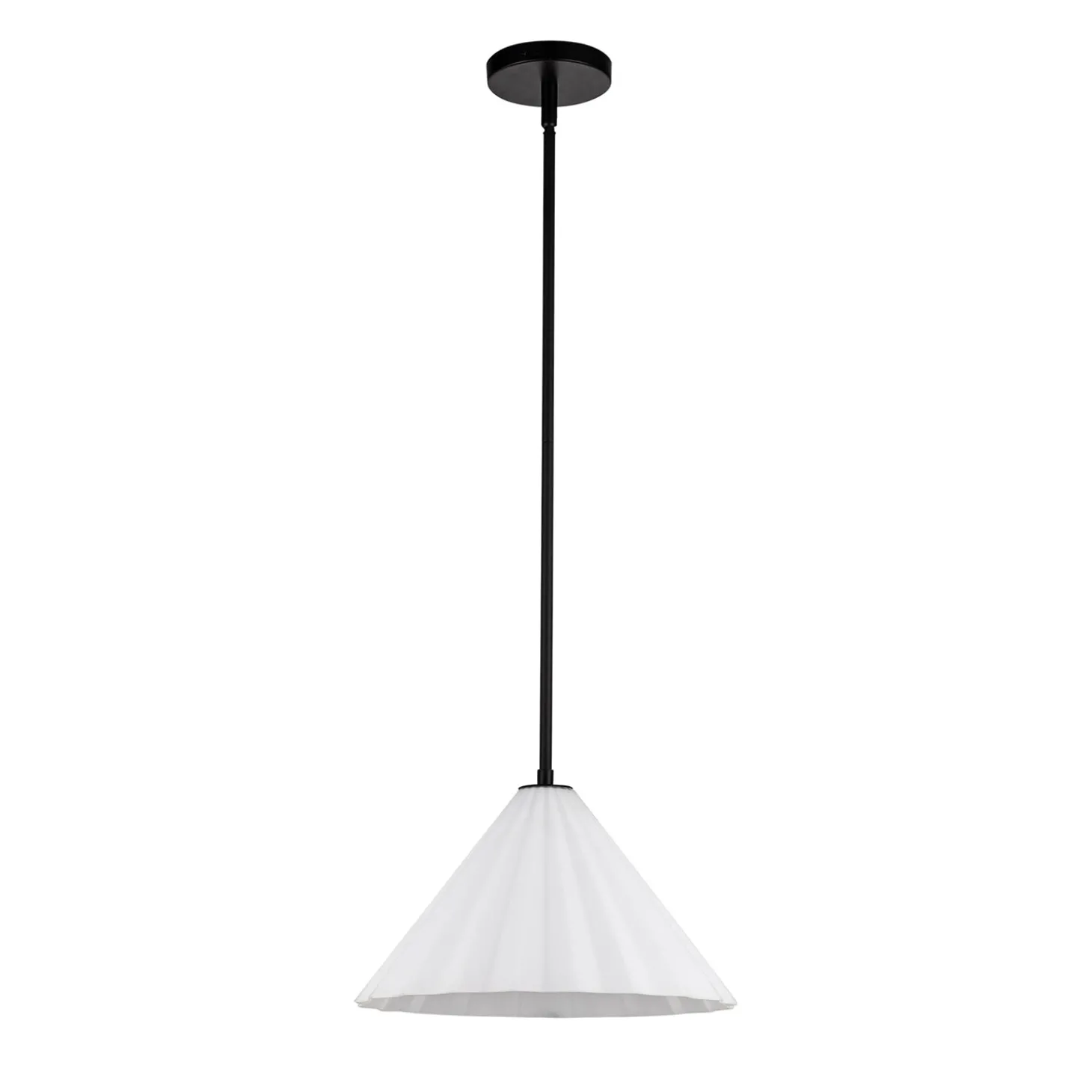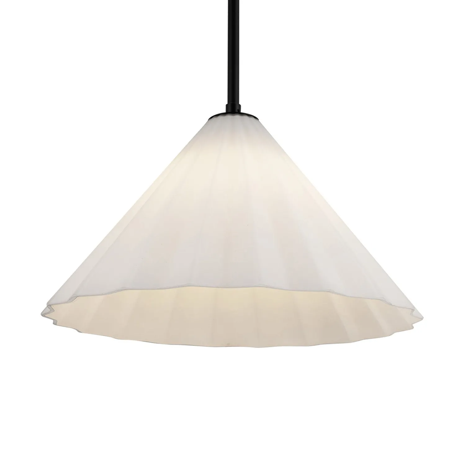 The Reese Pendant features a minimalist design with a sleek matte black rod supporting a gracefully pleated conical shade of opal glass. This elegant ceiling light combines simplicity and sophistication through its clean lines and warm metallic finish. Measuring 14″ in diameter, the Reese creates soft, diffused illumination that is ideal for dining areas, kitchen islands, or entryways. The classic cone-shaped shade brings a timeless quality to the fixture, while the gentle texture of the opal glass adds depth and visual interest when illuminated.