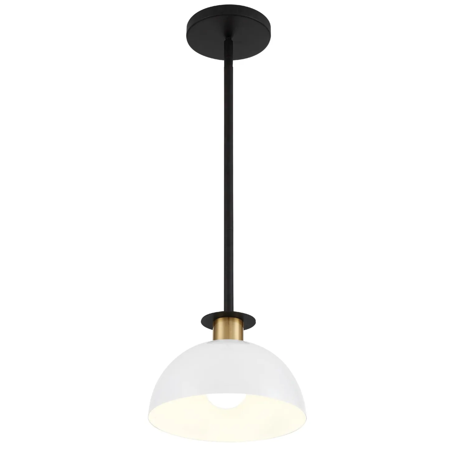 The Remy Pendant features a minimalist design with a Matte Black rod and an Aged Brass accent that elegantly supports a smooth white dome shade. This versatile fixture measures 7″ tall and 10″ in diameter, making it perfect for smaller kitchen islands, dining areas, or entryways. The clean lines and two-tone finish create a modern aesthetic that complements various interior styles, from mid-century to contemporary. The pendant includes multiple down rods and a sloped-ceiling adapter for adjustable hanging height, allowing you to customize the fixture to your space. Damp-rated for use in bathrooms or covered outdoor areas, the Remy adds both style and functionality to your home.