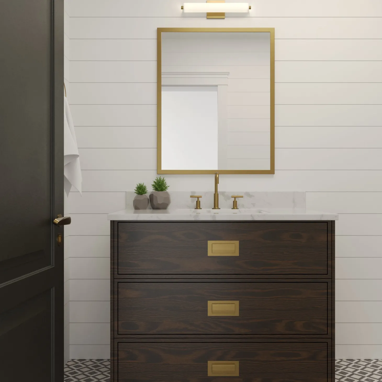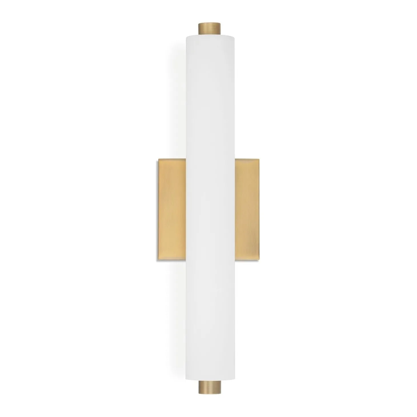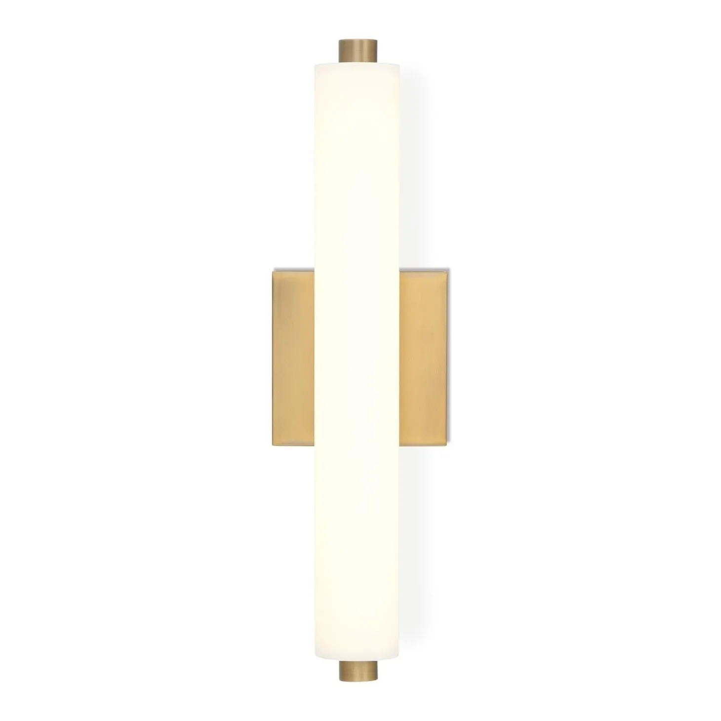 The Ronan LED Vanity Light features a clean and contemporary design, paired with exceptional functionality. This 18” LED bath bar provides long-lasting illumination with an opal glass shade that produces a soft, diffused light that prevents glare and harshness. The Ronan features smooth dimming capabilities and can be mounted horizontally or vertically, making it ideal for use in a bathroom above a vanity or as wall sconces flanking a mirror. This tube-shaped wall light is finished with an aged brass backplate and end caps, making a beautiful statement in contemporary and modern bathrooms. The Ronan Collection is ADA compliant, and currently available in three finishes for the 18” size, and two finishes for the 24” size.