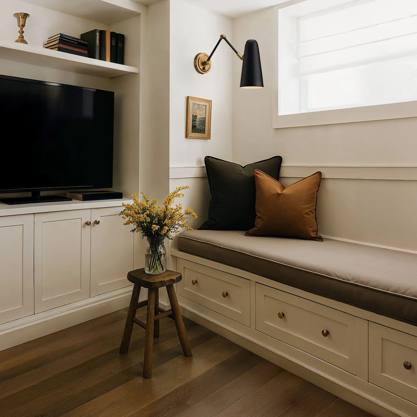 The Roy Articulating Wall Sconce features a classic mid-century-modern inspired design with a sleek Matte Black tapered cylindrical shade mounted on an adjustable arm with Antique Brass accents. This functional wall light showcases mixed-metal styling with a circular brass backplate and pivoting joints that allow you to direct light exactly where it is needed. Extending up to 23.15″ from the wall, the Roy provides focused task lighting that’s perfect for bedside reading, home offices, or as accent lighting in living spaces. The adjustable arm and swiveling shade offer exceptional versatility, while the two-tone black and brass finish brings a sophisticated contemporary aesthetic to any room.