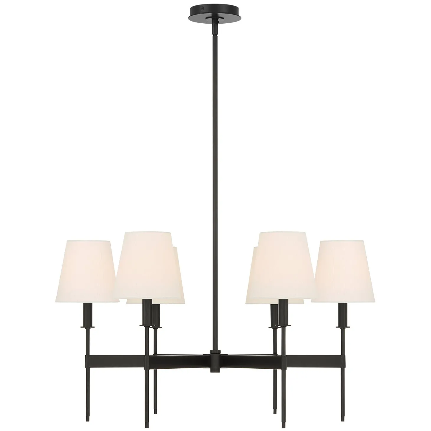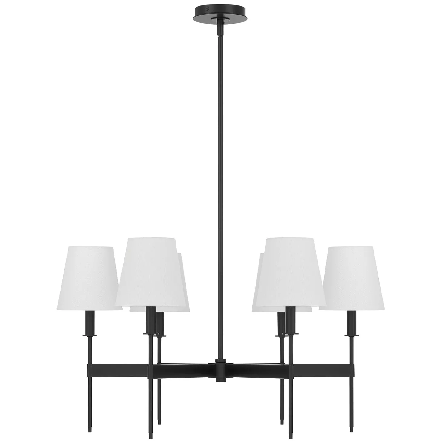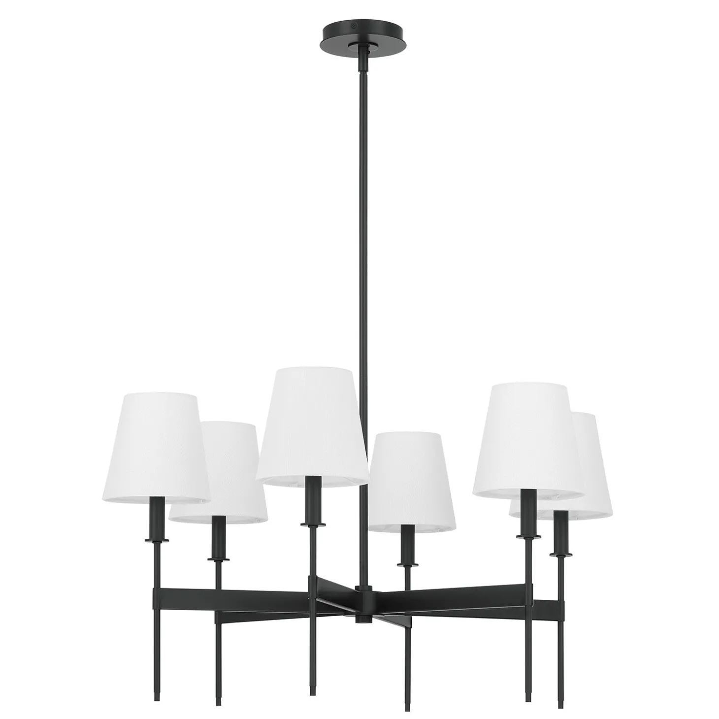 The Taylor 6 Light Chandelier brings a touch of classic elegance to any space. Six rectangular arms radiate from a central hub, each ending with a beautifully refined stem holding a white fabric shade. This beautiful ceiling light is suspended from a round canopy and adjustable metal down rods and features a swivel adaptor built in for easy installation in any home. The matte black finish beautifully contrasts with the white fabric shades, embodying a sophisticated and timeless design aesthetic. The Taylor chandelier is 30” in diameter and dimmable, perfect for creating a cozy dining room, bedroom, or welcoming entryway. With two finish options and a matching wall sconce style, the Taylor Collection makes a wonderful impression in any home.