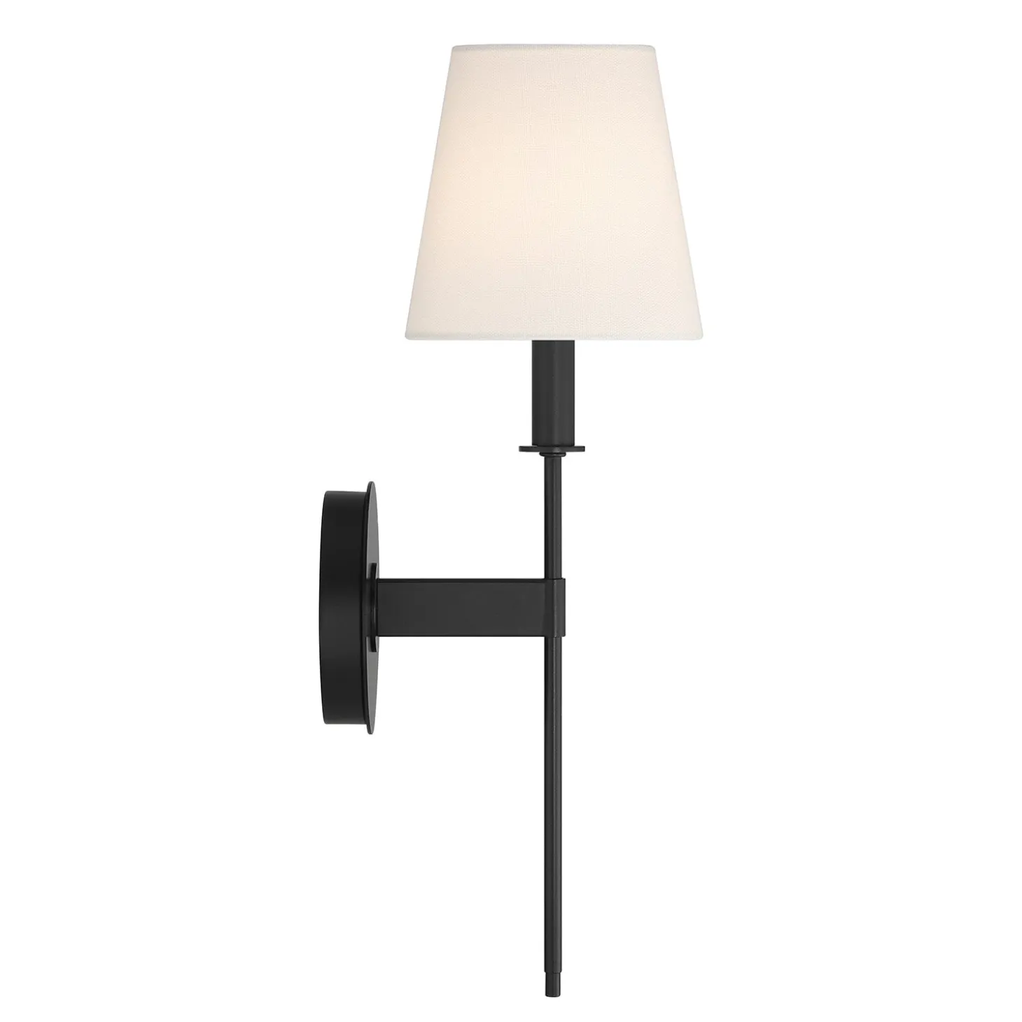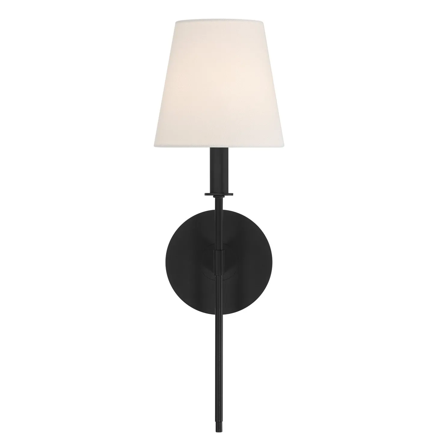 • The Taylor Wall Sconce features a classic and elegant design, with a round backplate, rectangular arm, and refined vertical stem topped with a white fabric shade