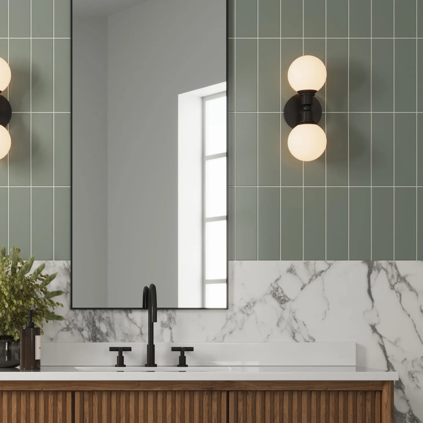 The Theo 2 Globe Wall Sconce is an elevated take on a mid-century-modern classic. Features two opal glass globes, accented by art-deco inspired shapes and elegantly suspended by a round backplate – all in a matte black finish. Standing at 13.75” tall, this versatile wall light can be mounted vertically or horizontally, or even on the ceiling as a semi-flush mount. Ideal in pairs, this dimmable modern wall light adds ambient, yet direct lighting by flanking a fireplace, welcoming you home in your foyer, or as vanity lights next to or above your bathroom mirror. Stylish in a variety of homes, Theo both compliments vintage details, and adds visual interest in sleek modern spaces.