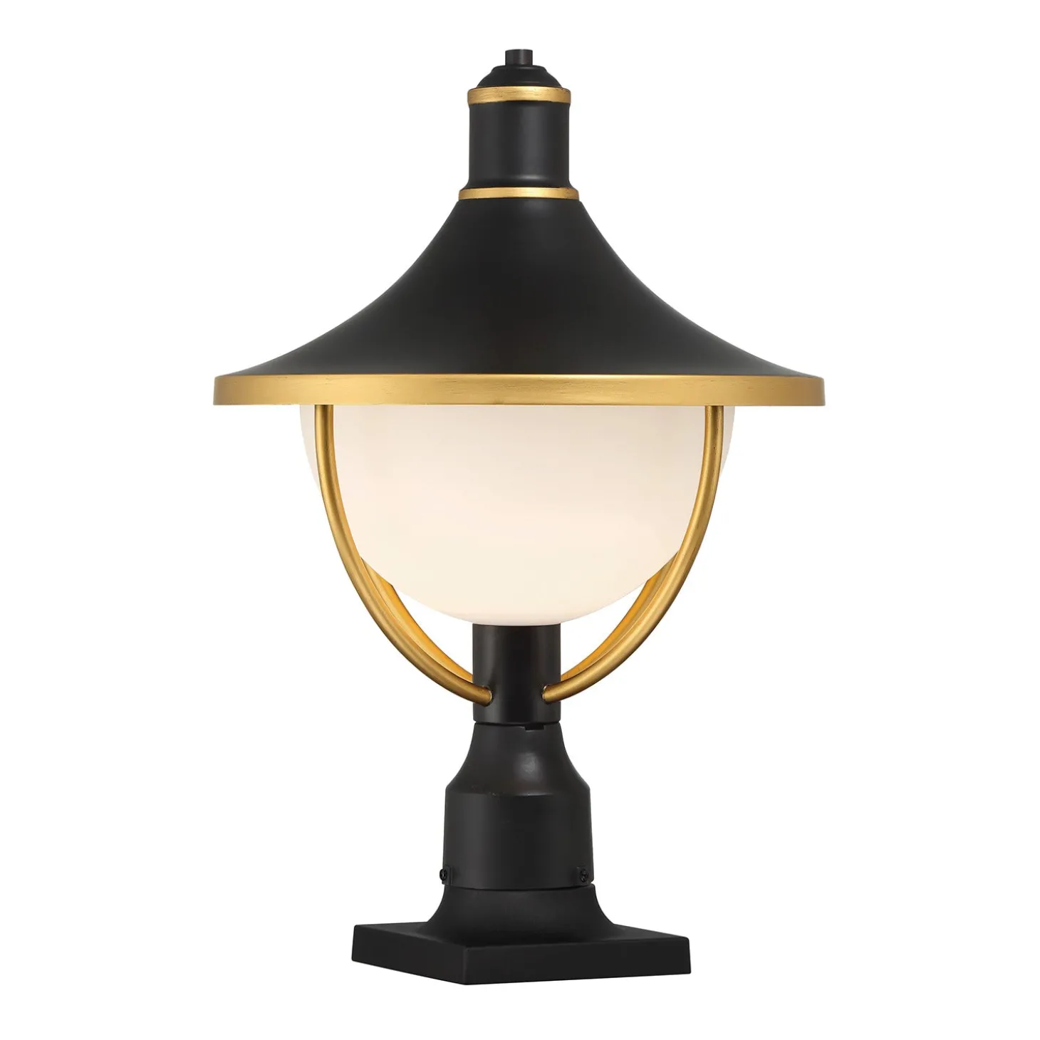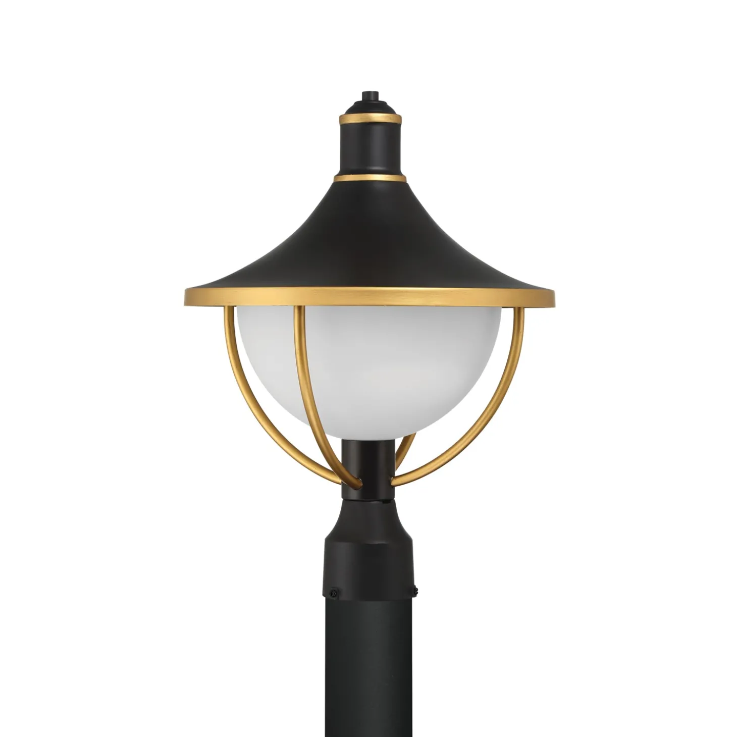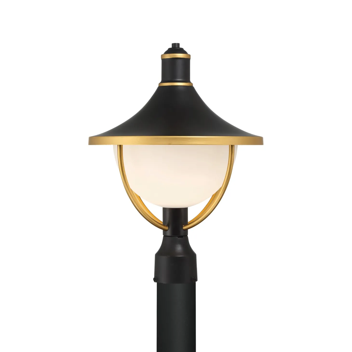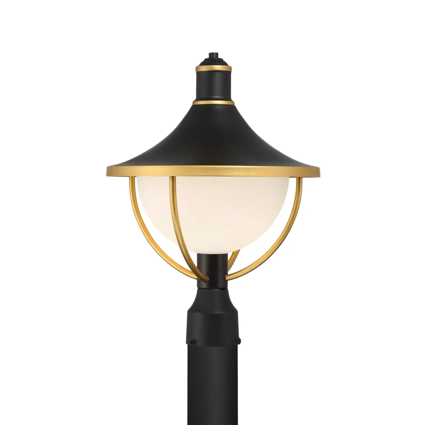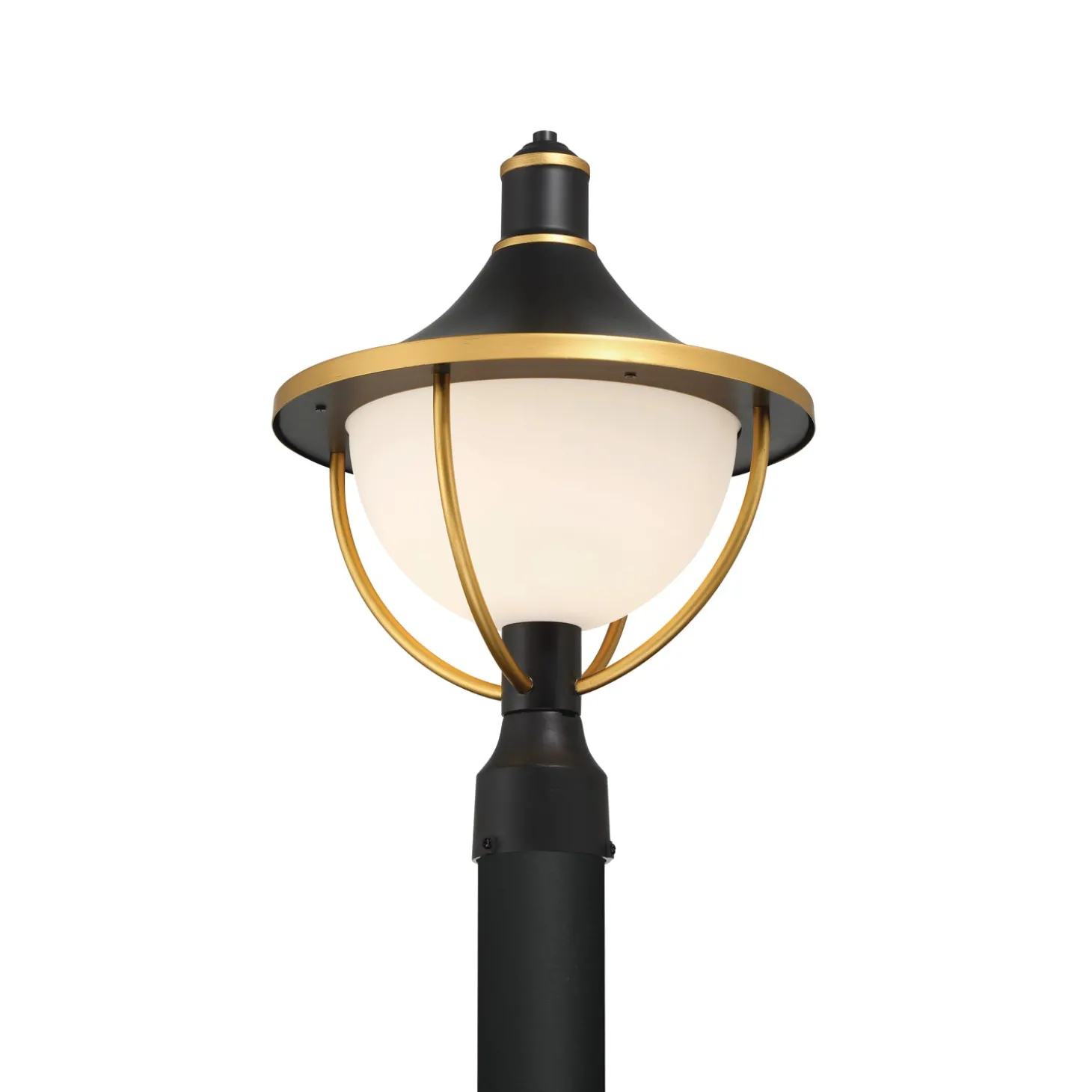 The Tobin Outdoor Post Light features a modern design with a two-tone finish of Matte Black and Textured Gold. The distinctive silhouette showcases elegant gold arcs that gracefully frame an opal glass bowl, creating a sophisticated lighting element for your home’s exterior. This medium post light measures 18.5″ tall and 13.5″ in diameter, making it perfect for illuminating driveways, walkways, or garden areas. The combination of sleek metal and smooth glass creates a contemporary aesthetic that complements various architectural styles. This versatile fixture can be mounted atop a round metal post; alternately, it can be mounted to other surfaces with a pier mount. Both mounting options are sold separately and come in matte black. Weather-resistant and wet-rated for outdoor use, the Tobin provides both functional illumination and decorative appeal.