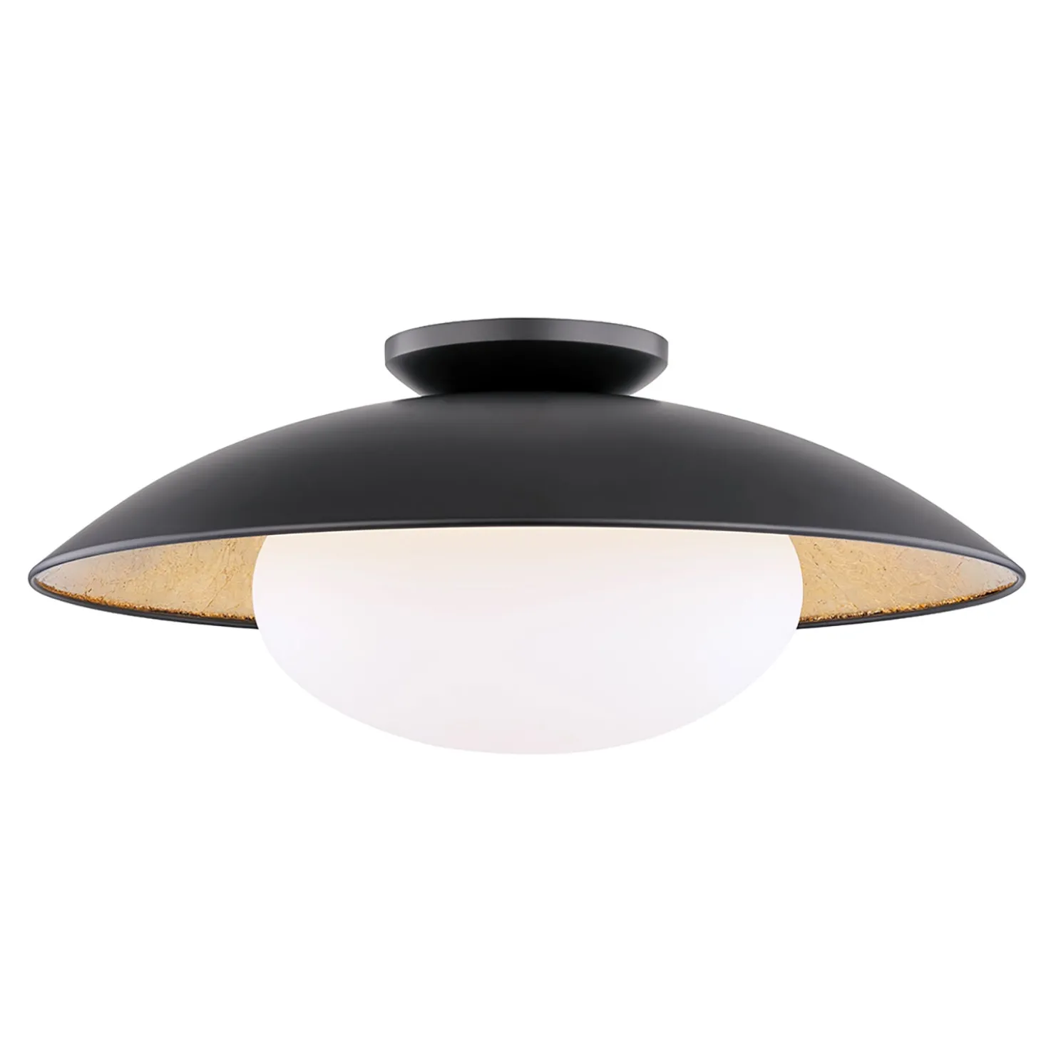 The Vera Flush Mount makes a bold statement with its striking design and luxurious details. The black 21″ diameter frame is beautifully complemented by a gold leaf interior, creating a sophisticated yet dramatic look, while the white opal matte glass diffuser softens the light, casting a warm, inviting glow. Perfect for living rooms, bedrooms, or entryways, this fixture adds refined style and a touch of glamour to any space. Vera comes in two finishes and two versatile sizes.