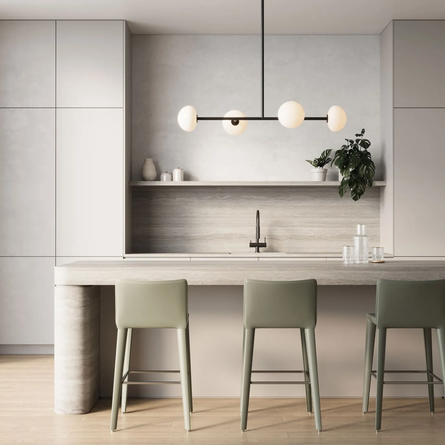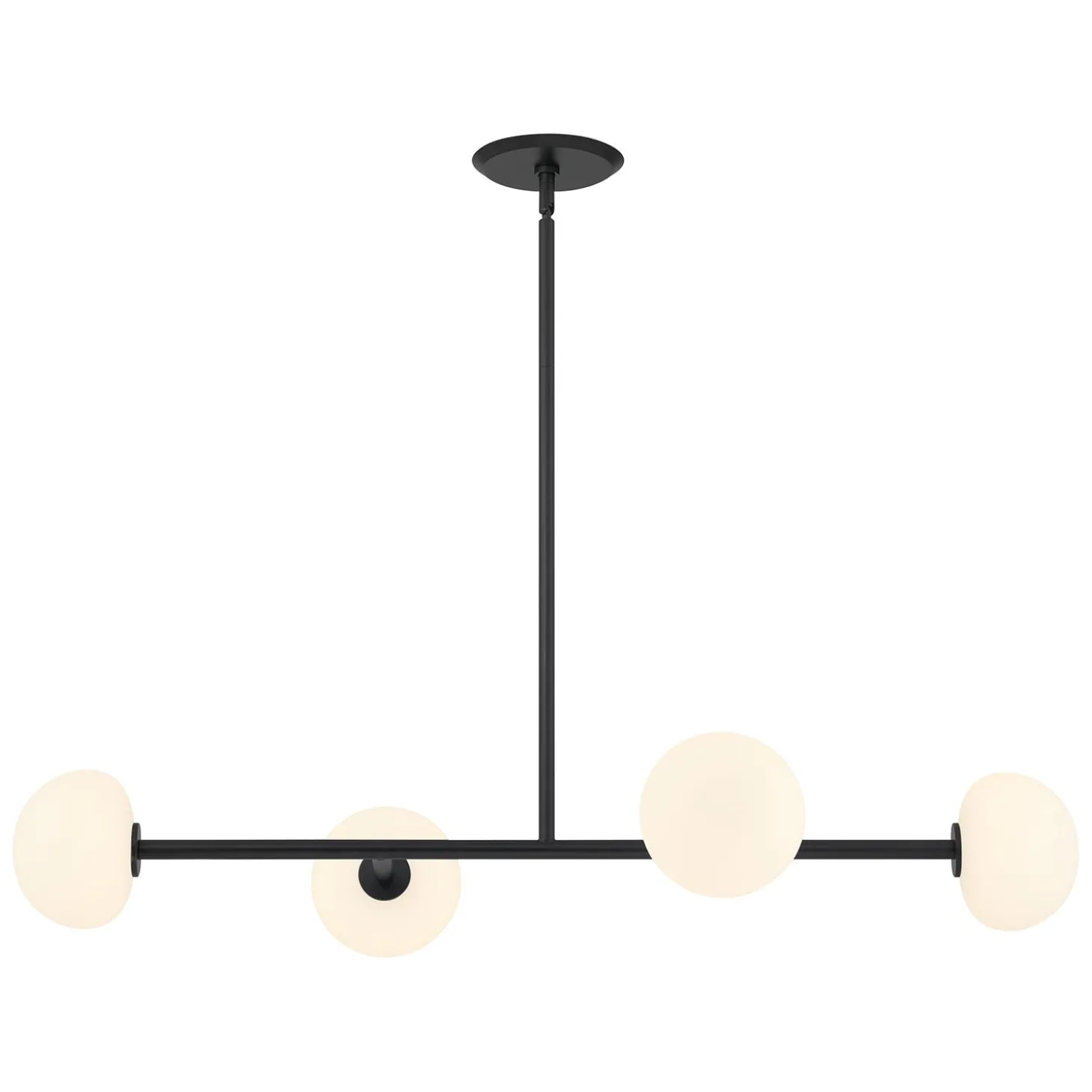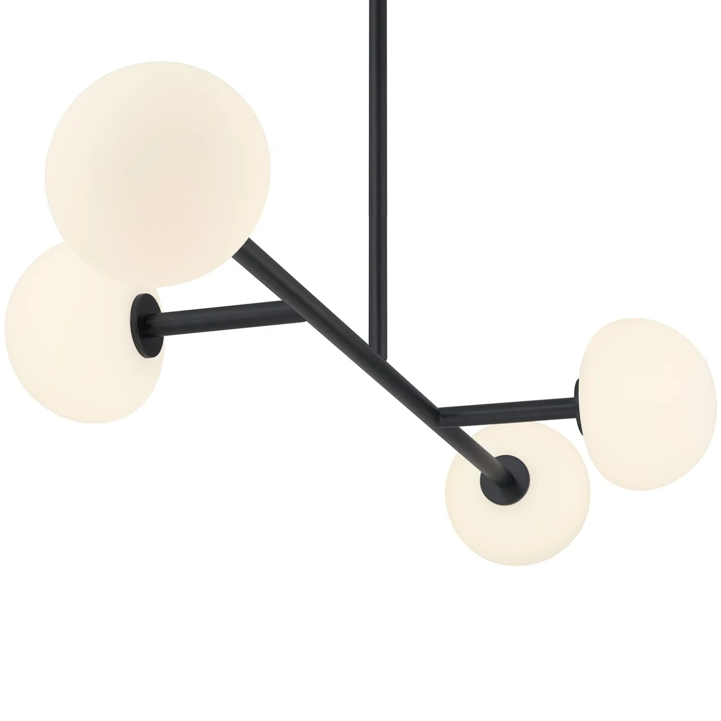 • Features four white opal glass orbs extending from a matte black linear bar, suspended by an elegant round canopy and matching down rods