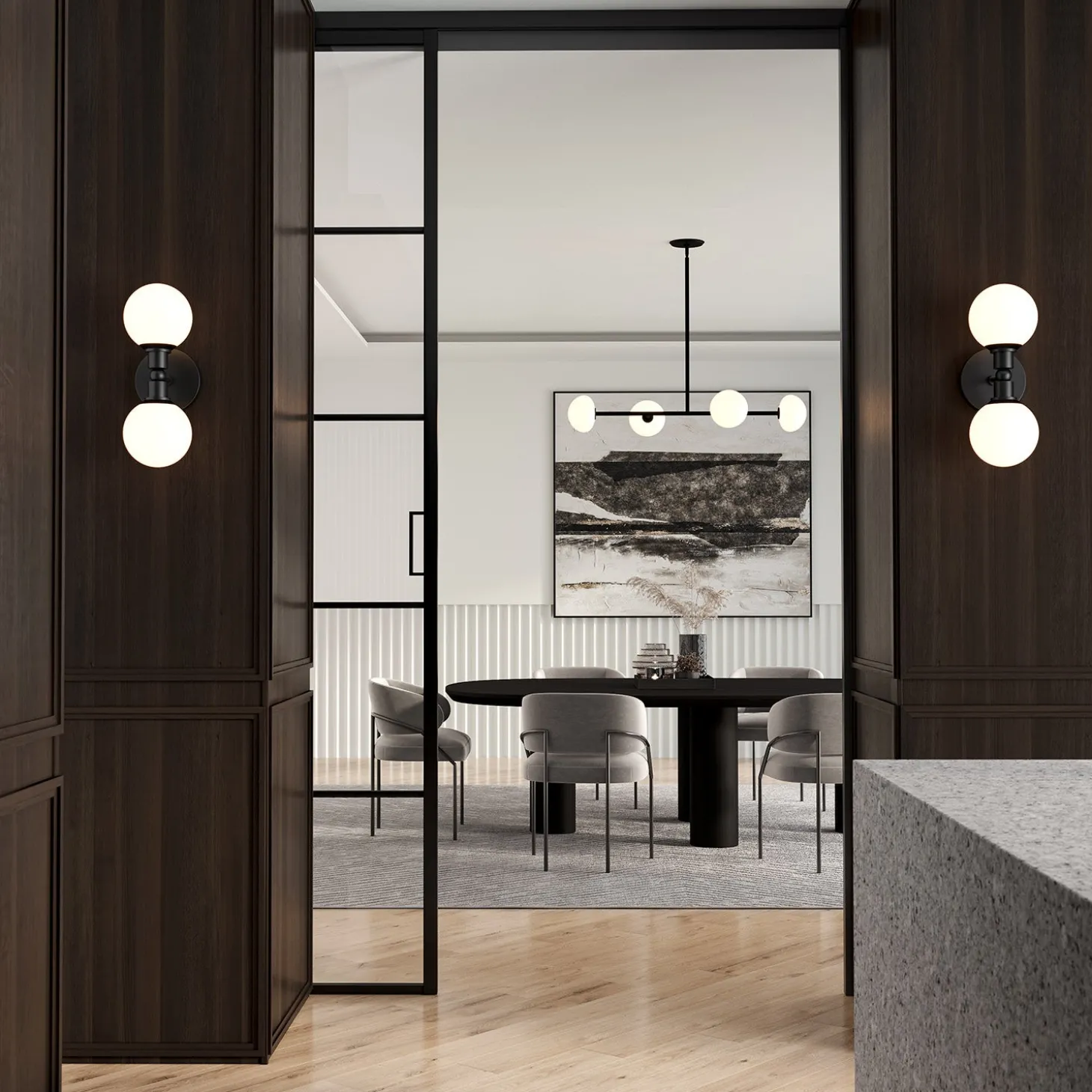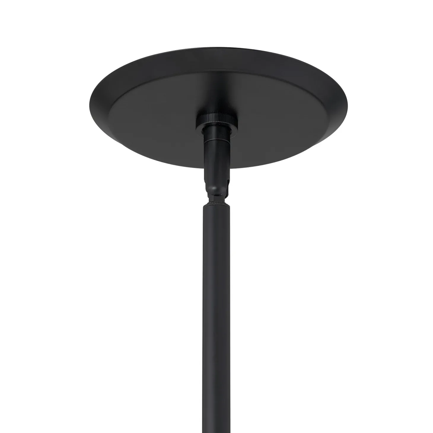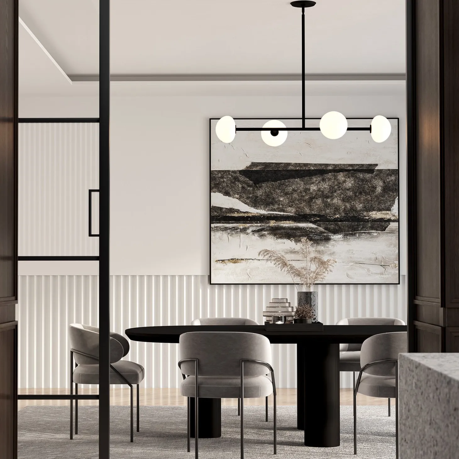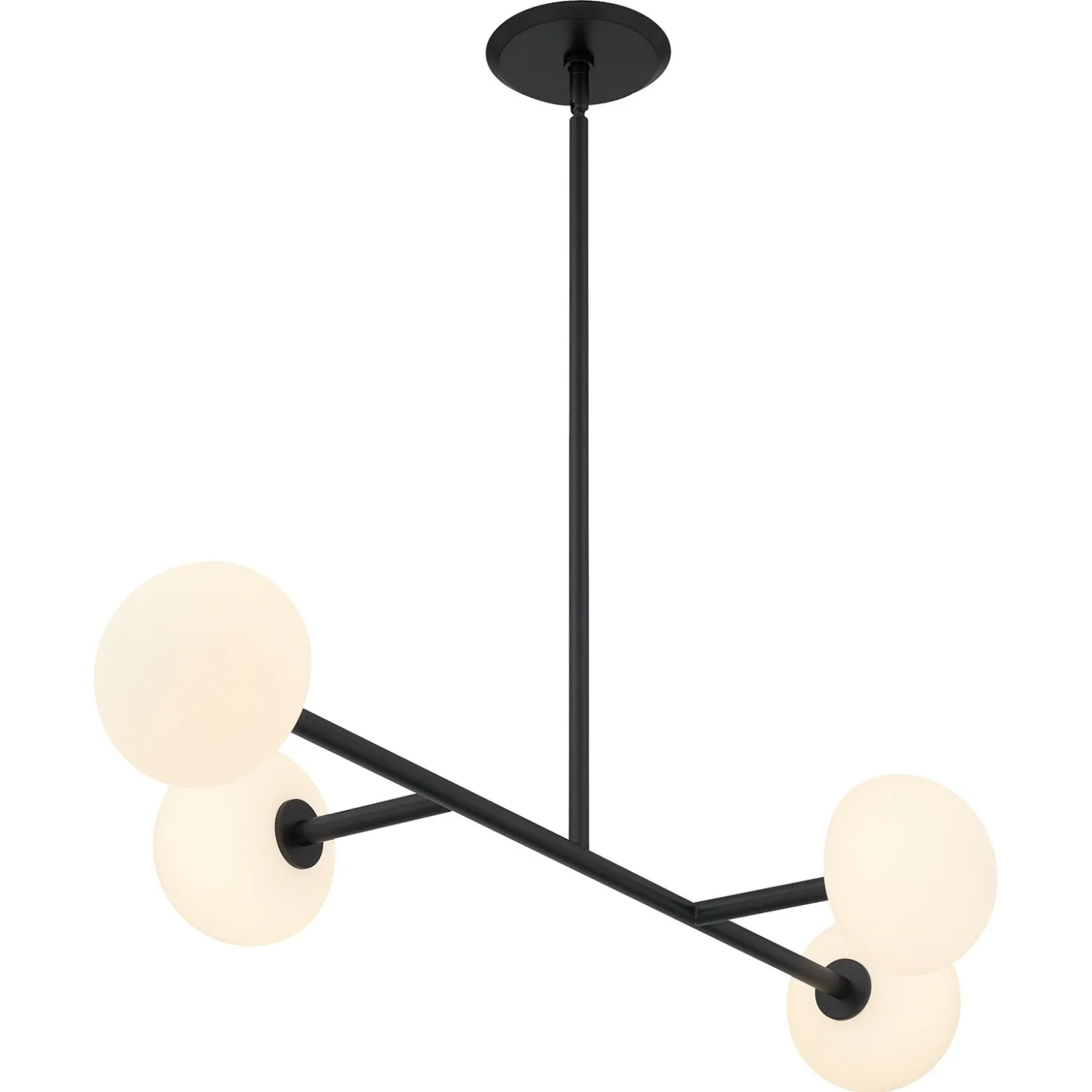 • Features four white opal glass orbs extending from a matte black linear bar, suspended by an elegant round canopy and matching down rods